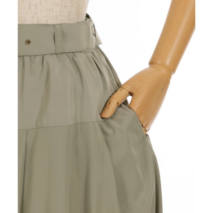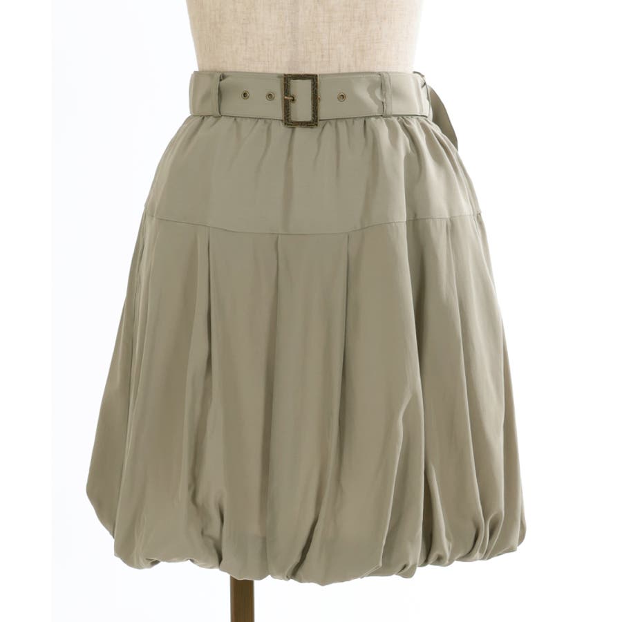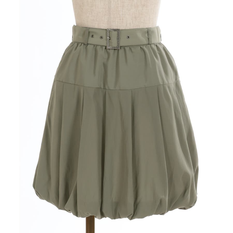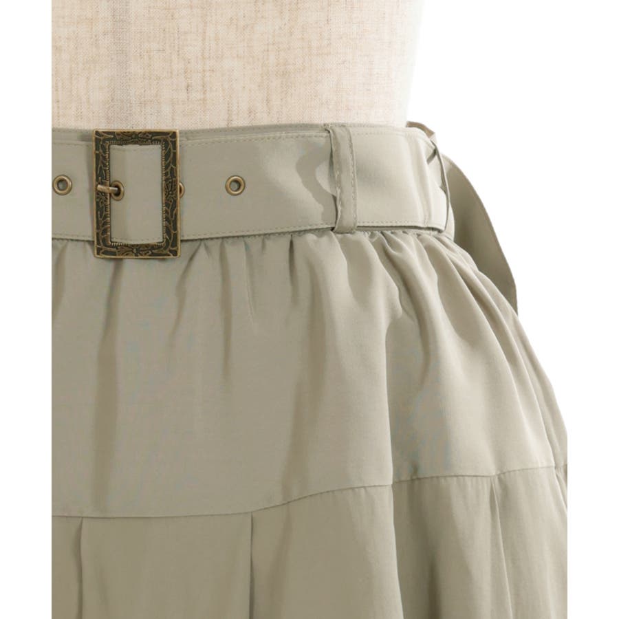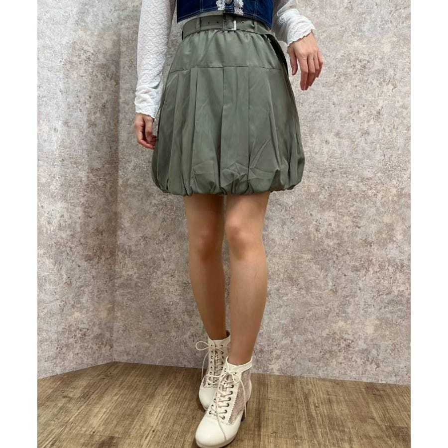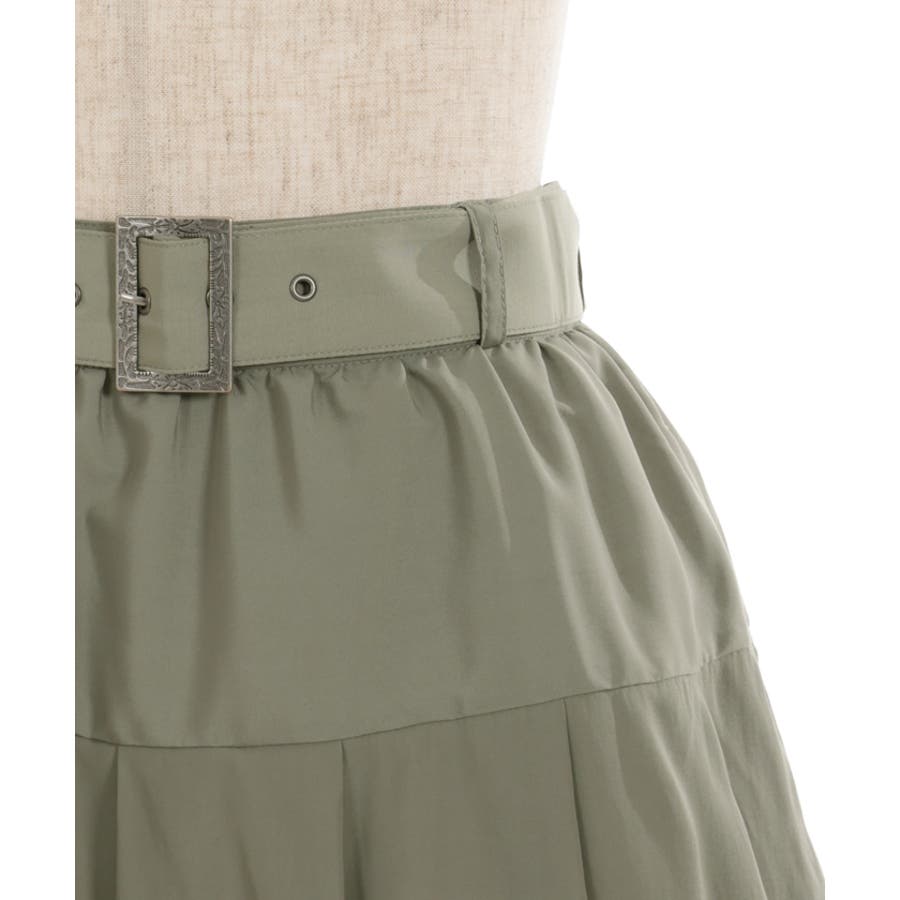 ウエスト~ヒップラインに切り替えを入れ、広がりすぎないようクールなシルエットに。ビッグなバックルが存在感をプラス。