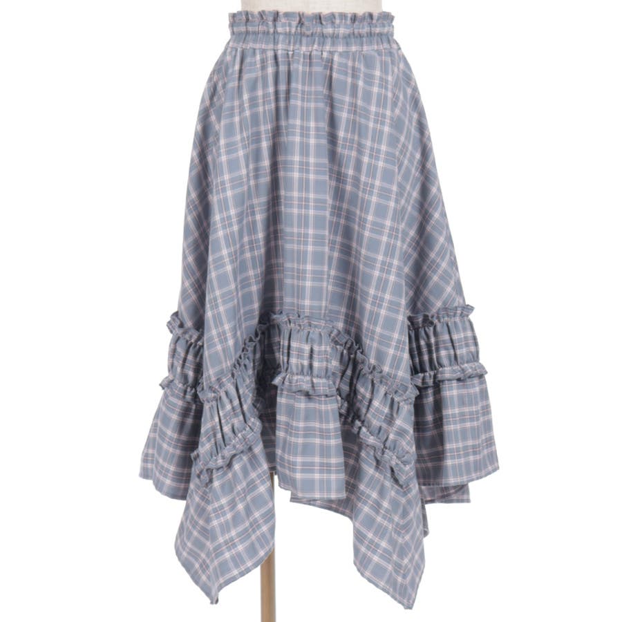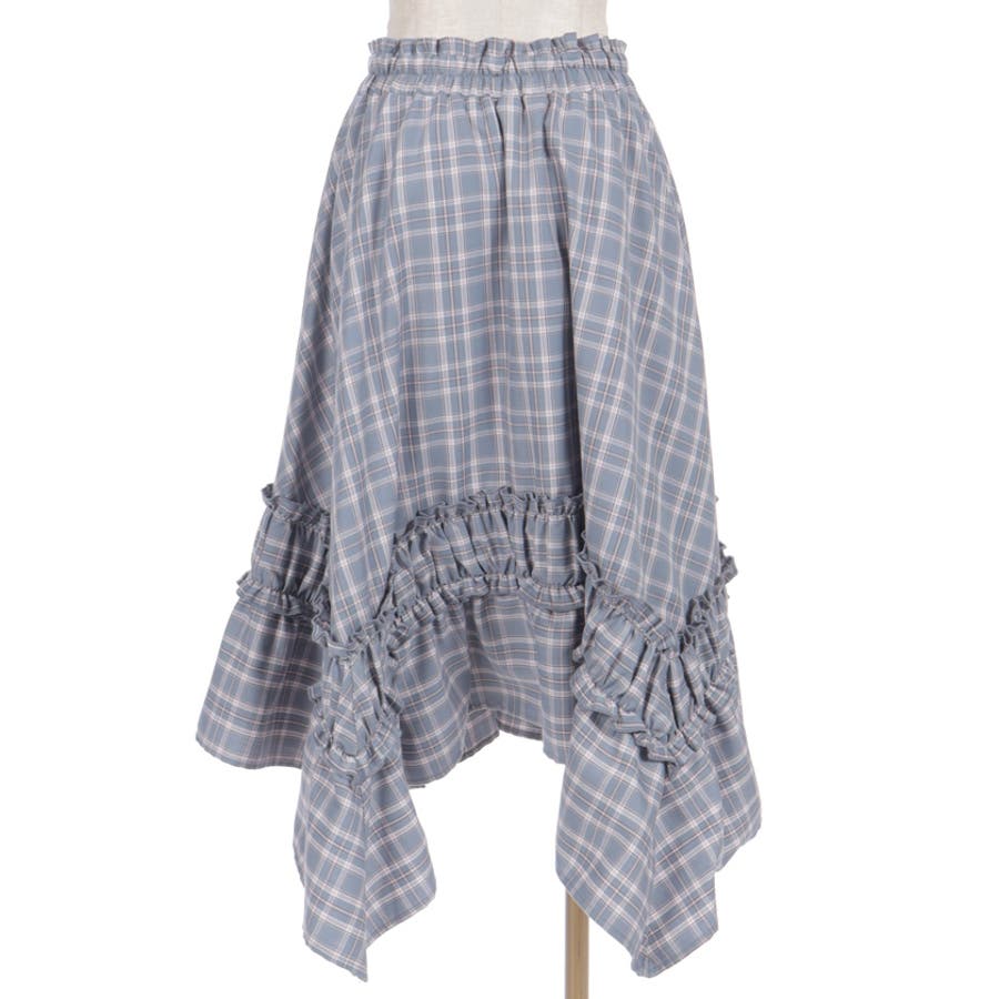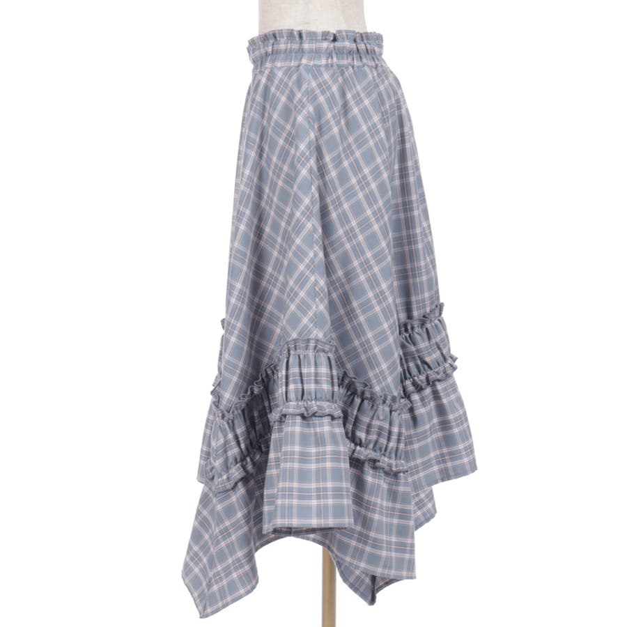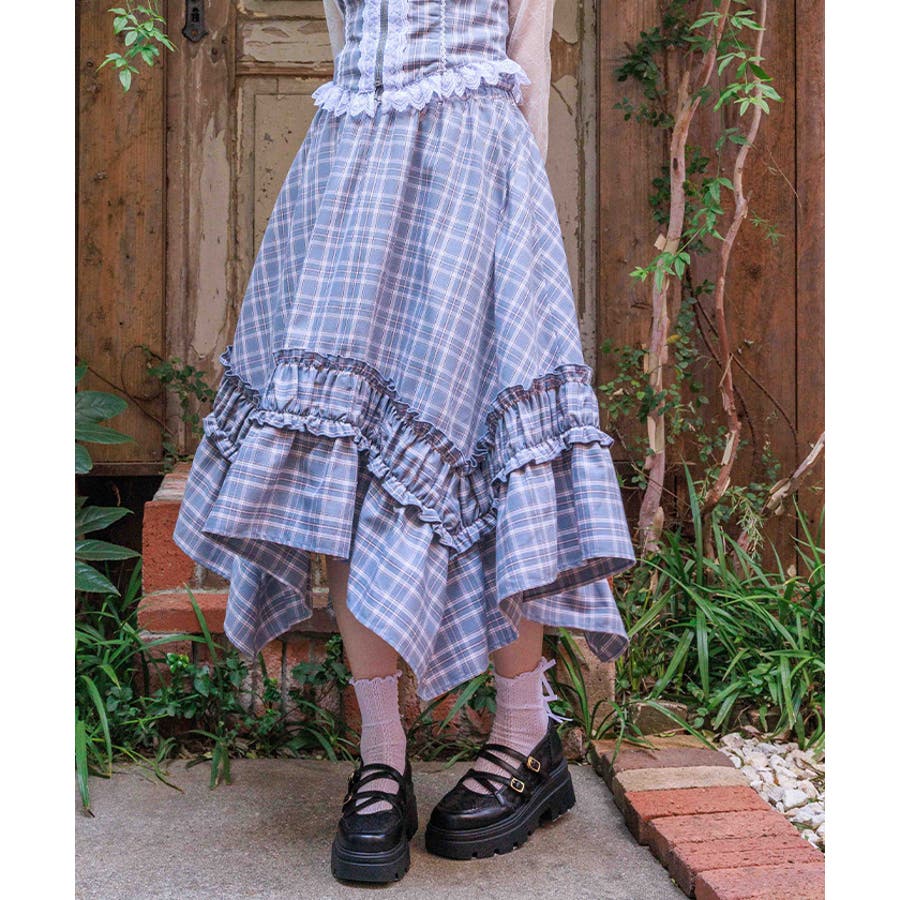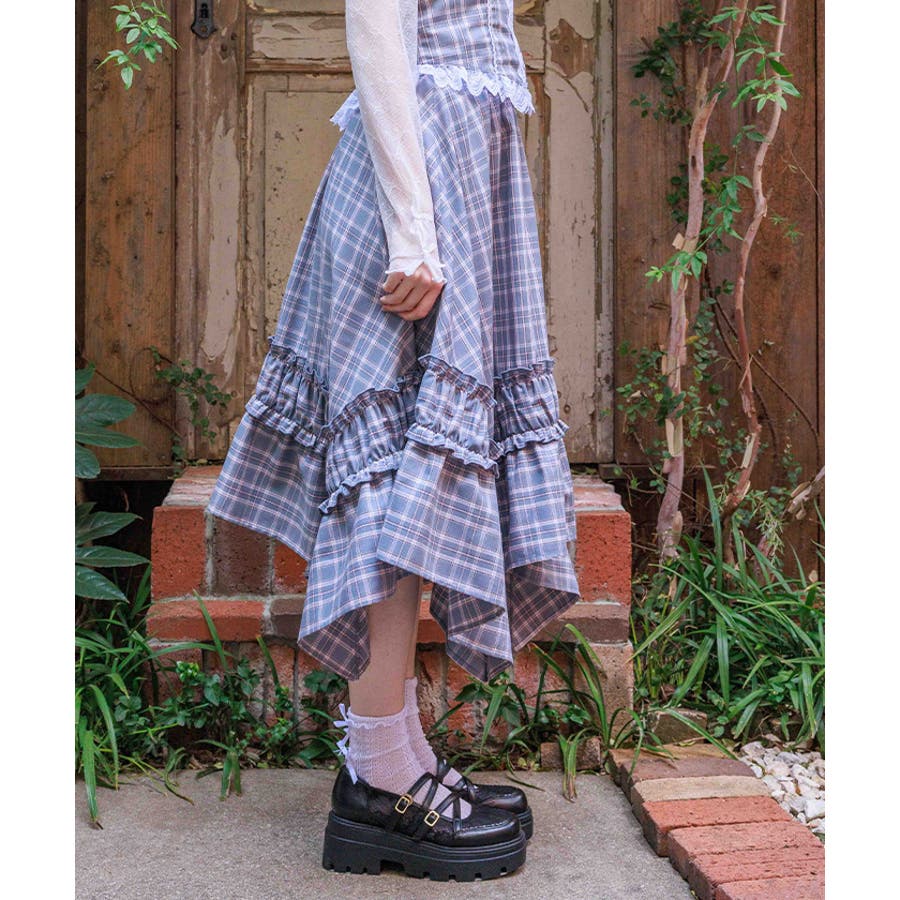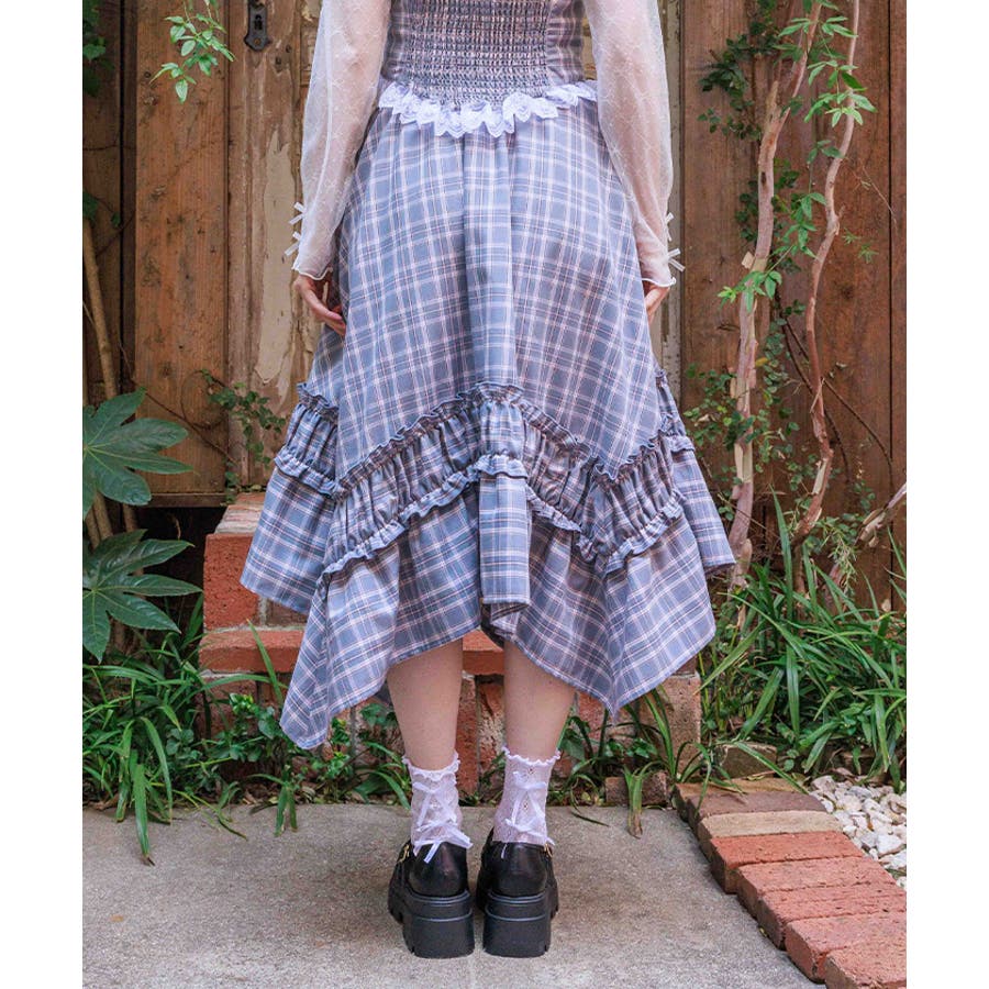 オリジナルチェックが映える、イレギュラーヘムスカート。動きのあるシルエットが印象的な主役ボトムです。【デザイン】