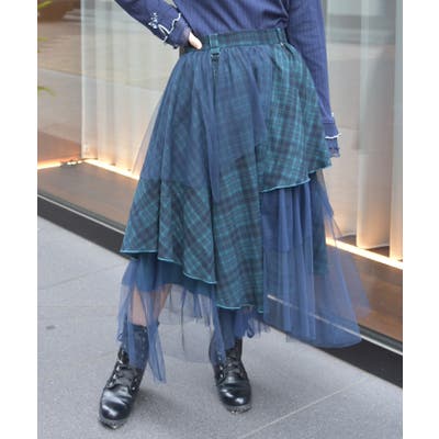 チェック柄のレイヤーにシアー素材を重ね、奥行きのあるニュアンスを表現。フロントにあしらったハトメや装飾ボタンがアクセントとなり、シンプルトップスと合わせても華やかな印象に。ウエストはゴム仕様でラクな着心地ながら、美しいフレアラインをキープしてくれます。