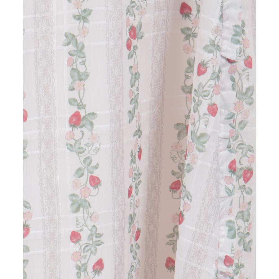 レース風の柄とツタが伸びて苺が縦ラインに並ぶオリジナル柄を、チェックの織り感があるシアー生地プリントしています。