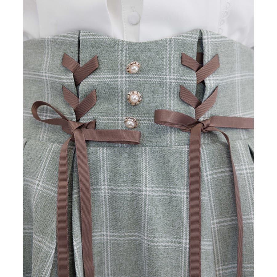 ウエスト部分にはレースアップのデザインをあしらい、後ろには存在感のある大ぶりのリボンがポイントになっています。