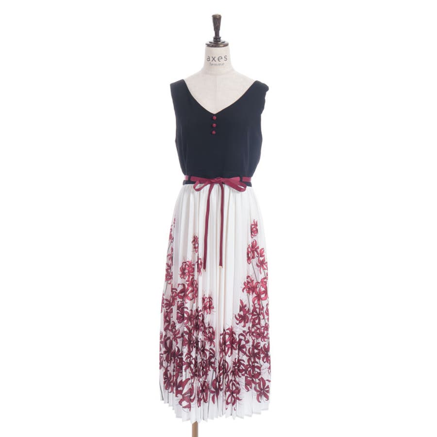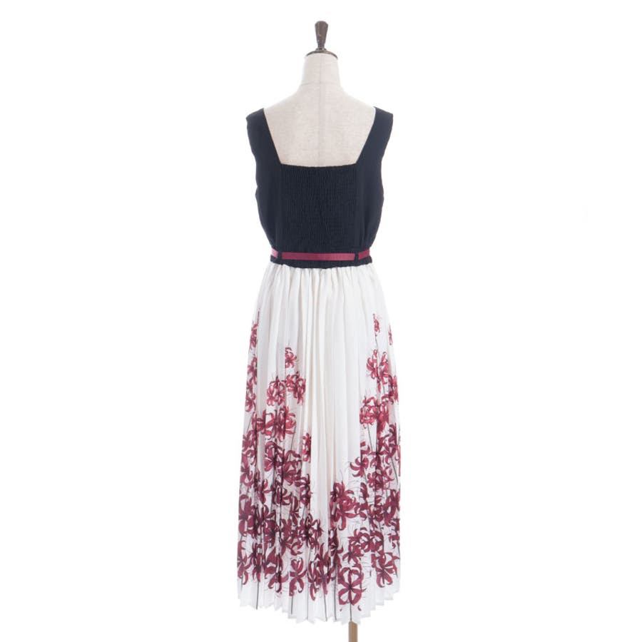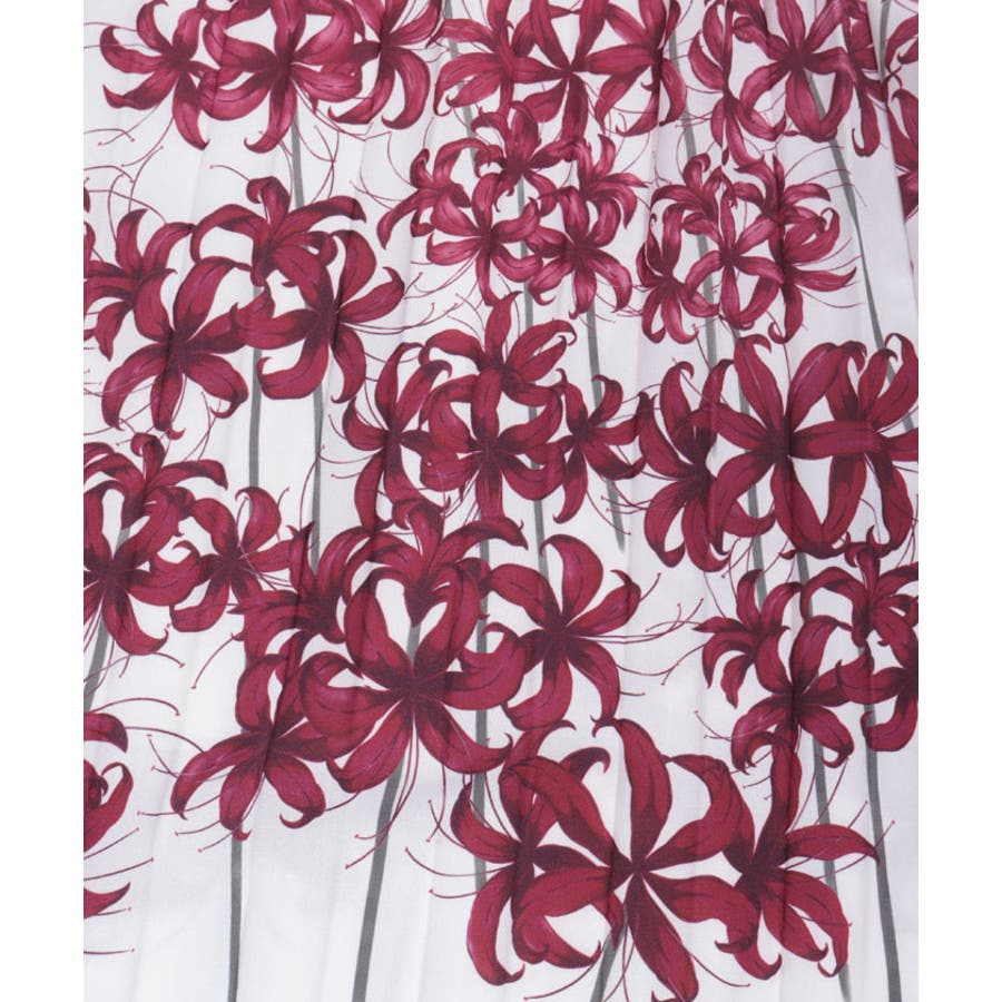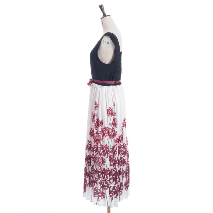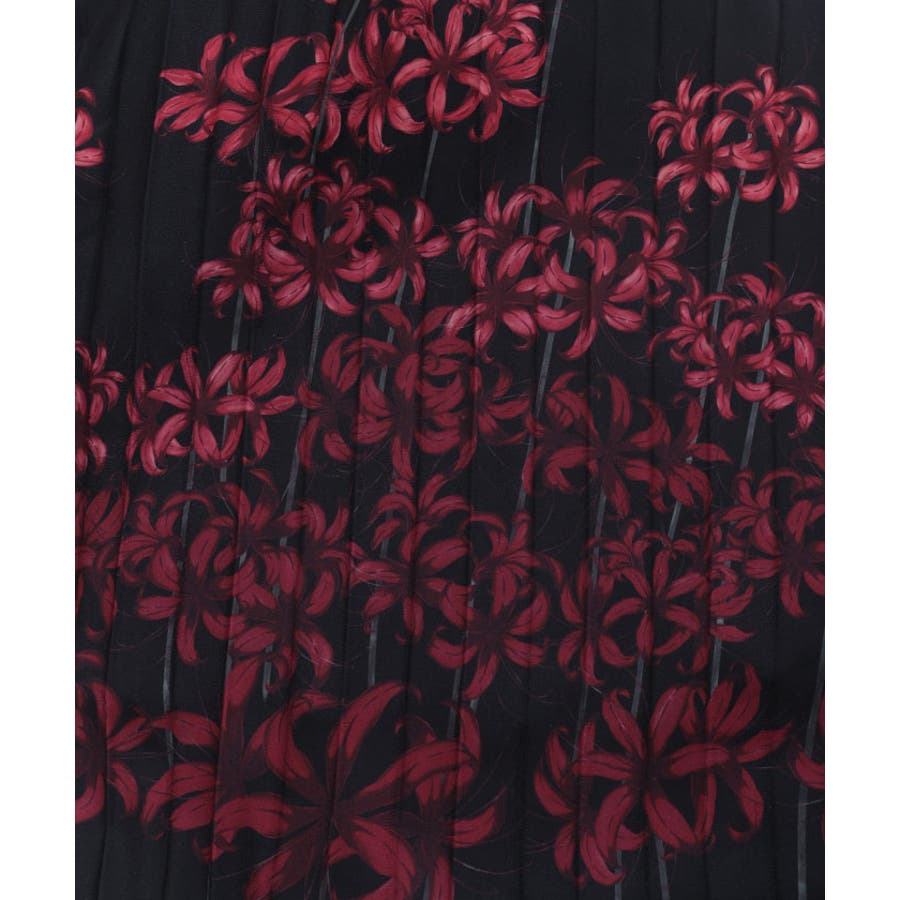 落ち着いた雰囲気の中に存在感を放つ、彼岸花モチーフのワンピース。プリントの美しさが着こなしに印象的なアクセントを加えてくれます。