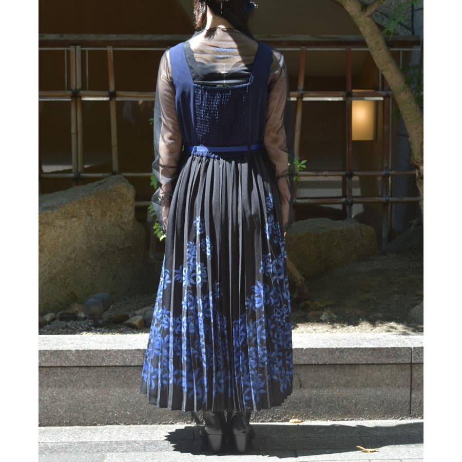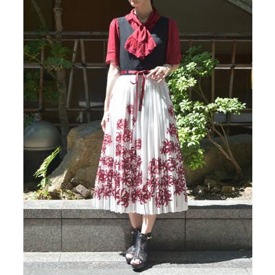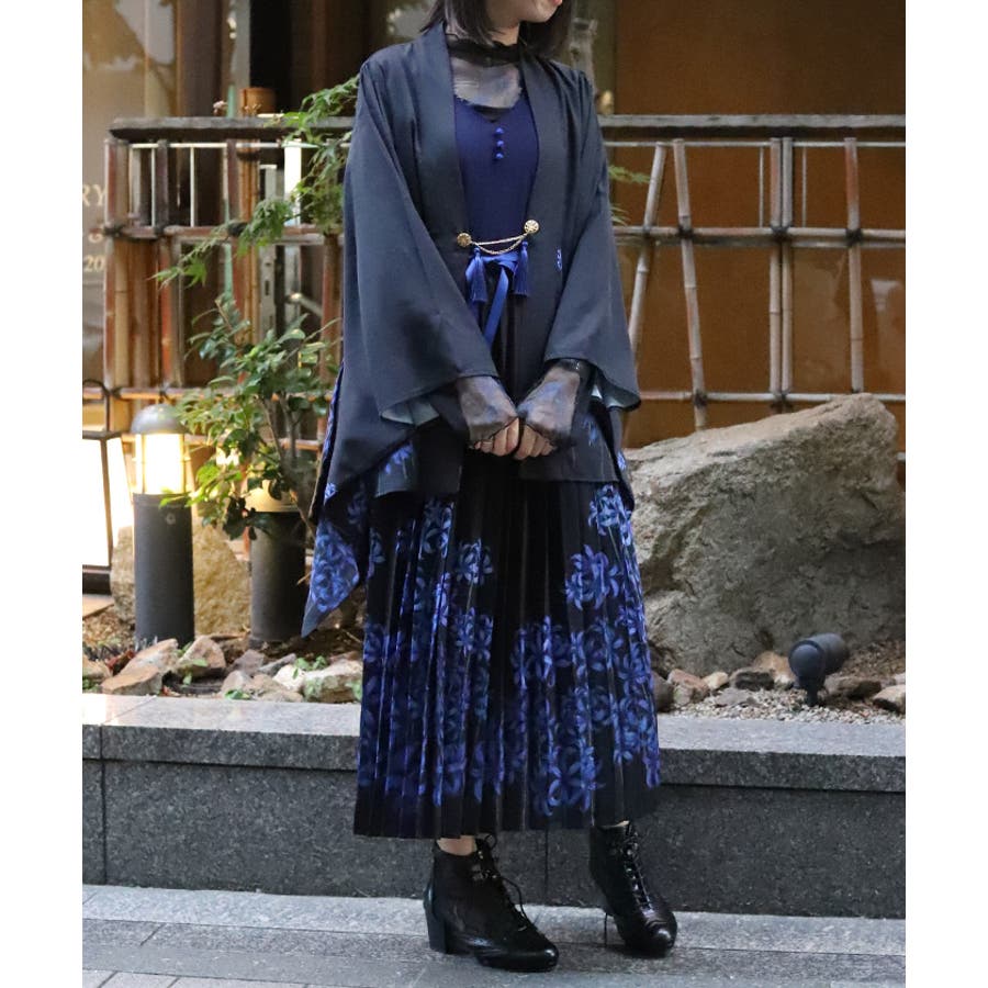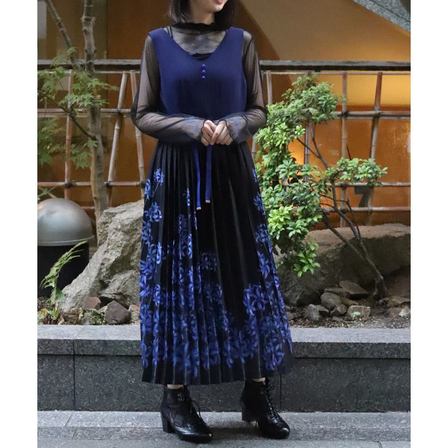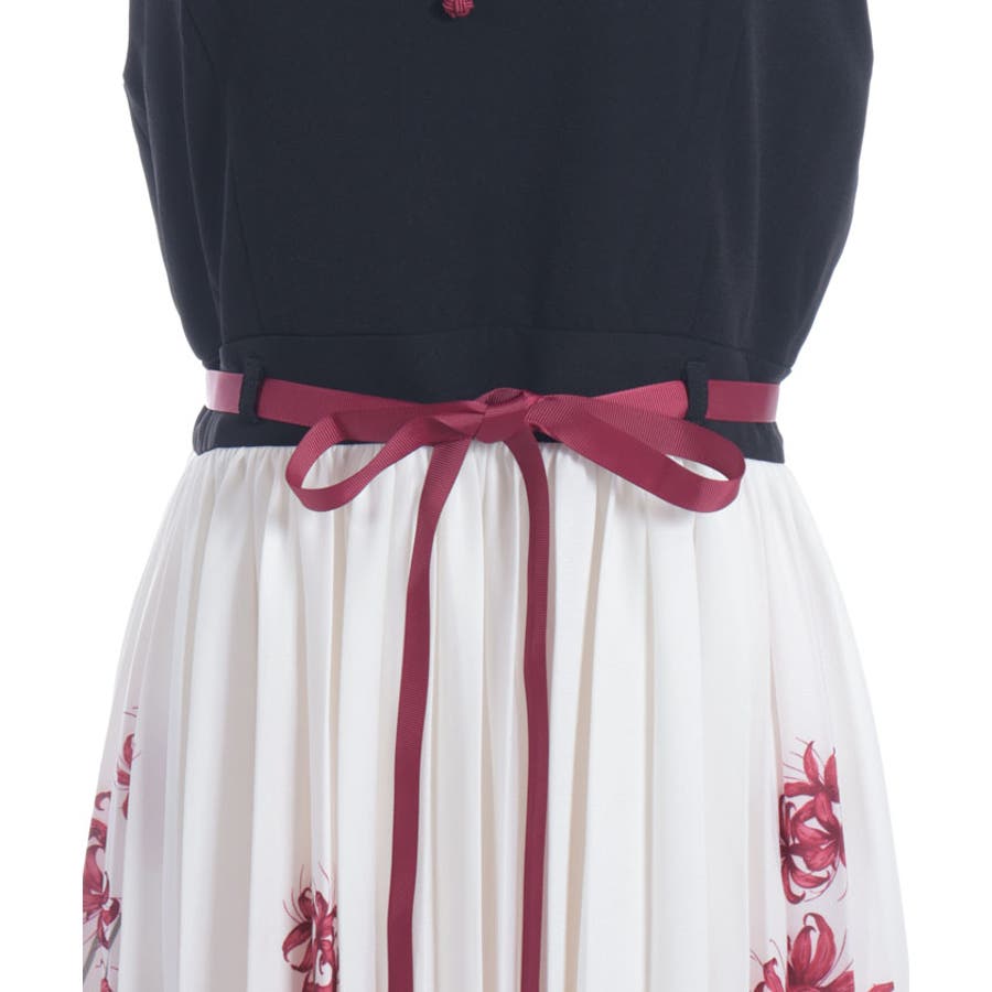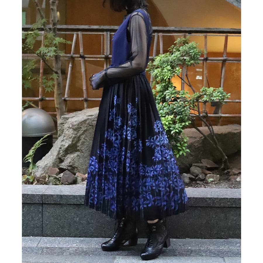 落ち着いた雰囲気の中に存在感を放つ、彼岸花モチーフのワンピース。プリントの美しさが着こなしに印象的なアクセントを加えてくれます。