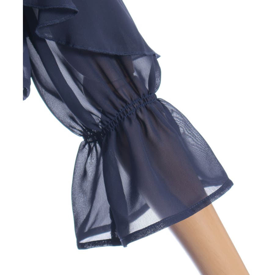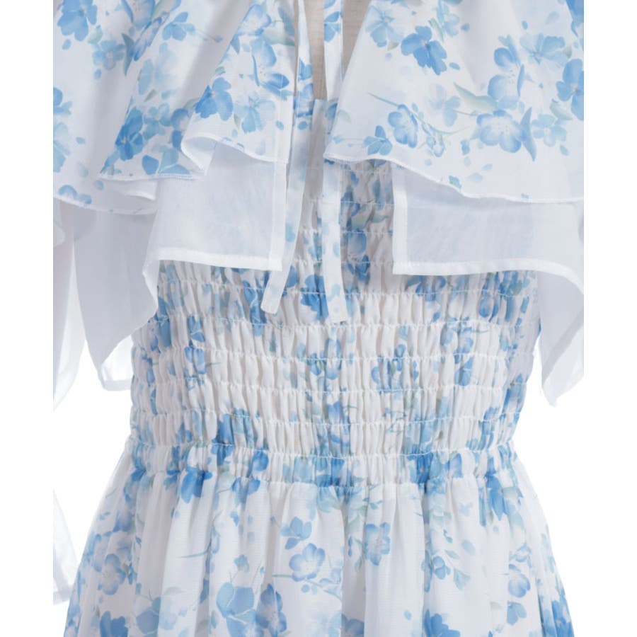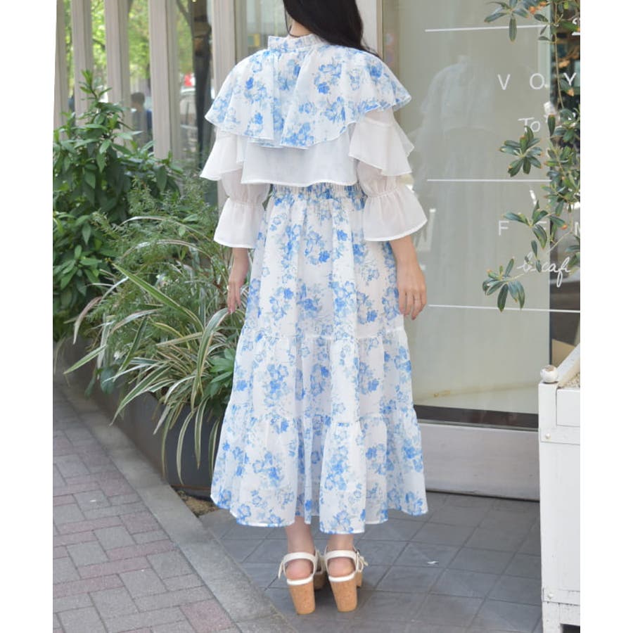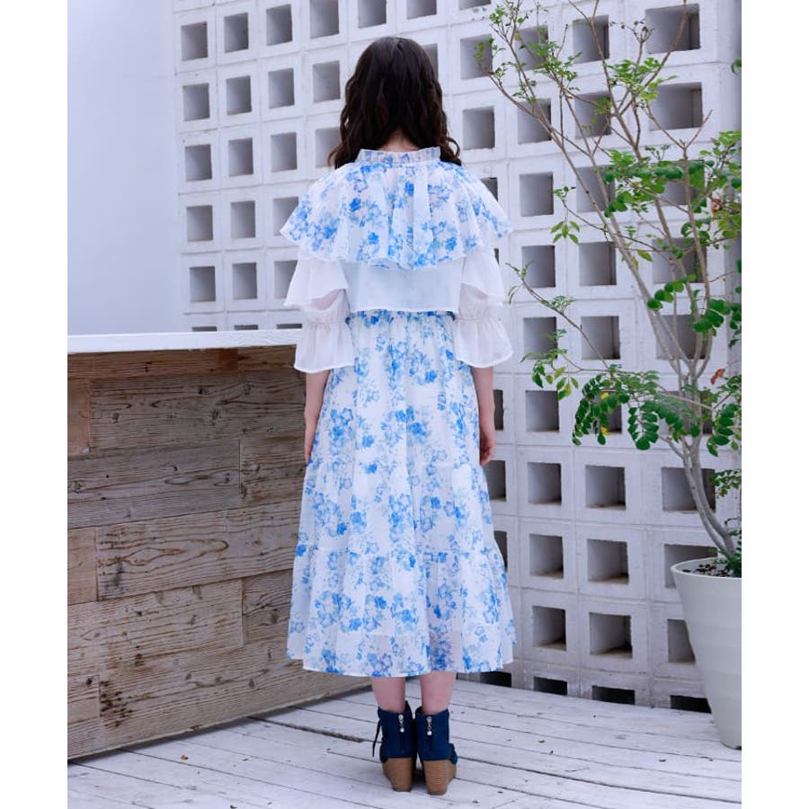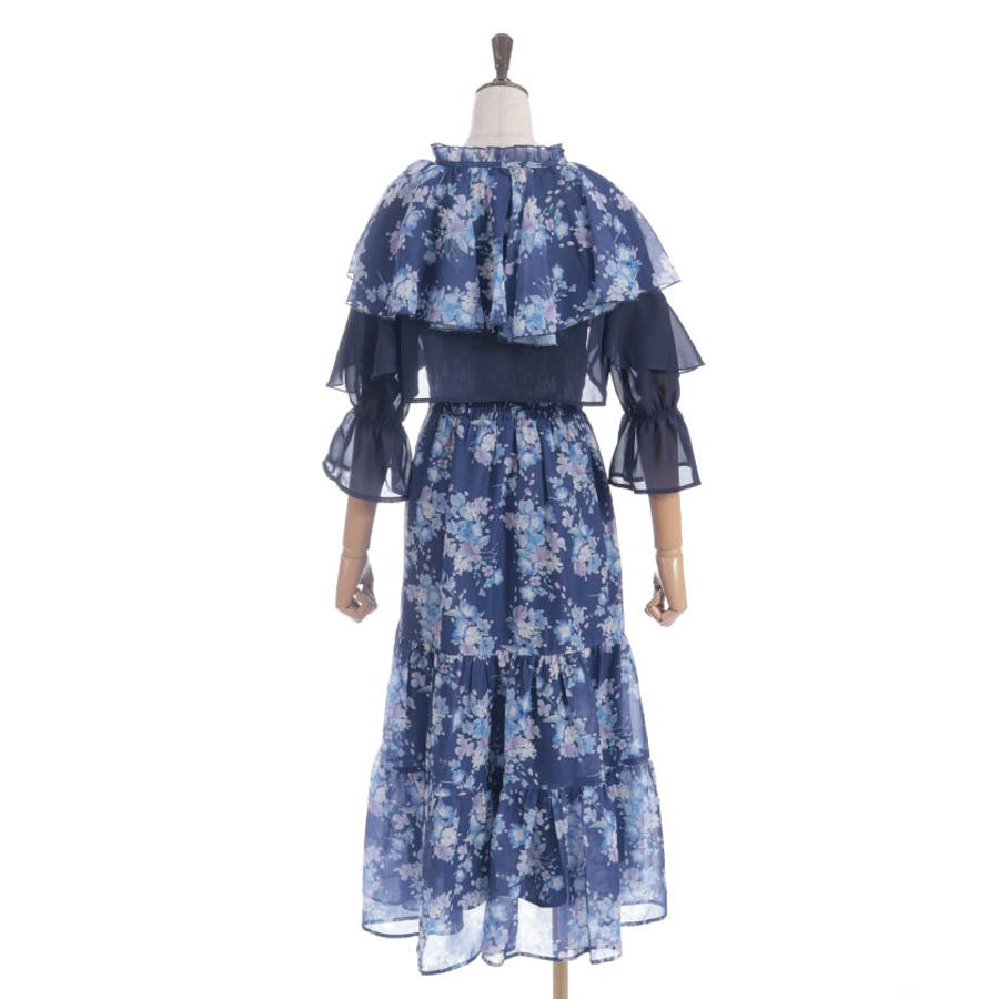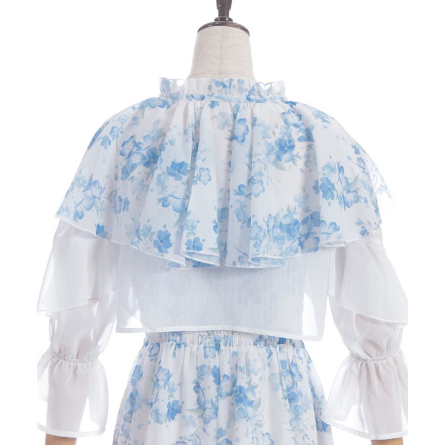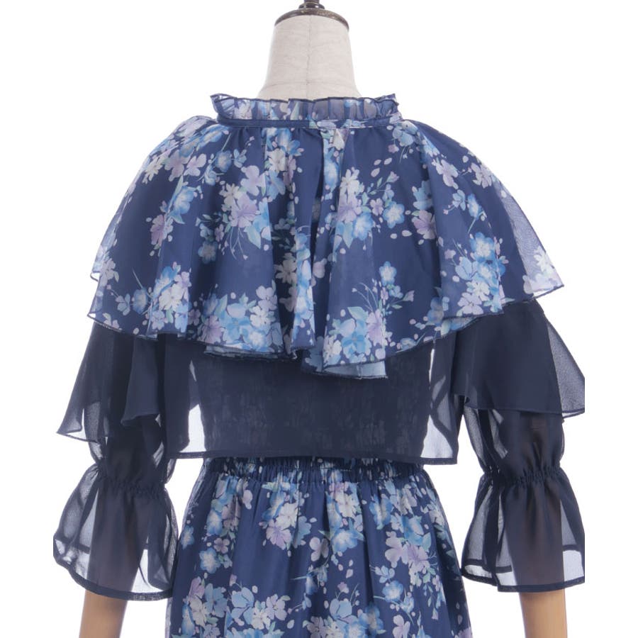 ブラウスはボレロのようなショート丈でご用意、ふわりとなびくフリルがポイントです。キャミワンピースの上身はシャーリングゴムを通しフィット&フレアシルエットが女性らしい印象を与えます。