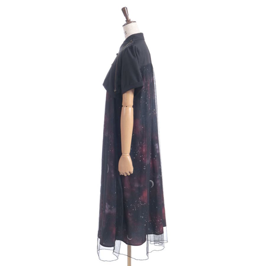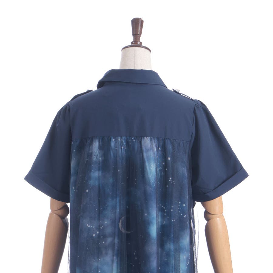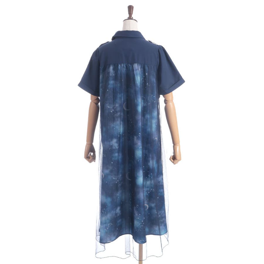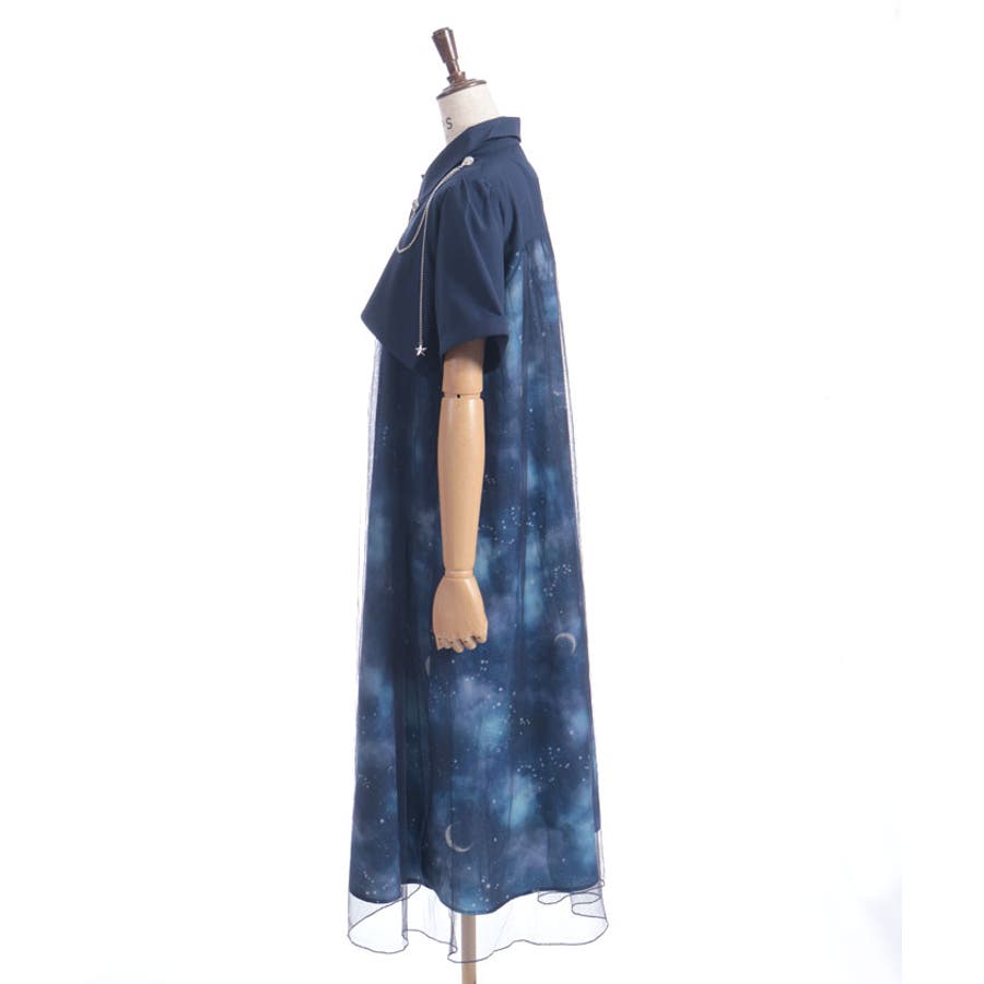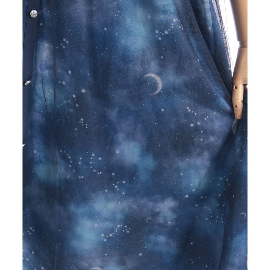 夜空に浮かぶ月や星座、きらめく星をモチーフにした、幻想的なステラ柄のシャツワンピース。