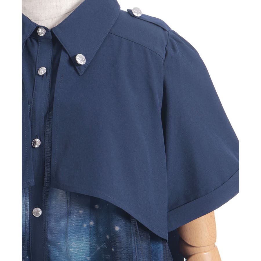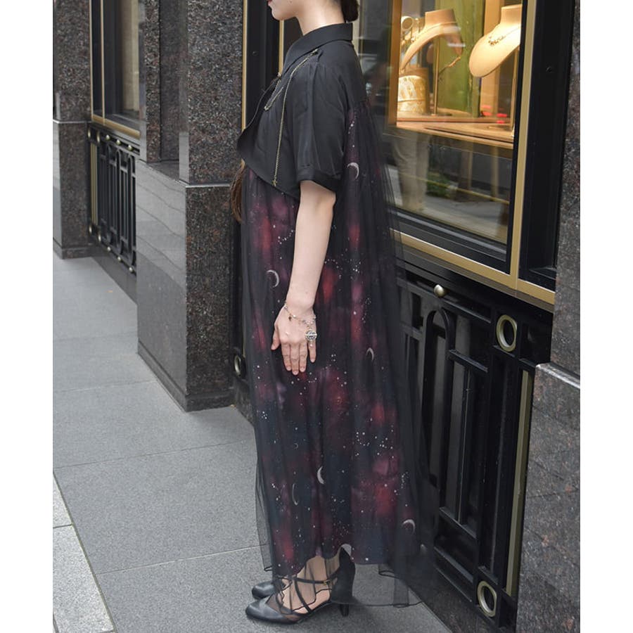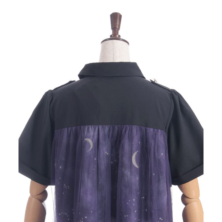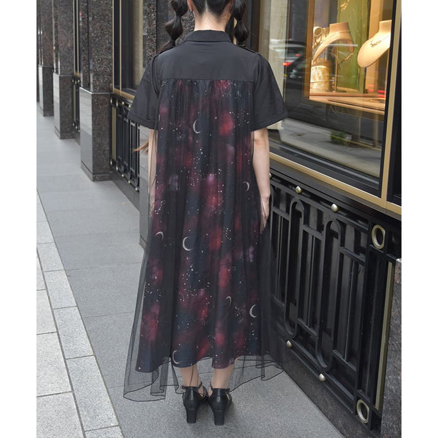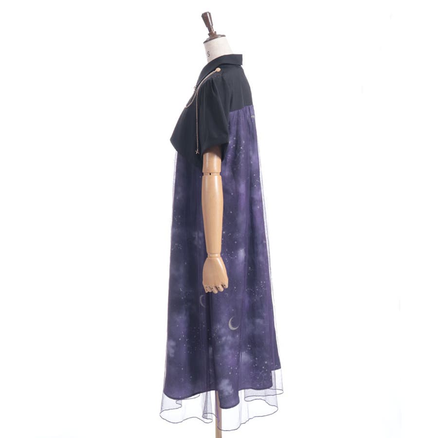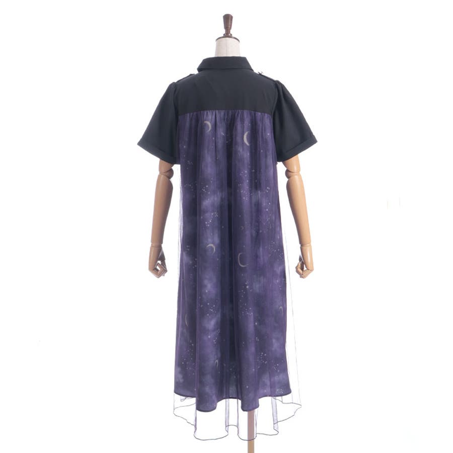 夜空に浮かぶ月や星座、きらめく星をモチーフにした、幻想的なステラ柄のシャツワンピース。