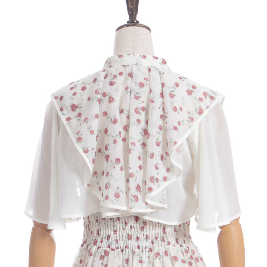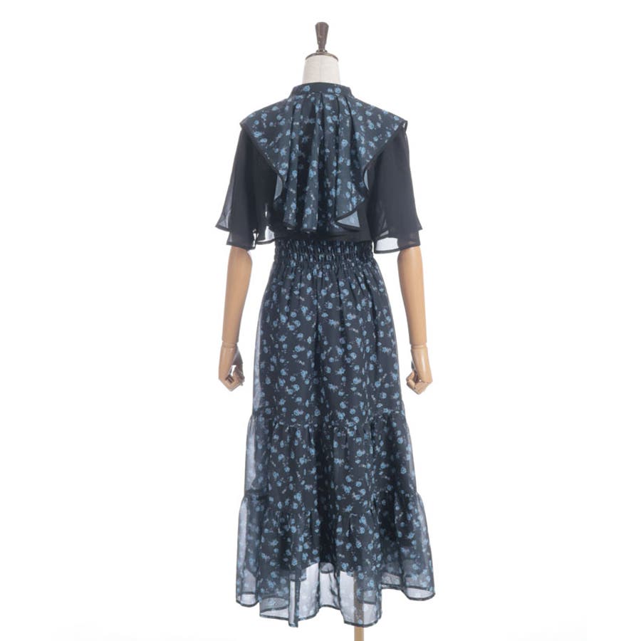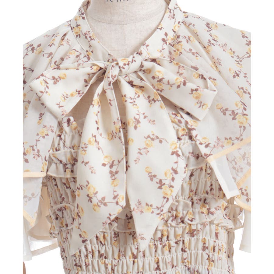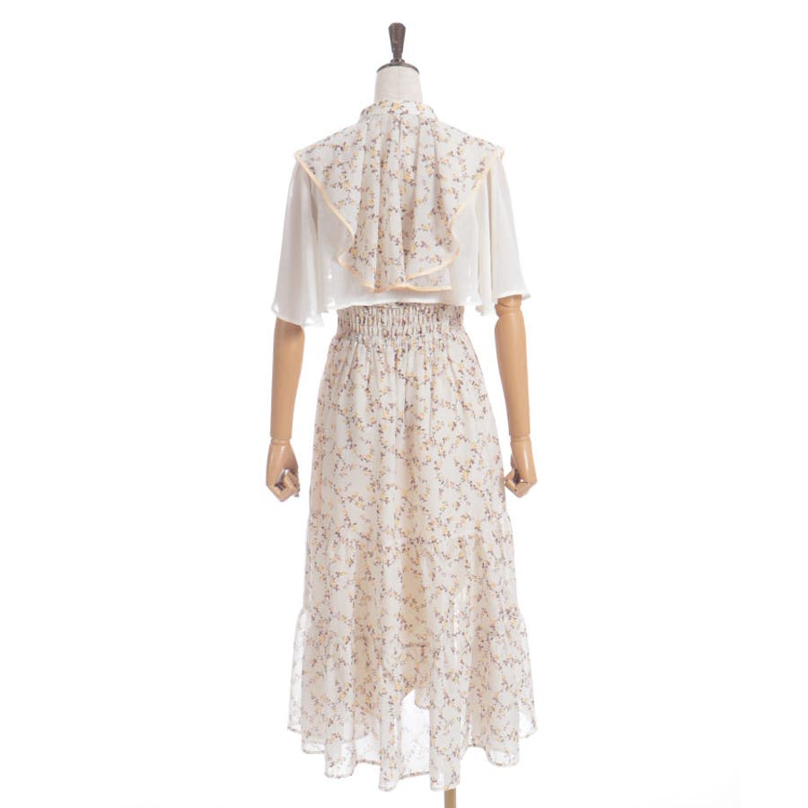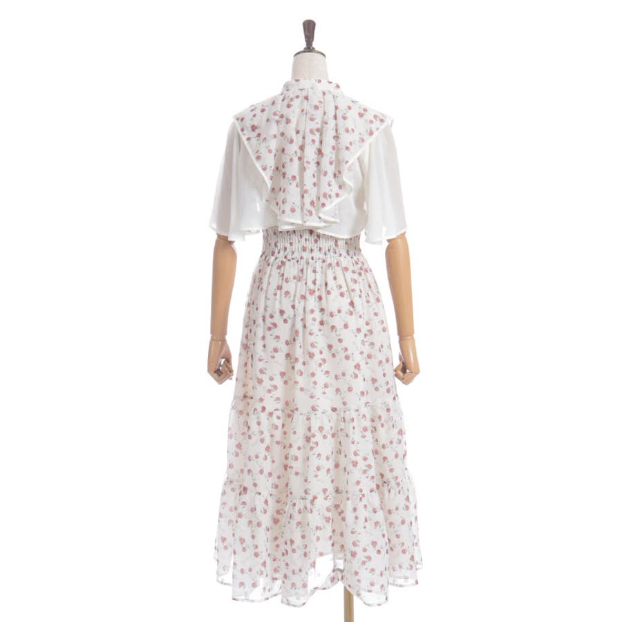 ブラウスはボレロのようなショート丈でご用意、ふわりとなびくフリル×リボンがポイントです。キャミワンピースの上身はシャーリングゴムを通しフィット&フレアシルエットが女性らしい印象を与えます。