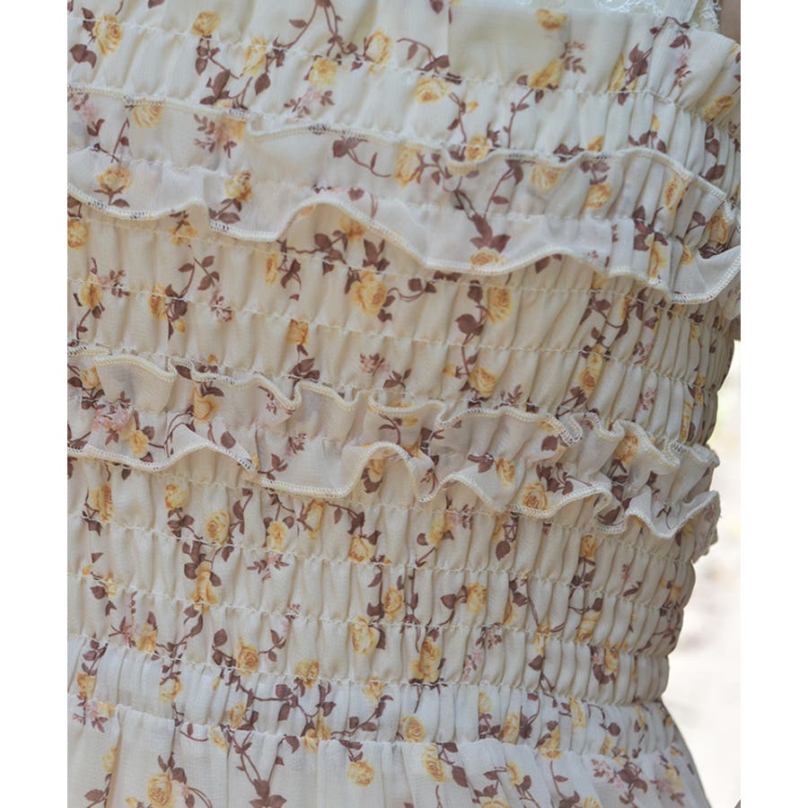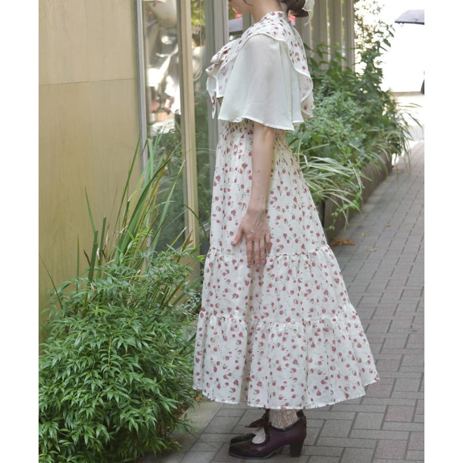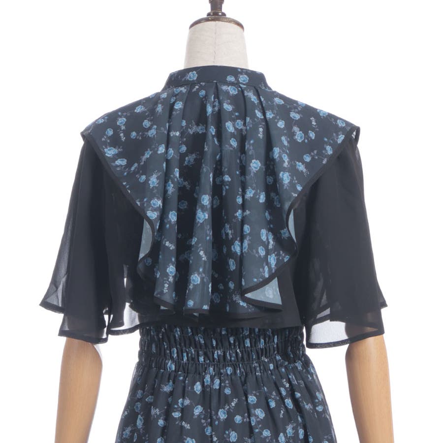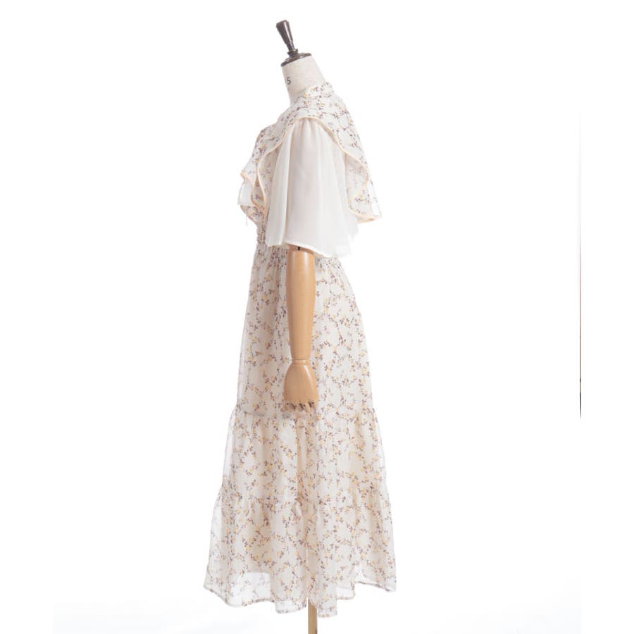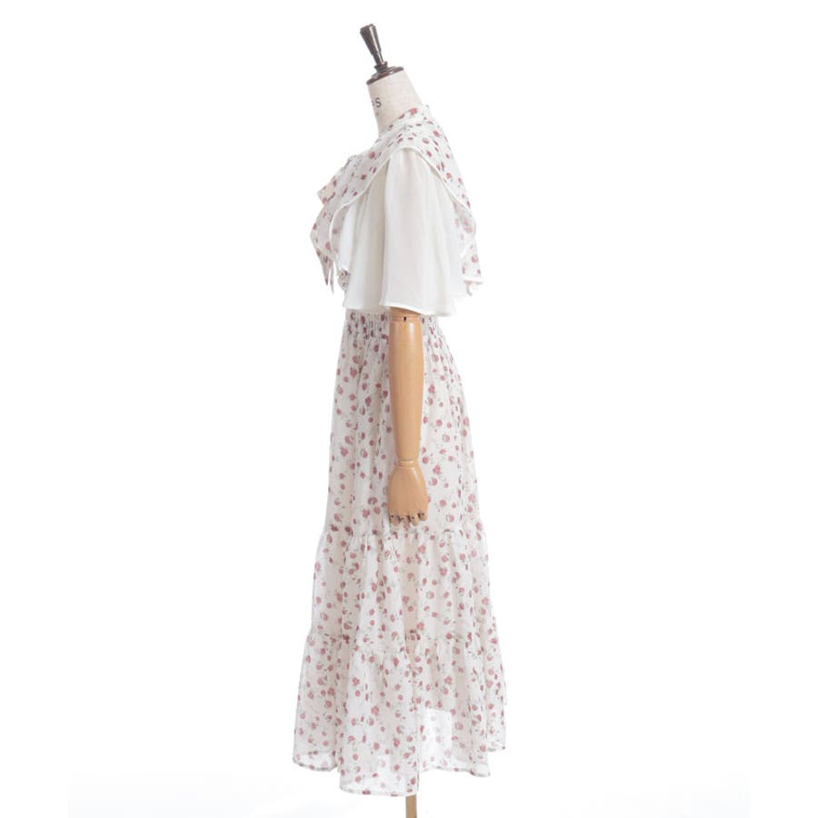 ブラウスはボレロのようなショート丈でご用意、ふわりとなびくフリル×リボンがポイントです。キャミワンピースの上身はシャーリングゴムを通しフィット&フレアシルエットが女性らしい印象を与えます。