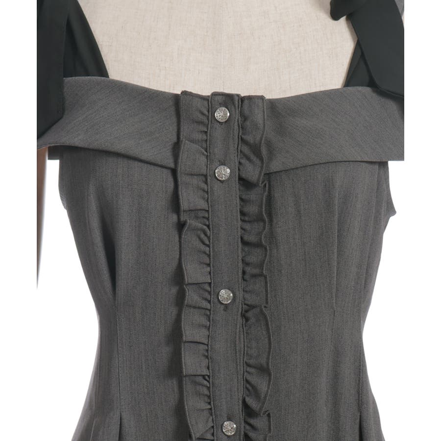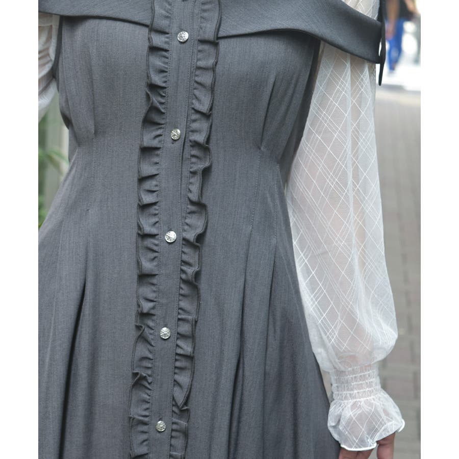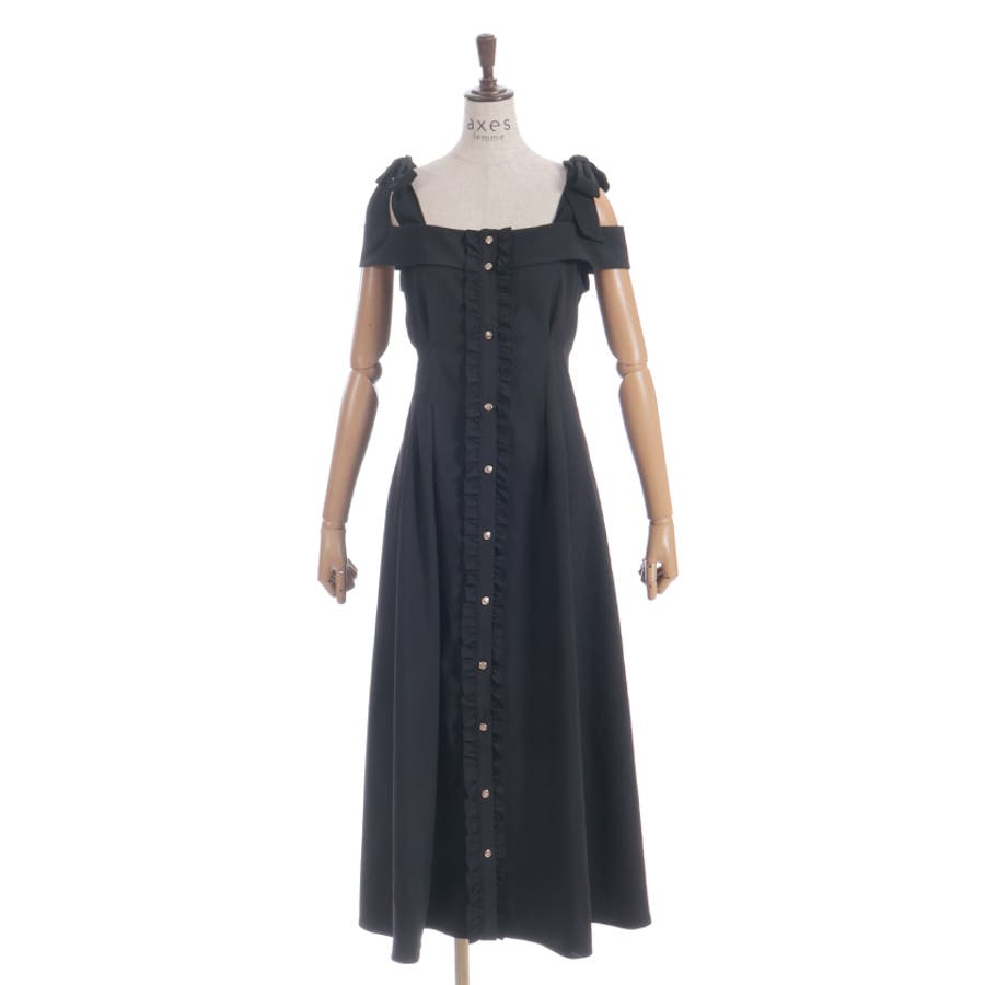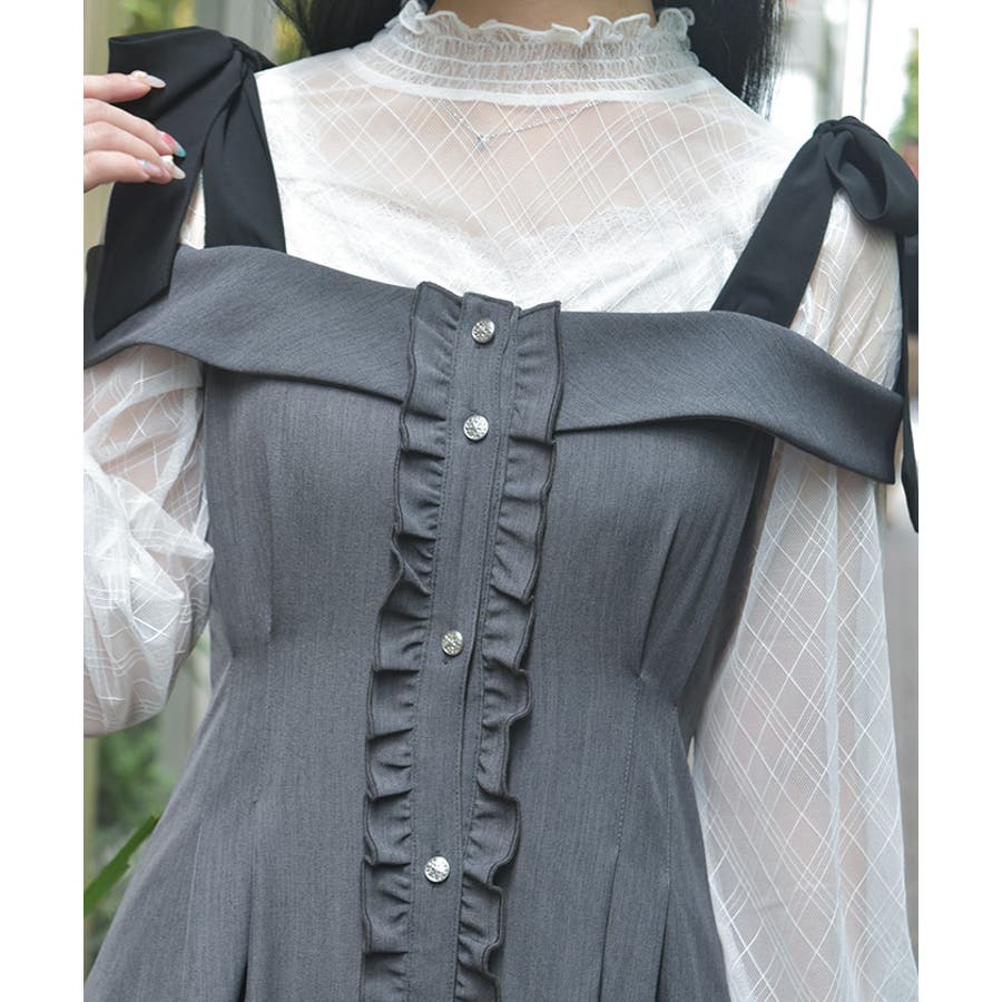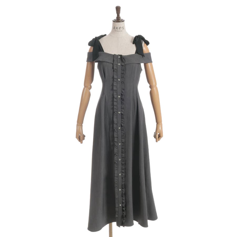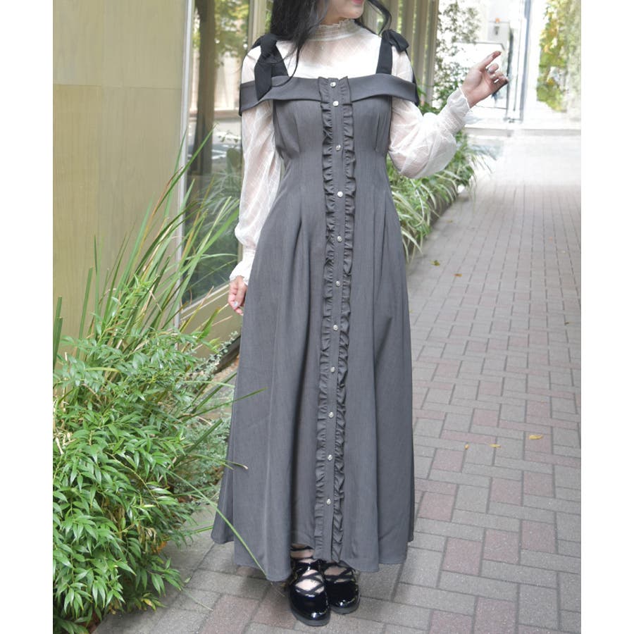 すらりとしたシルエットと肩の抜け感が魅力のロングワンピース。ボタンラインに沿ってあしらったフリルが、さりげなく女性らしさをプラスします。肩紐は自分で結ぶリボンデザインで、ふんわり揺れるリボンが可愛らしいアクセントに。そのまま着ても、インナーを合わせてもさまになる1着です。