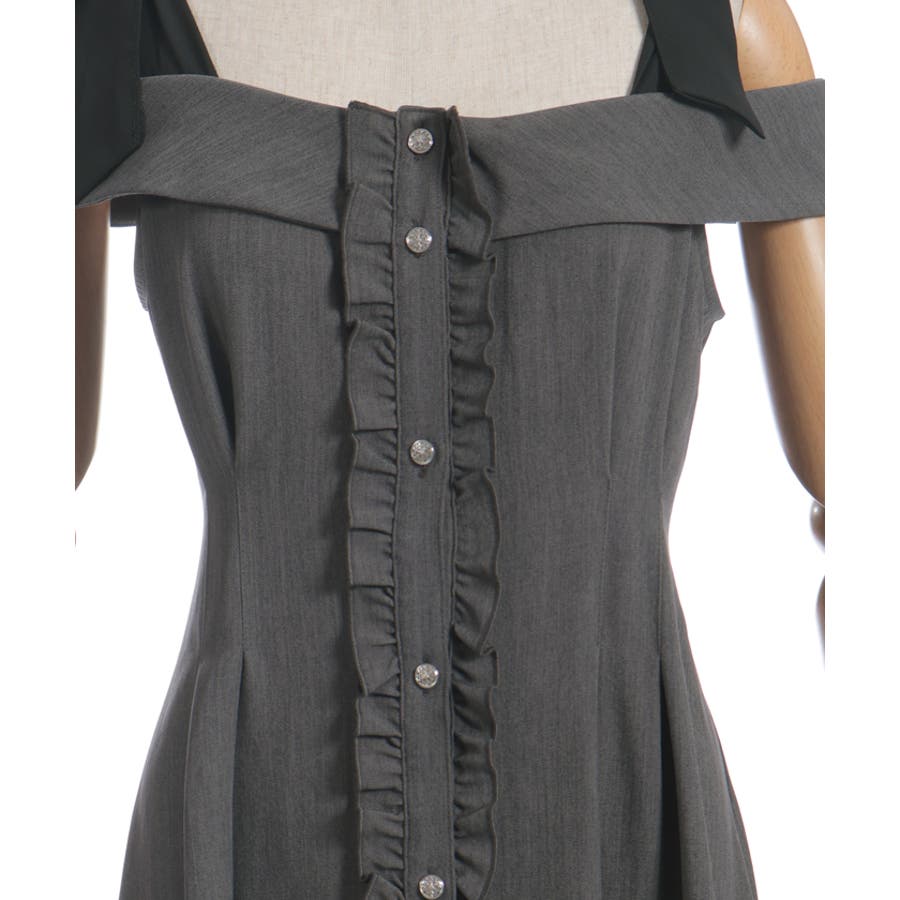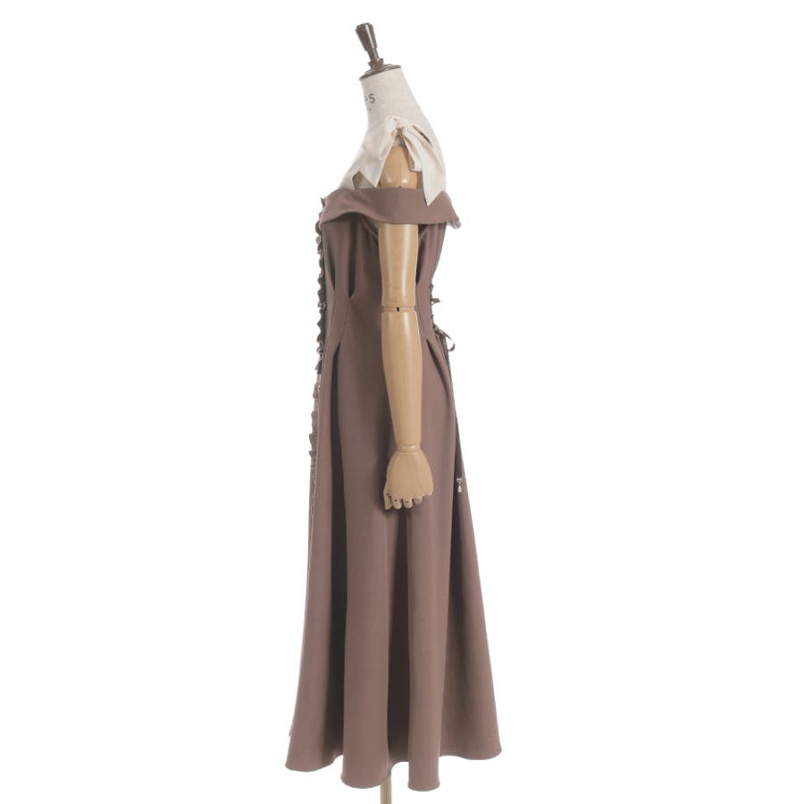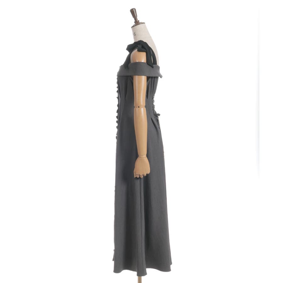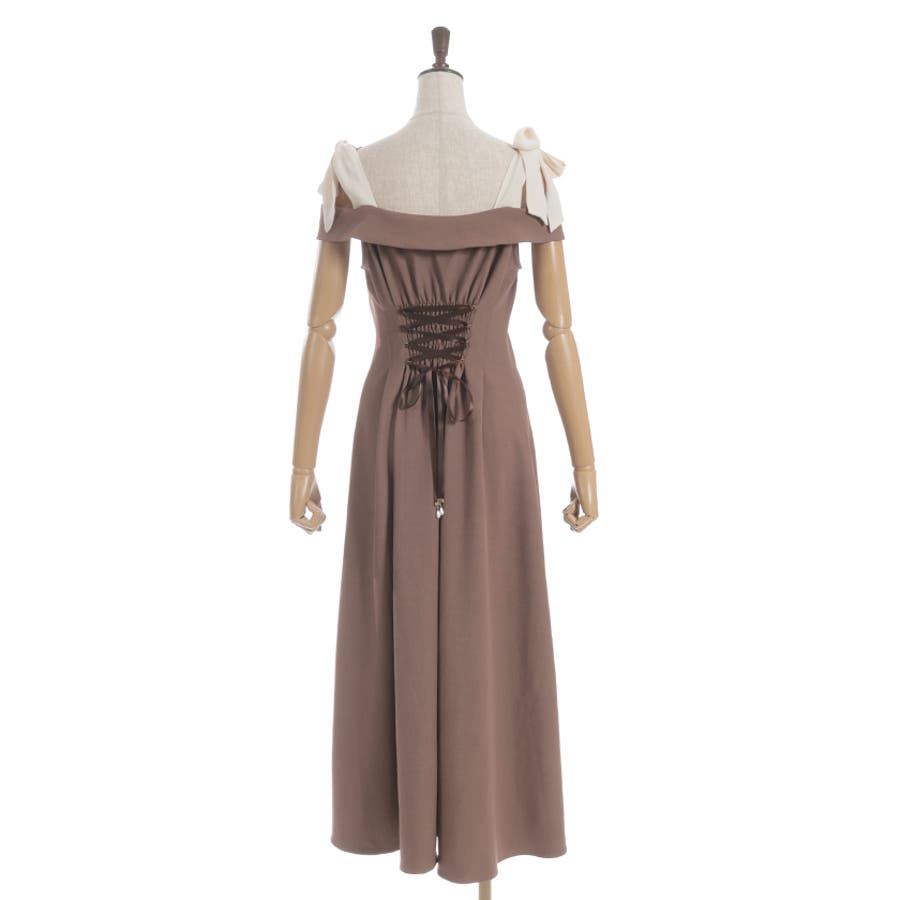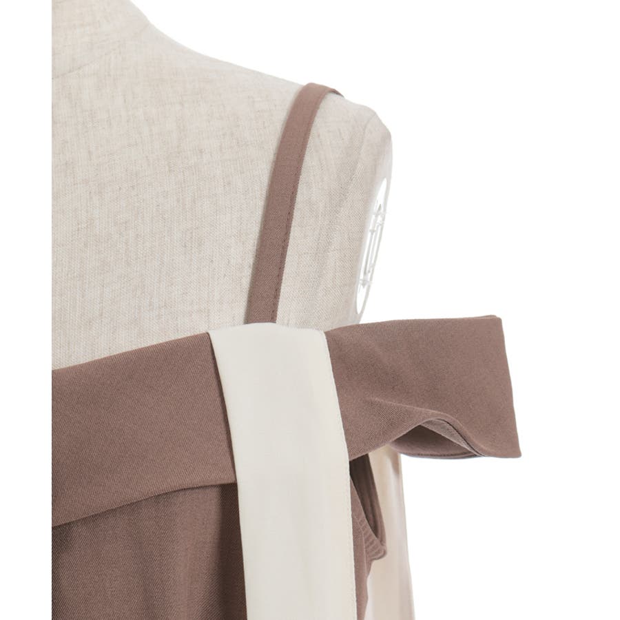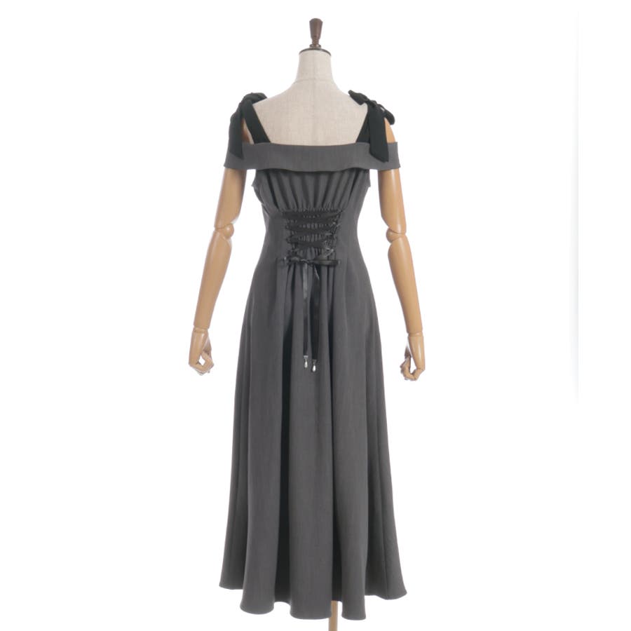 デコルテをきれいに見せる肩あきデザインで、大人のフェミニンスタイルを演出。肩紐は長さの調整が可能で、結び方次第で雰囲気を変えられます。ウエストから裾にかけて広がる上品なフレアが、動くたび美しい揺れ感を生みます。