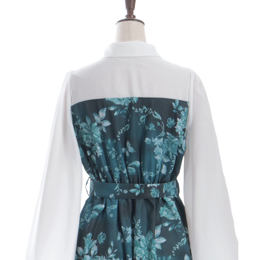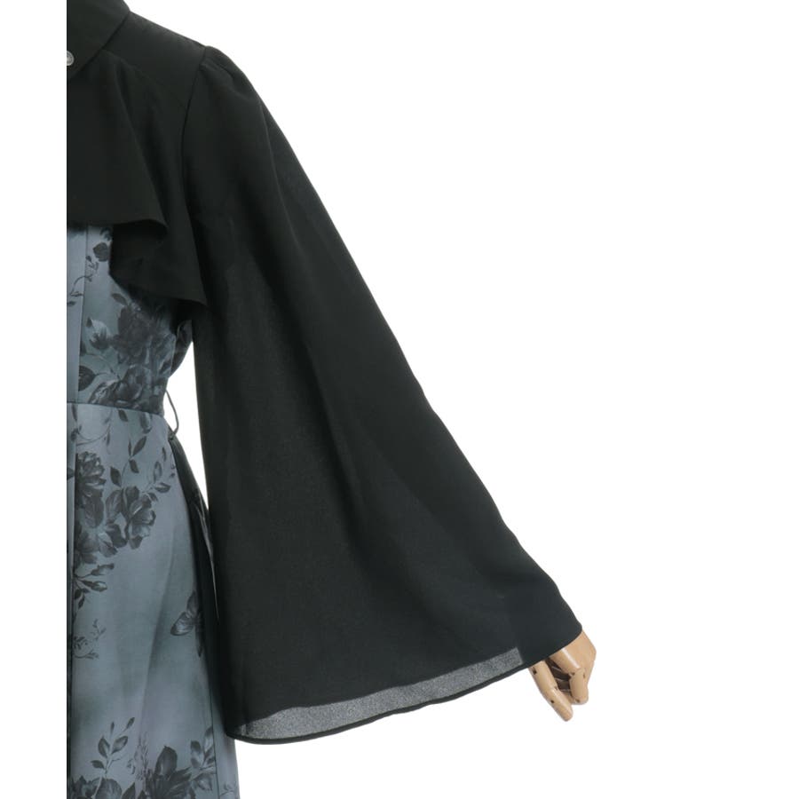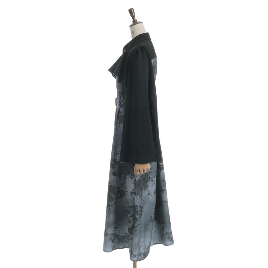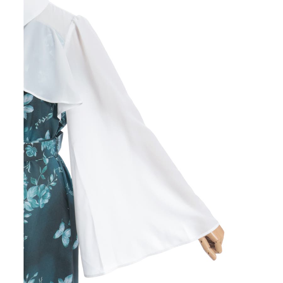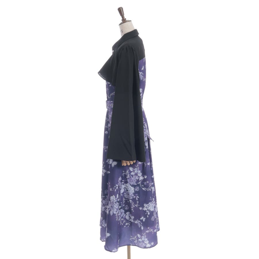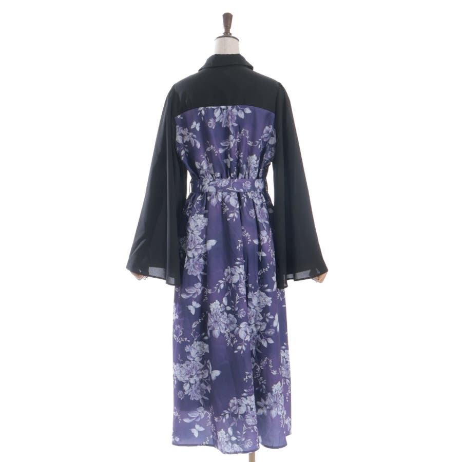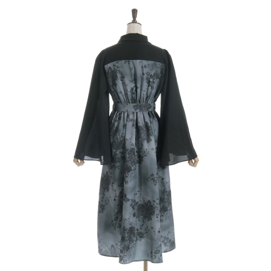 胸元のシャツ風デザインがきちんと感を添え、全体をすっきりと見せてくれる仕上がりに。袖口は広がりのあるフレアシルエットで、動くたびに優雅な揺れ感をプラス。付属のベルトでウエストマークすれば、さらに美しいシルエットを楽しめます。