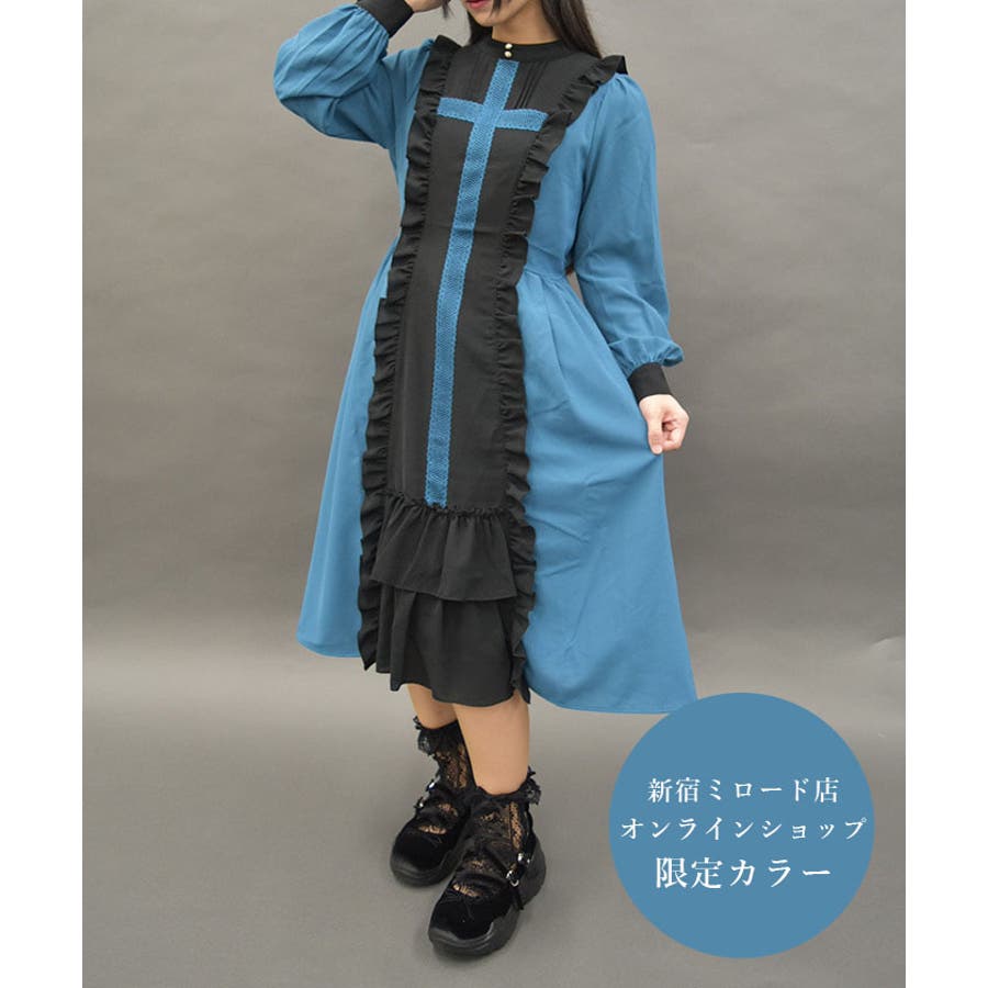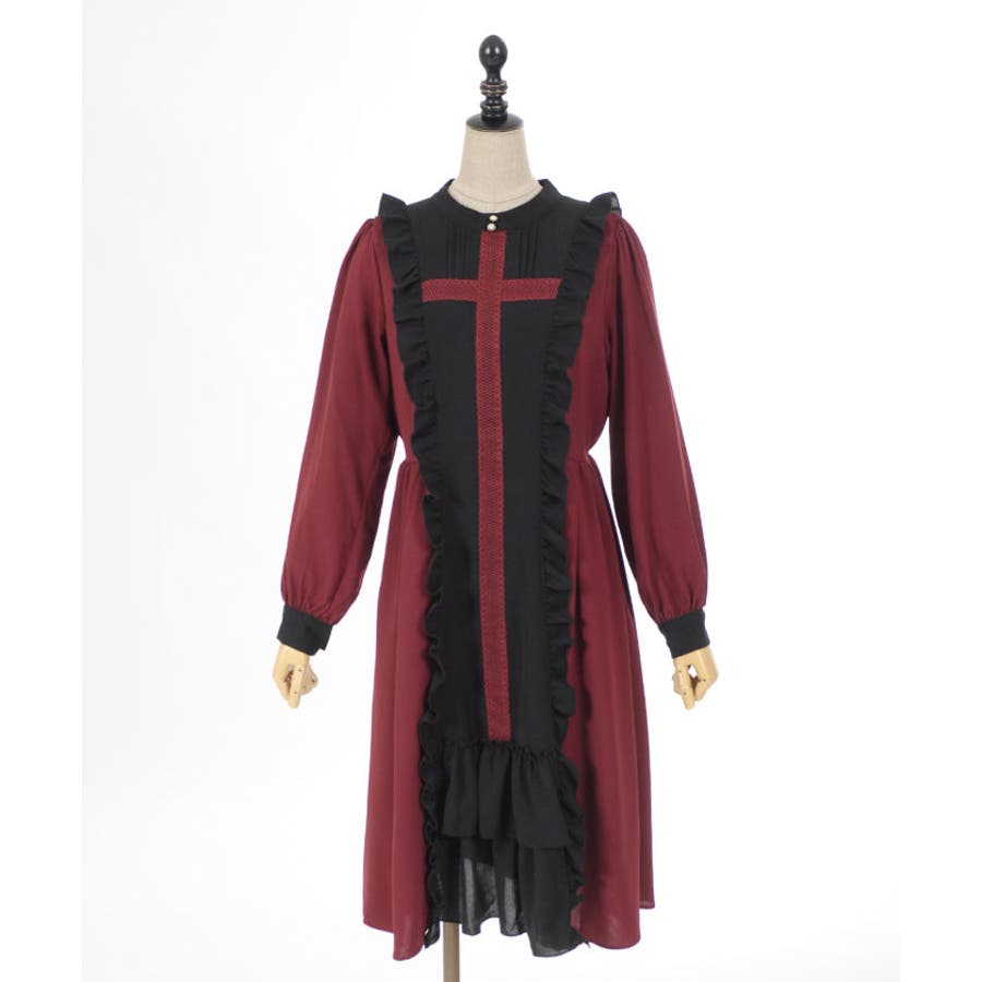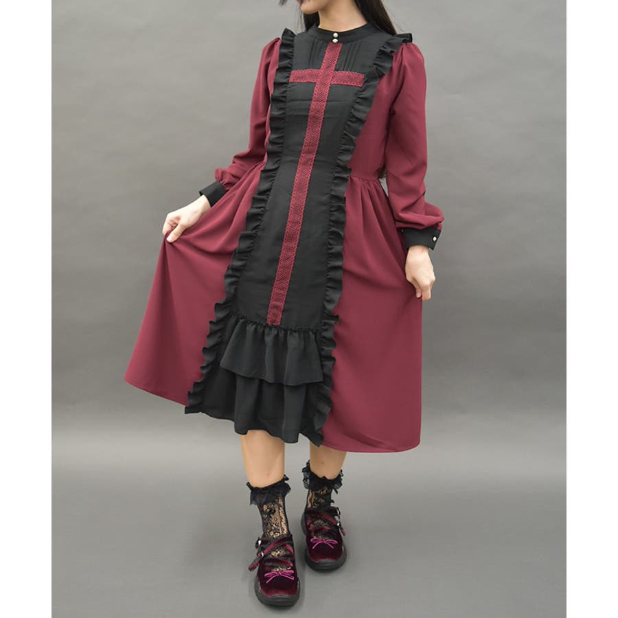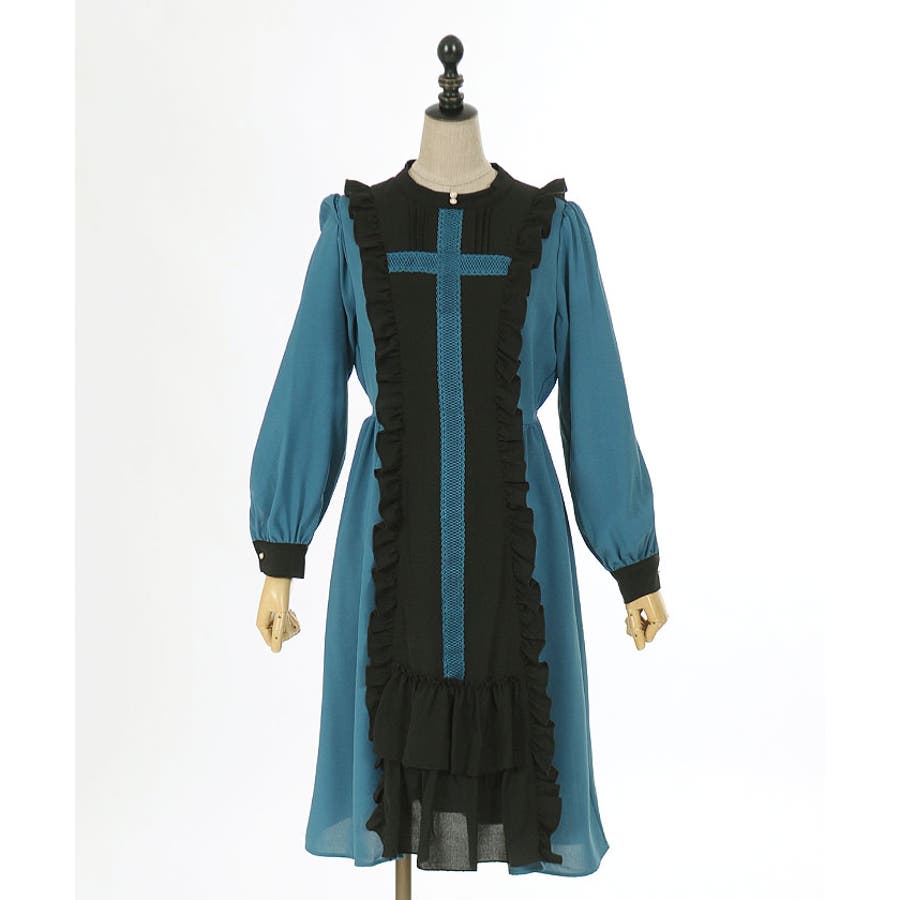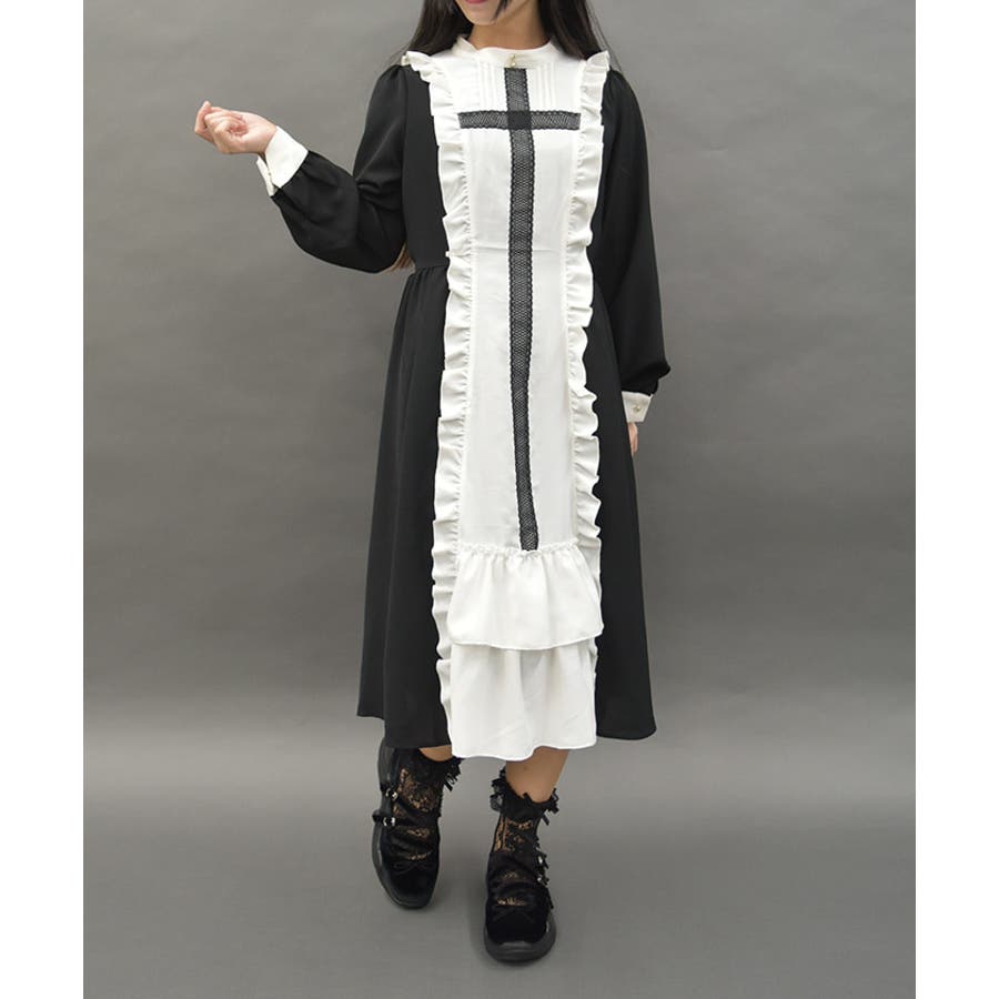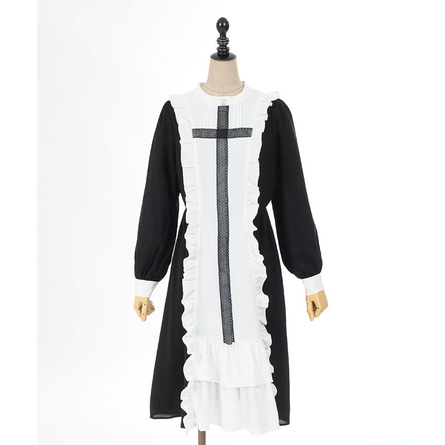 修道服をイメージしたワンピースにレースをクロスにあしらったアイテムです。