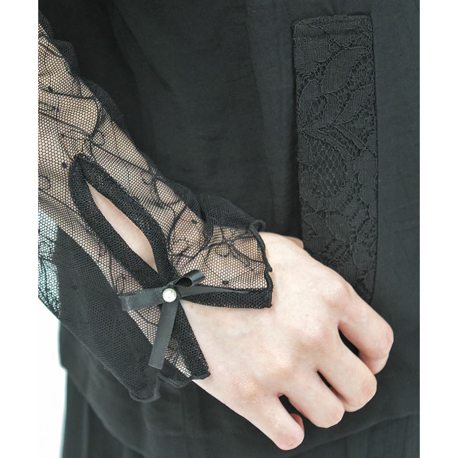 ポケットのフラップにレース生地を重ね、ワンポイントにパールボタンをあしらい、さりげなくフェミニンさをプラス。