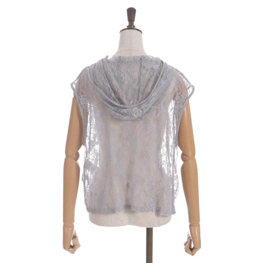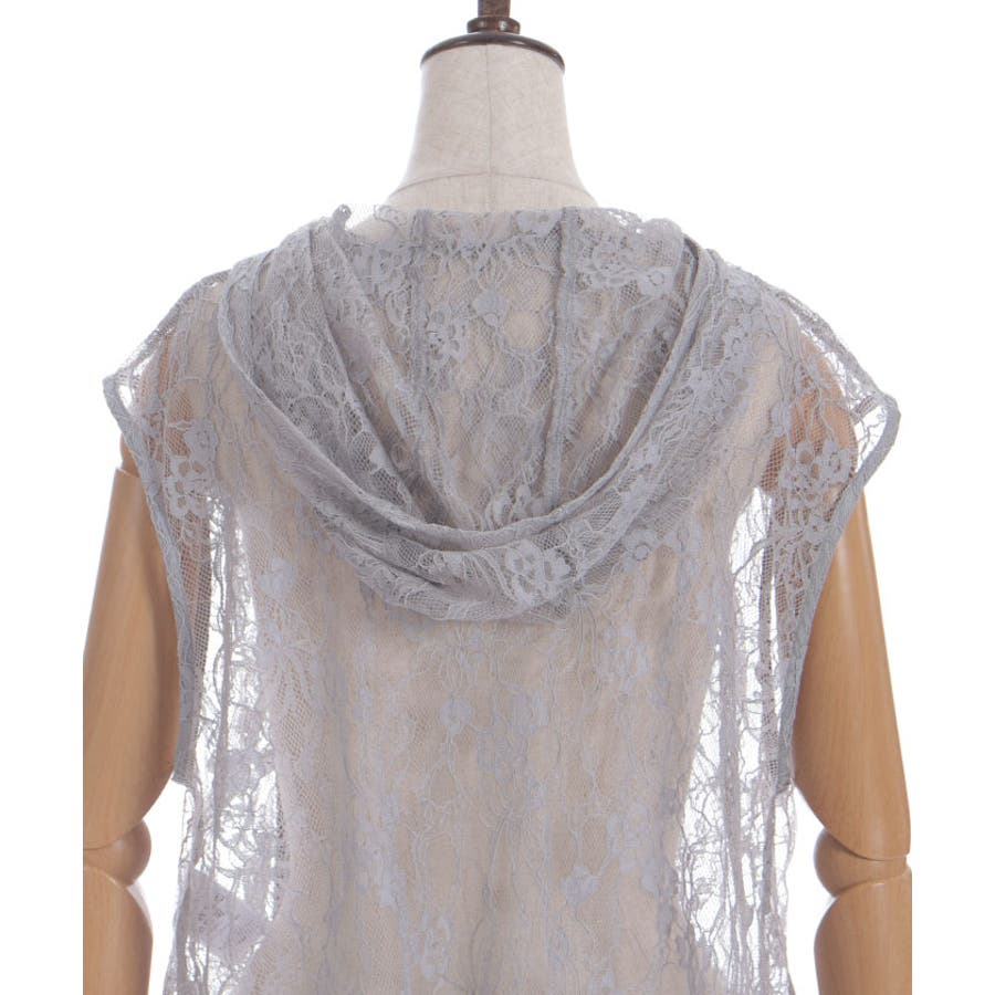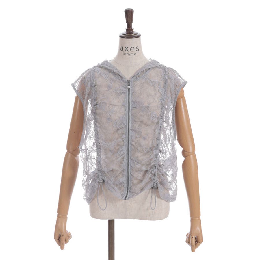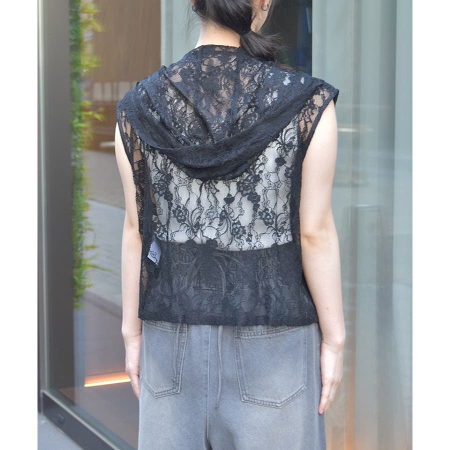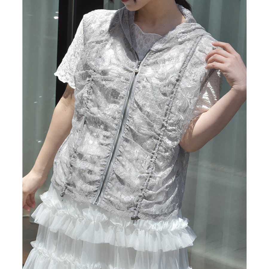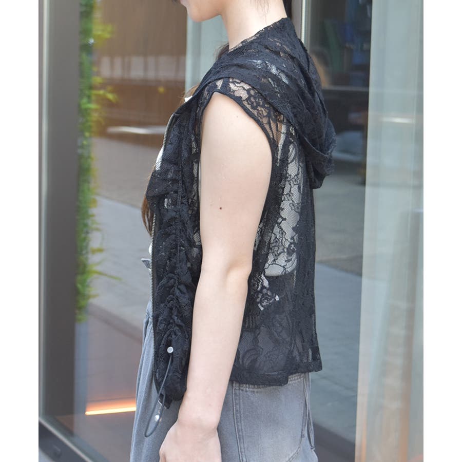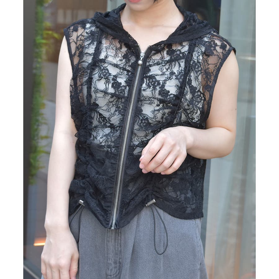 繊細なレース素材とドロストデザインが魅力のフード付きベストはレイヤードスタイルで一気にトレンドライクな印象に仕上がるアイテムです。