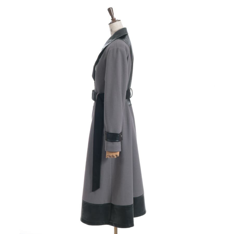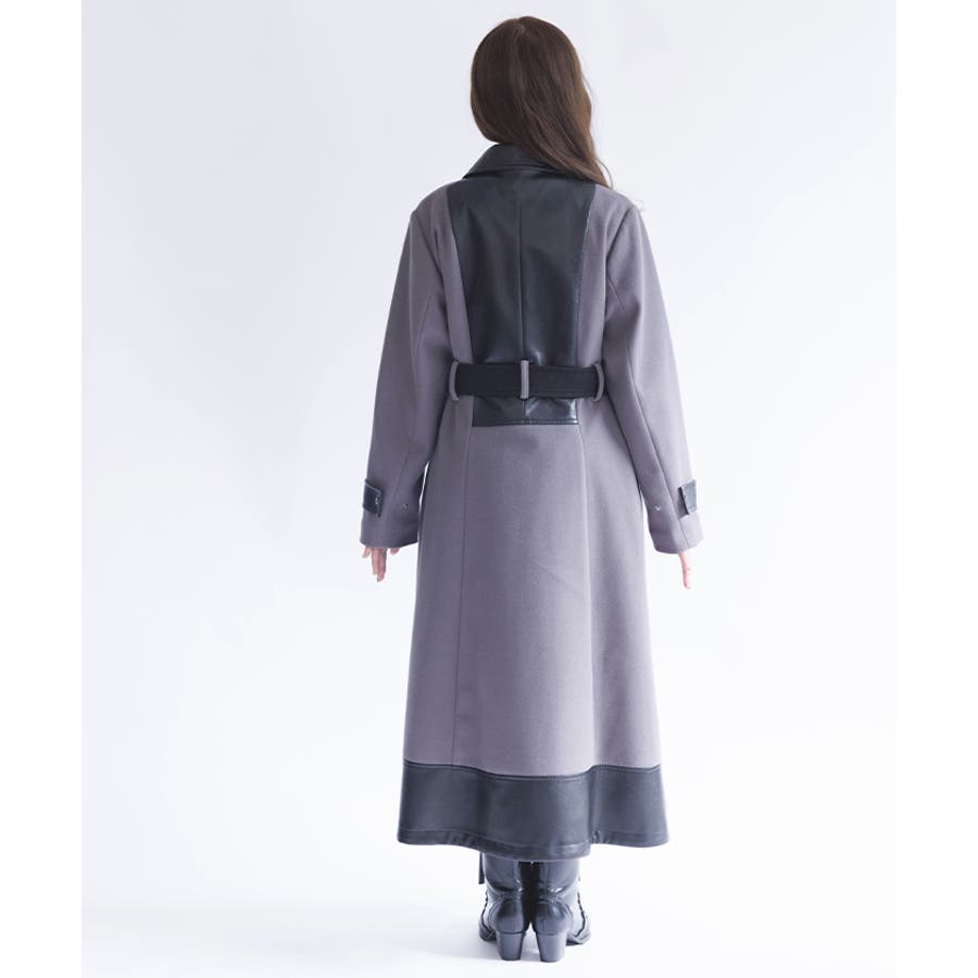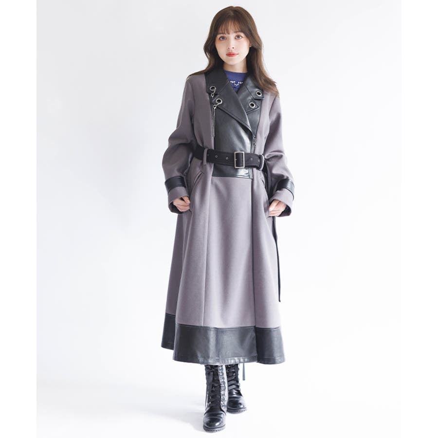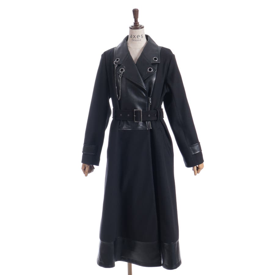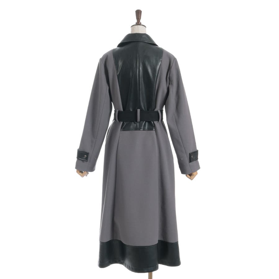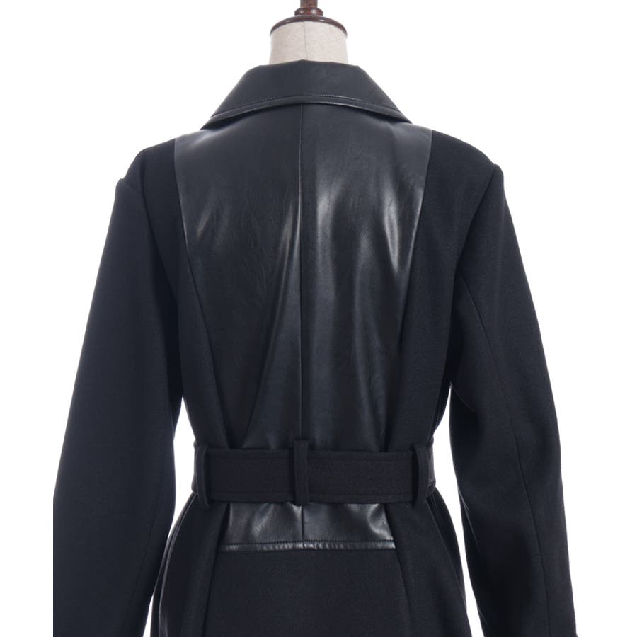 フェイクレザーと異素材の切替がスタイリッシュな印象を与えるロングコート。上品さの中にモードな要素を取り入れ、クールな雰囲気を演出します。