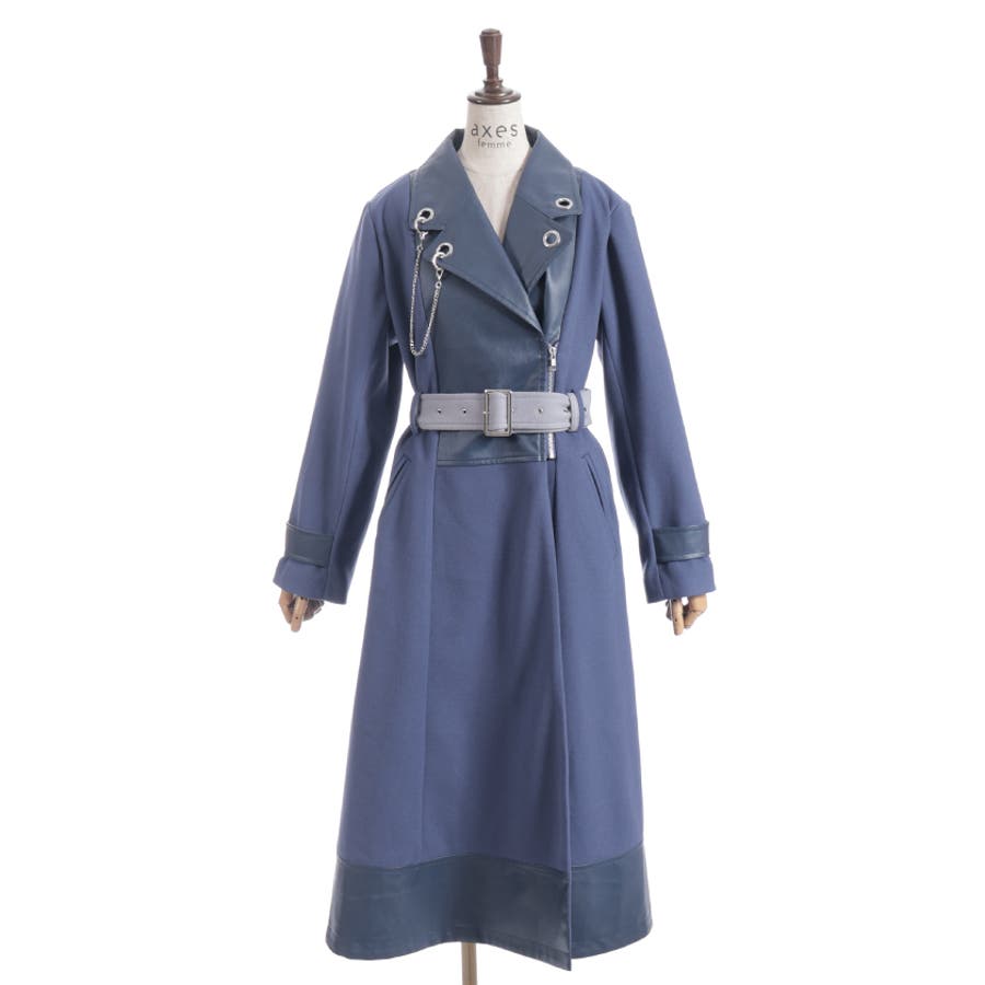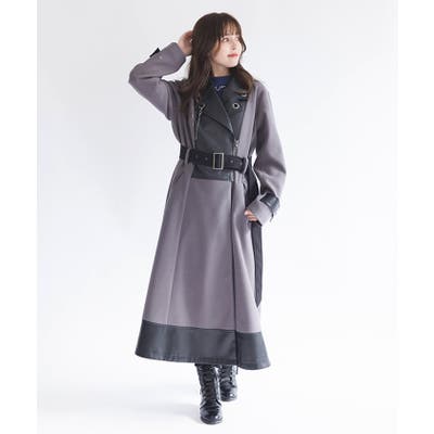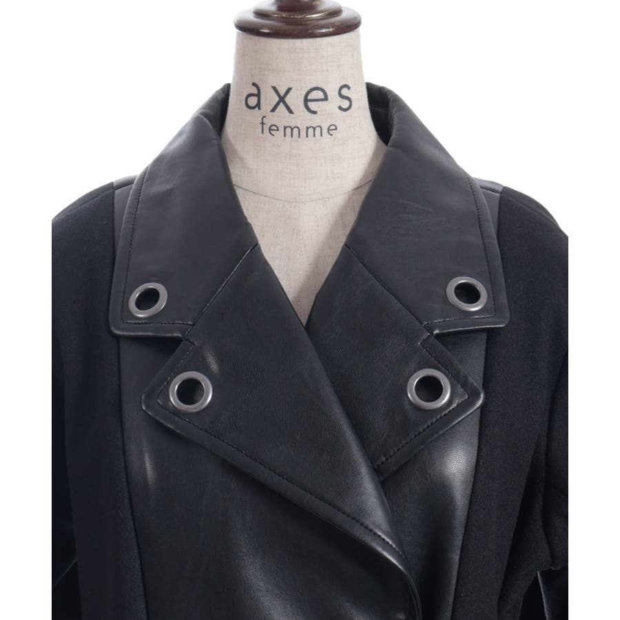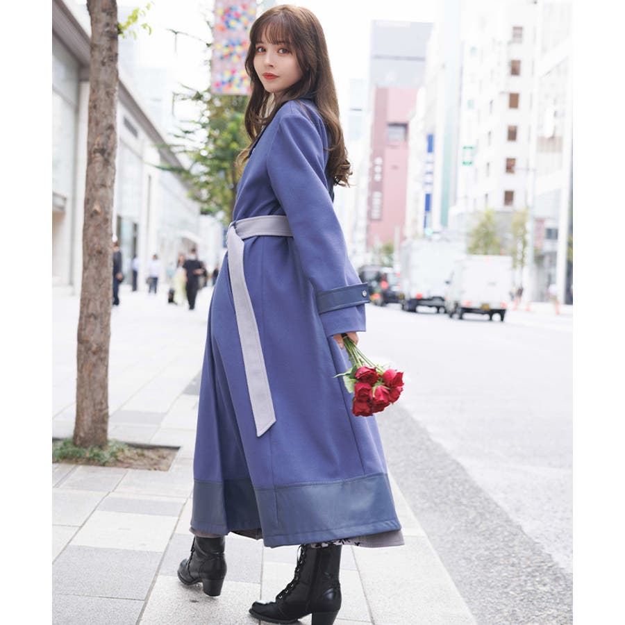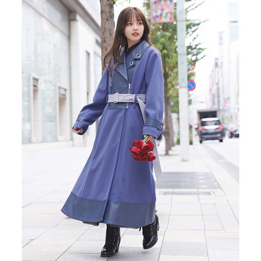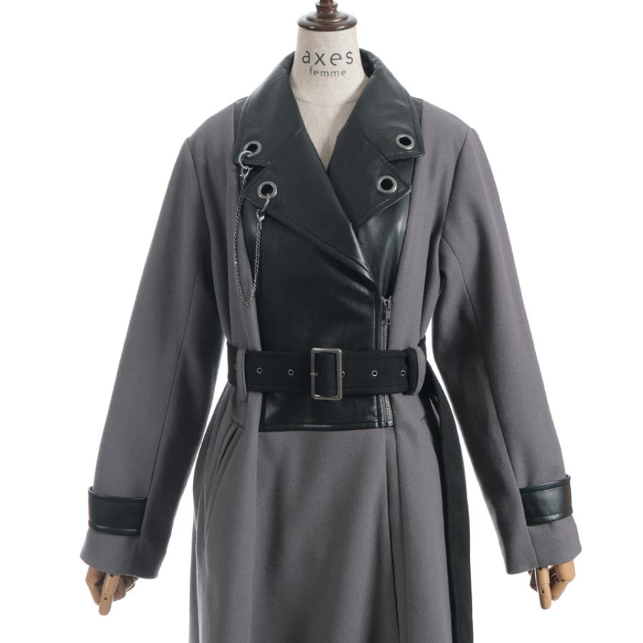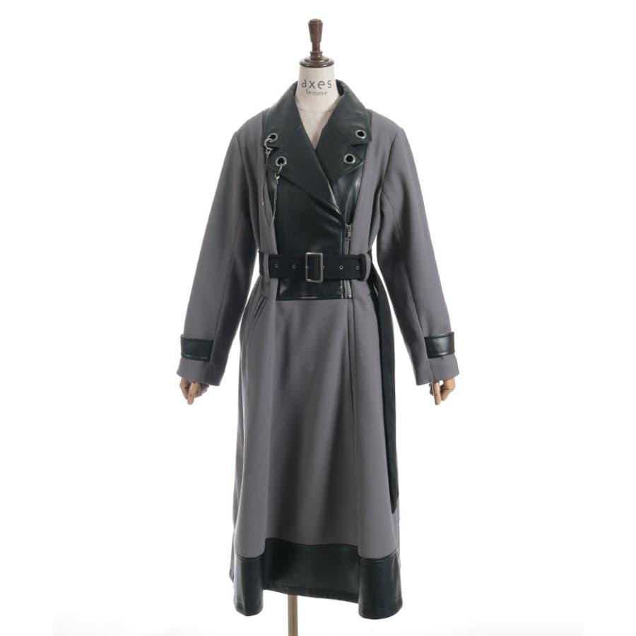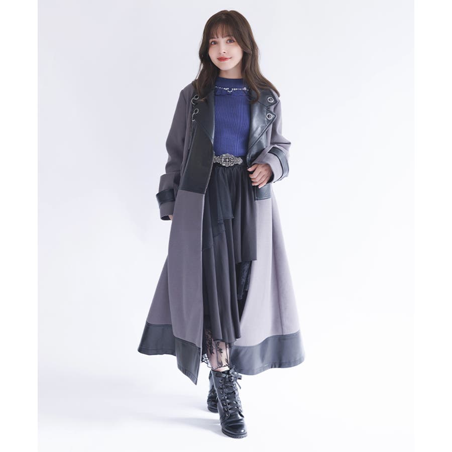 フェイクレザーと異素材の切替がスタイリッシュな印象を与えるロングコート。上品さの中にモードな要素を取り入れ、クールな雰囲気を演出します。