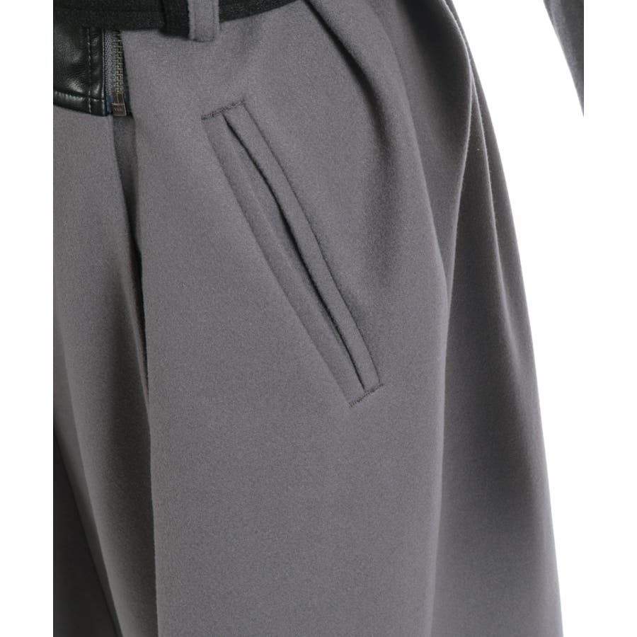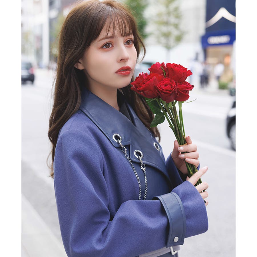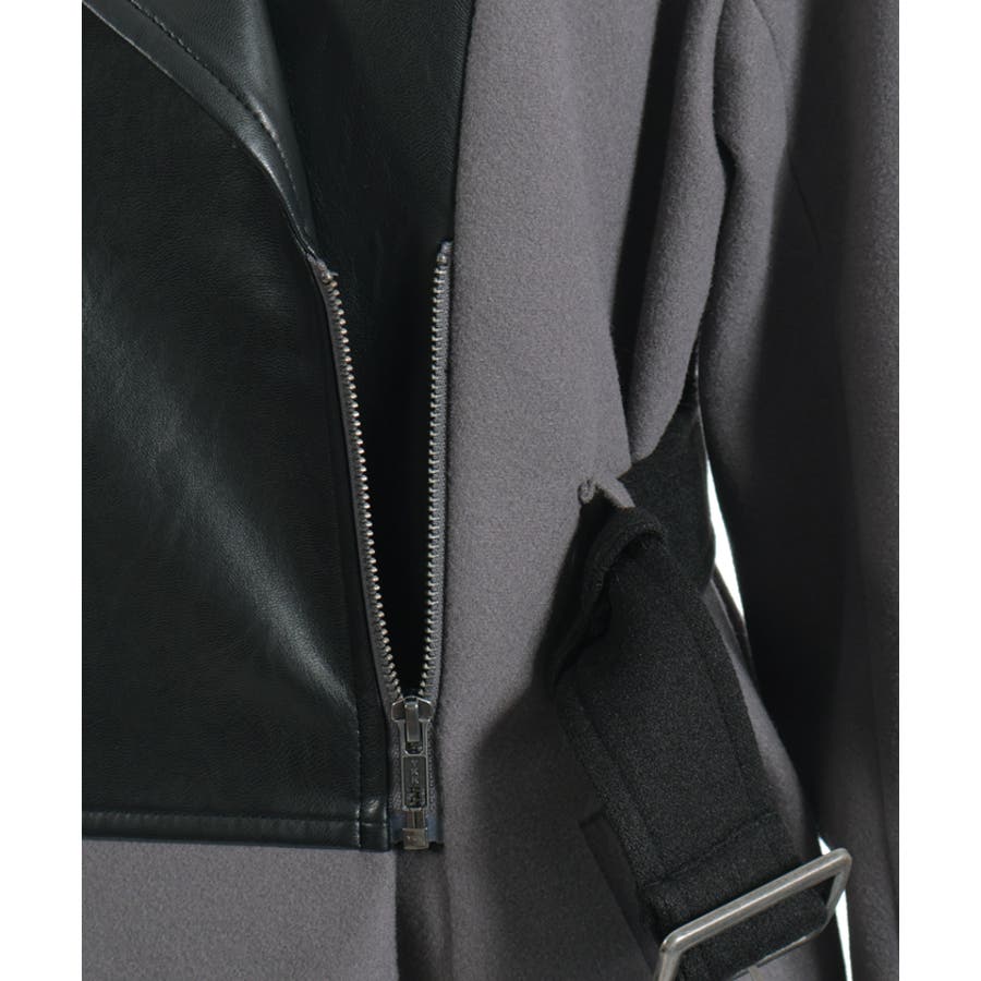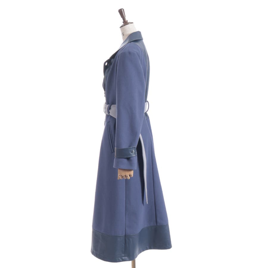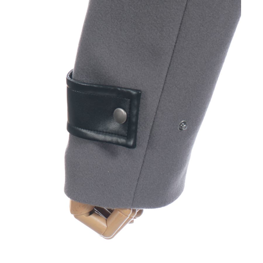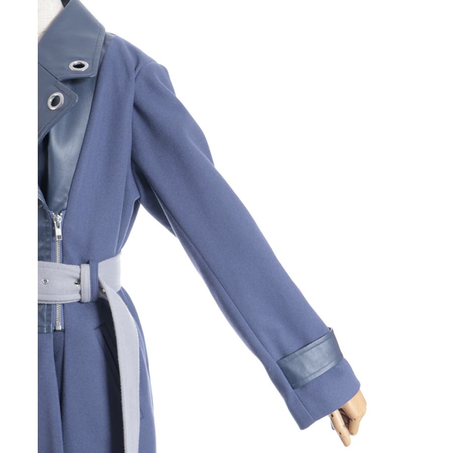 フェイクレザーと異素材の切替がスタイリッシュな印象を与えるロングコート。上品さの中にモードな要素を取り入れ、クールな雰囲気を演出します。