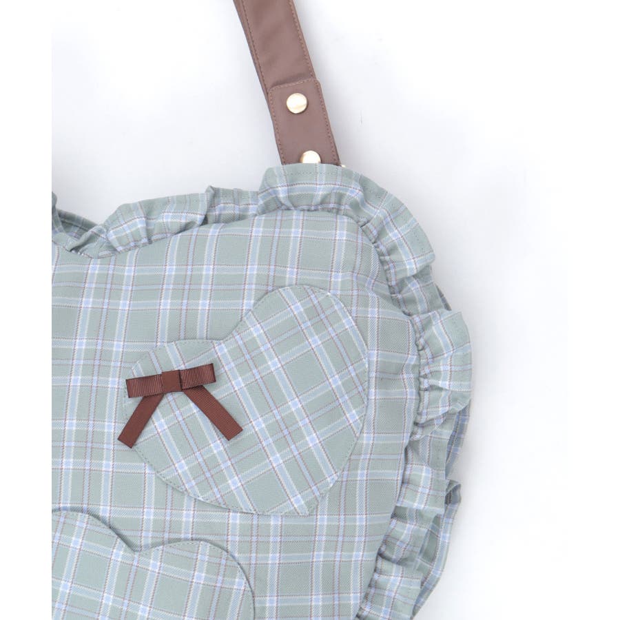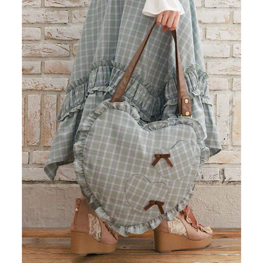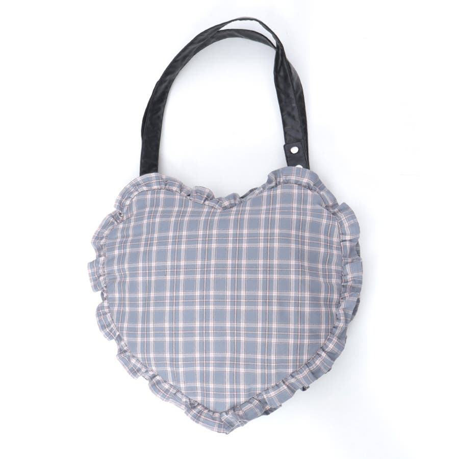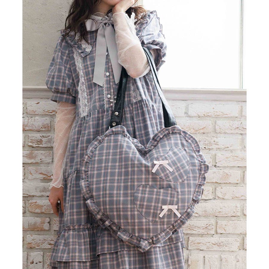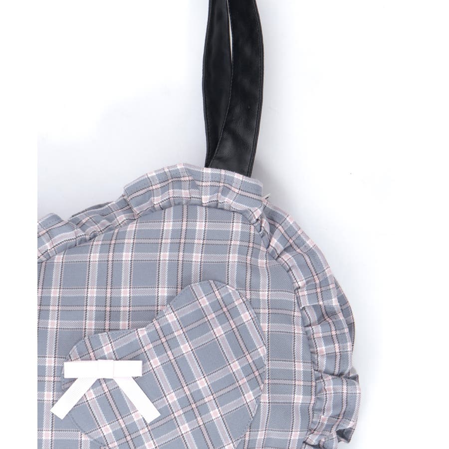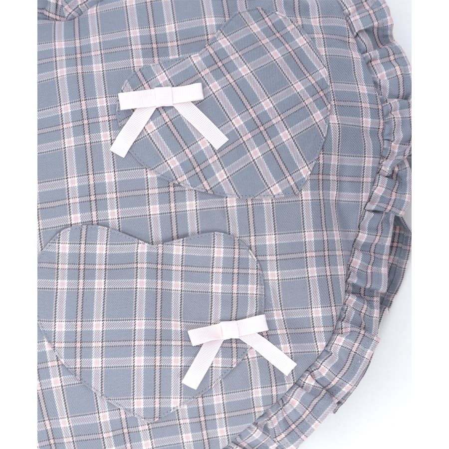 立体的なハートフォルムに、ブランドオリジナルのチェック柄を落とし込んだデザイン。フロントにはハート型ポケットとリボン付きの外ポケットをあしらい、甘さのあるアクセントに仕上げています。縁のフリルディテールがより可愛らしさを引き立て、持つだけで存在感のあるスタイルに。【コーディネート】