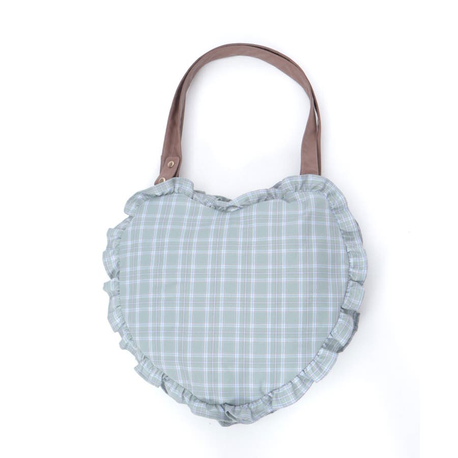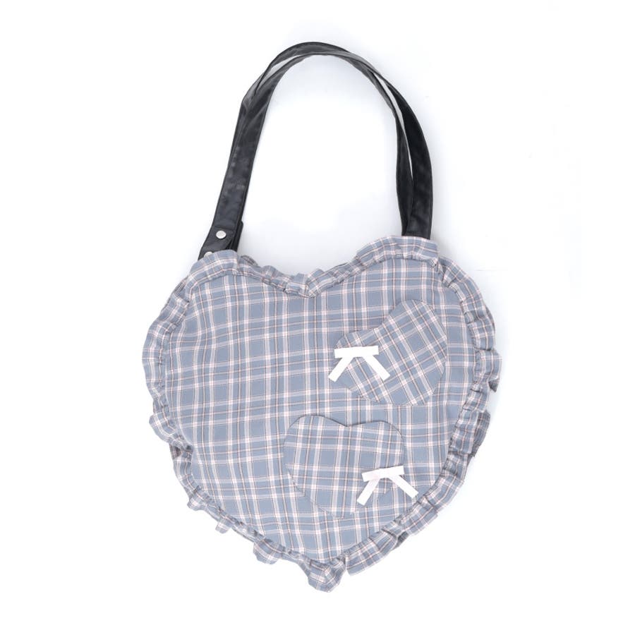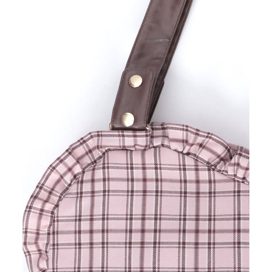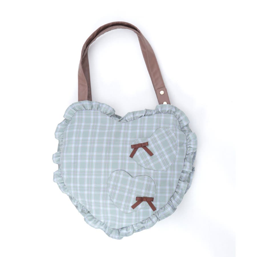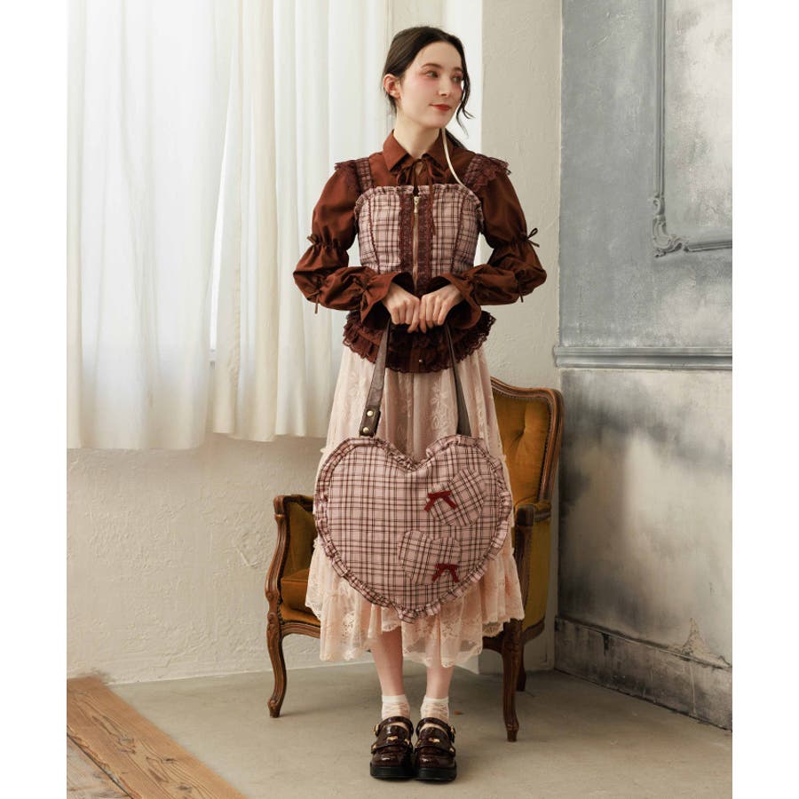 立体的なハートフォルムに、ブランドオリジナルのチェック柄を落とし込んだデザイン。フロントにはハート型ポケットとリボン付きの外ポケットをあしらい、甘さのあるアクセントに仕上げています。縁のフリルディテールがより可愛らしさを引き立て、持つだけで存在感のあるスタイルに。【コーディネート】