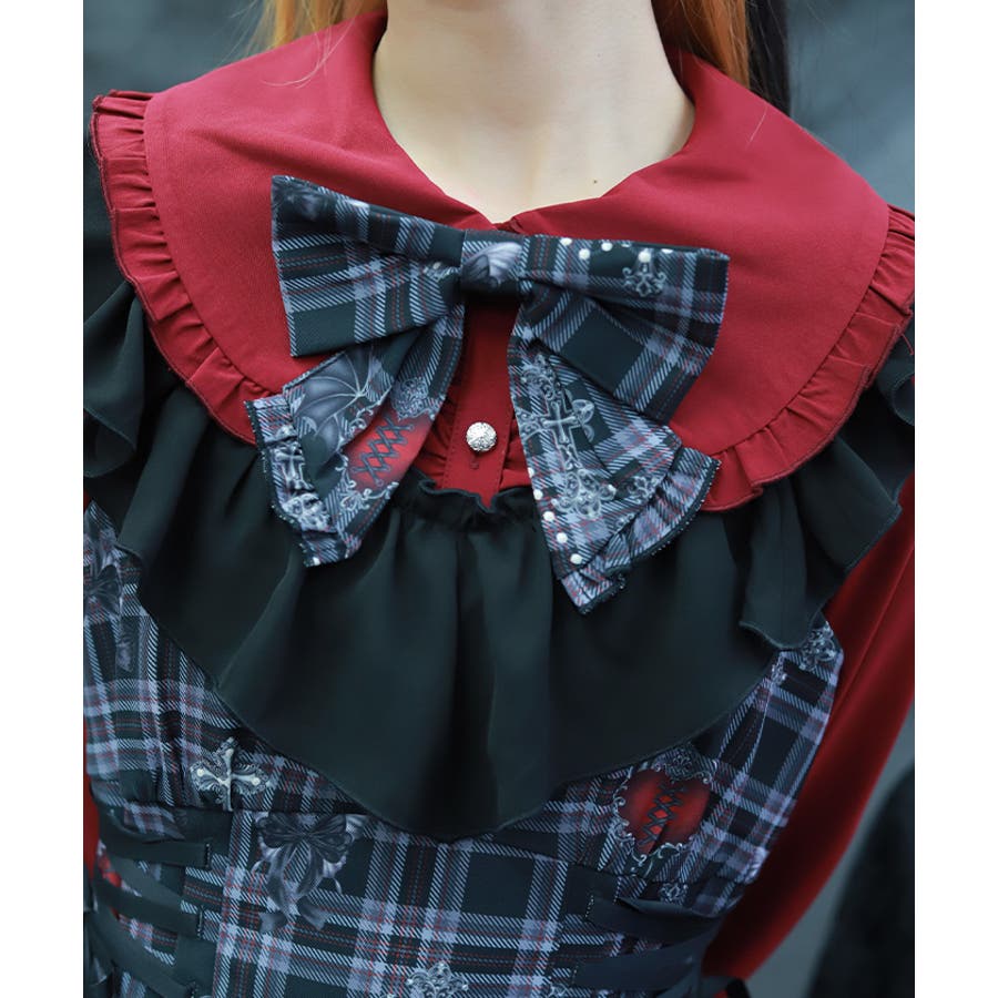 チェック柄にデビルハートなどのダークなモチーフを散りばめたオリジナルプリントのリボンがポイント!