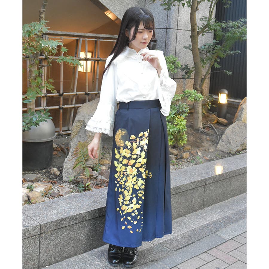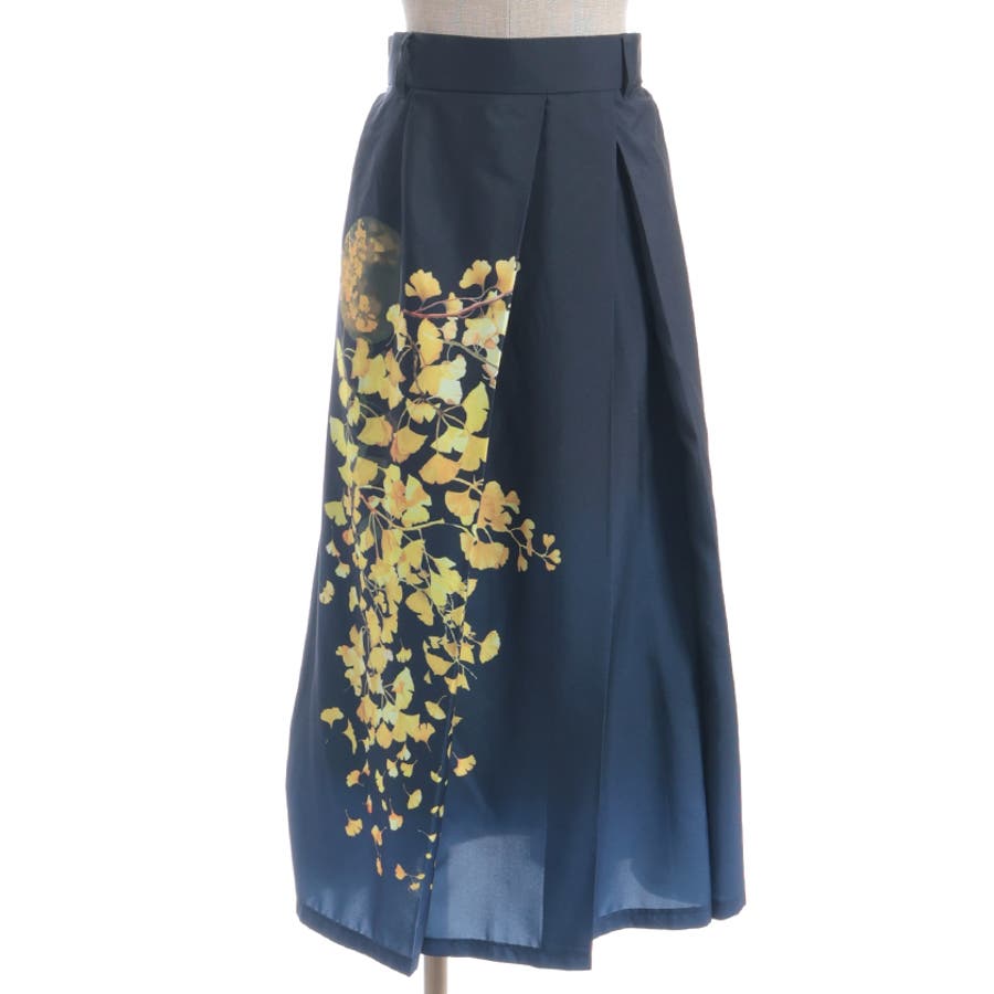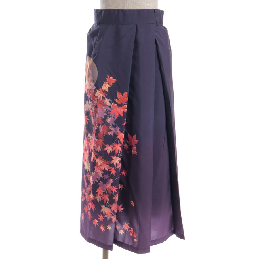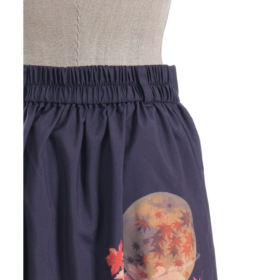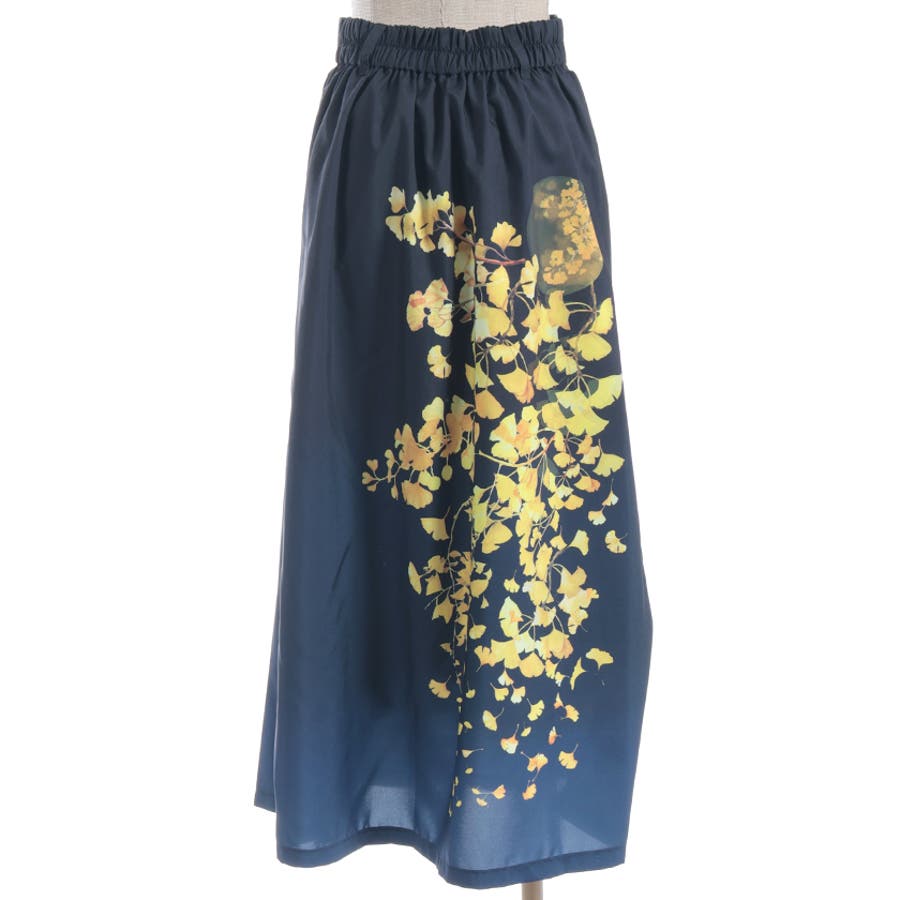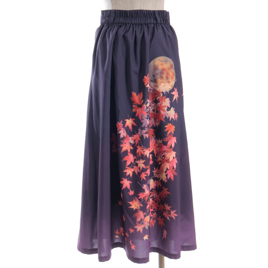 日本の秋を感じさせる、紅葉【楓】【銀杏】をモチーフにしたアートプリントスカート。静謐な夜空に浮かぶ月と舞い散る葉が印象的で、まるで一枚の日本画のような美しさを楽しめます。