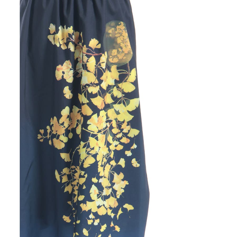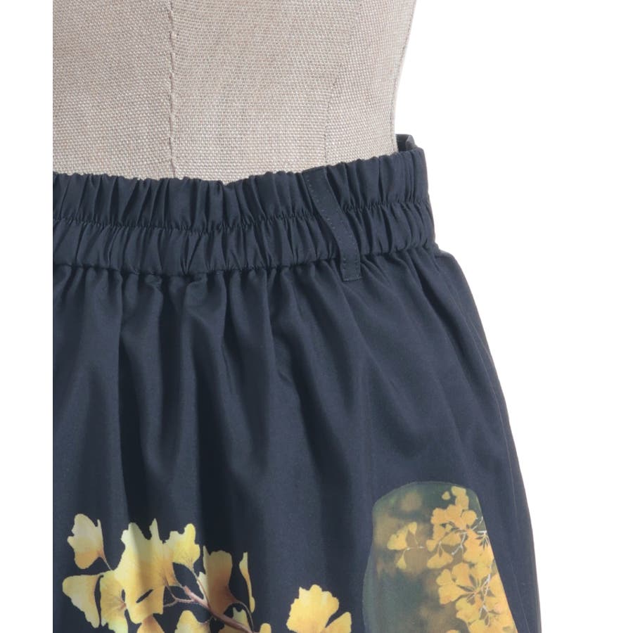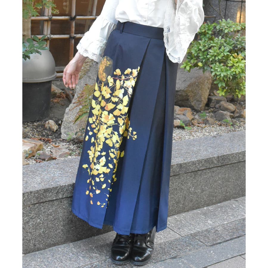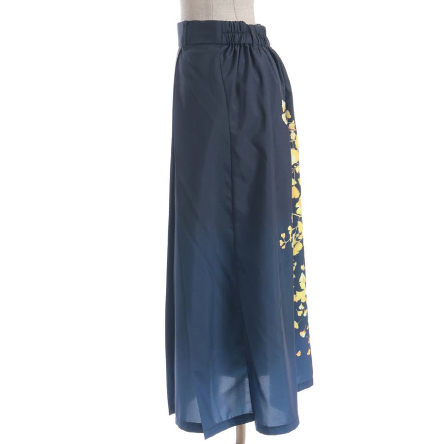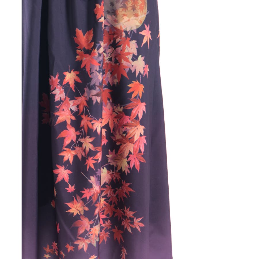 日本の秋を感じさせる、紅葉【楓】【銀杏】をモチーフにしたアートプリントスカート。静謐な夜空に浮かぶ月と舞い散る葉が印象的で、まるで一枚の日本画のような美しさを楽しめます。