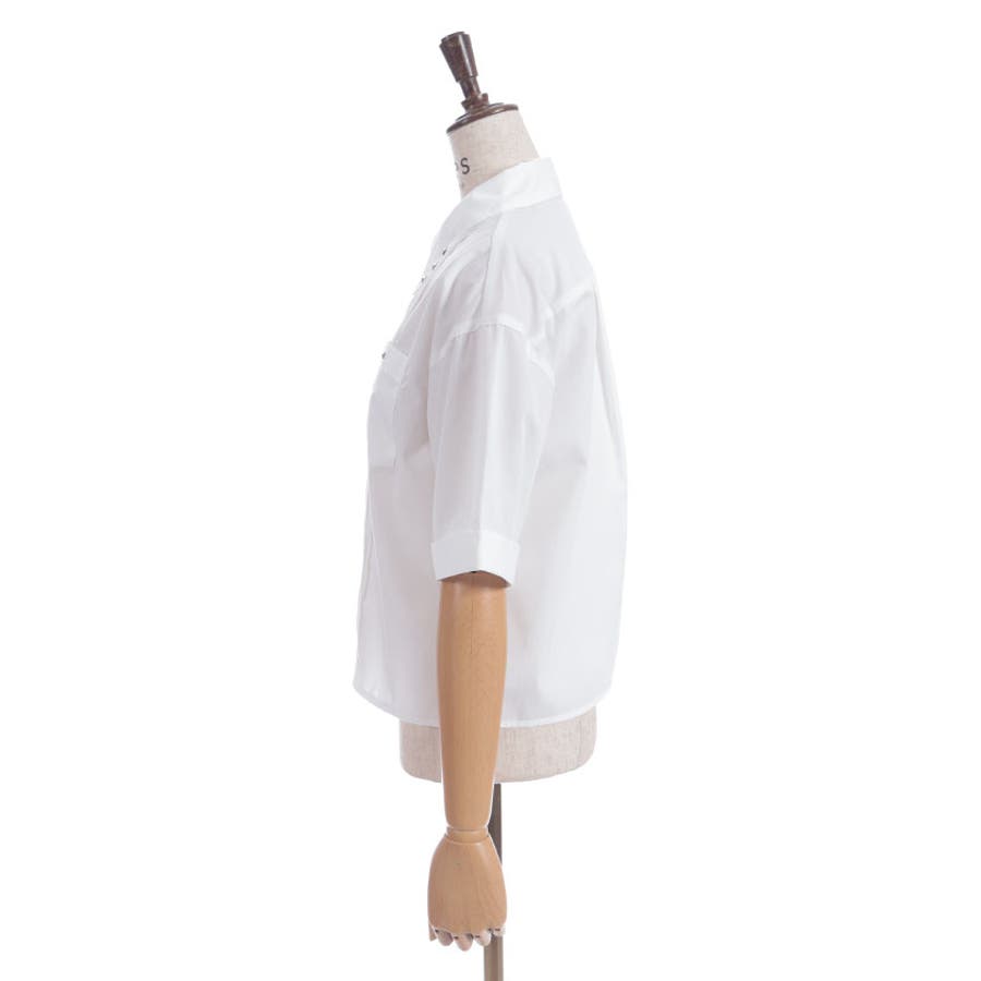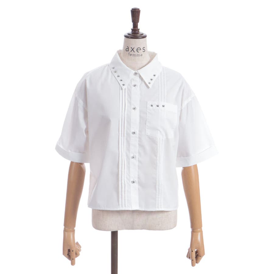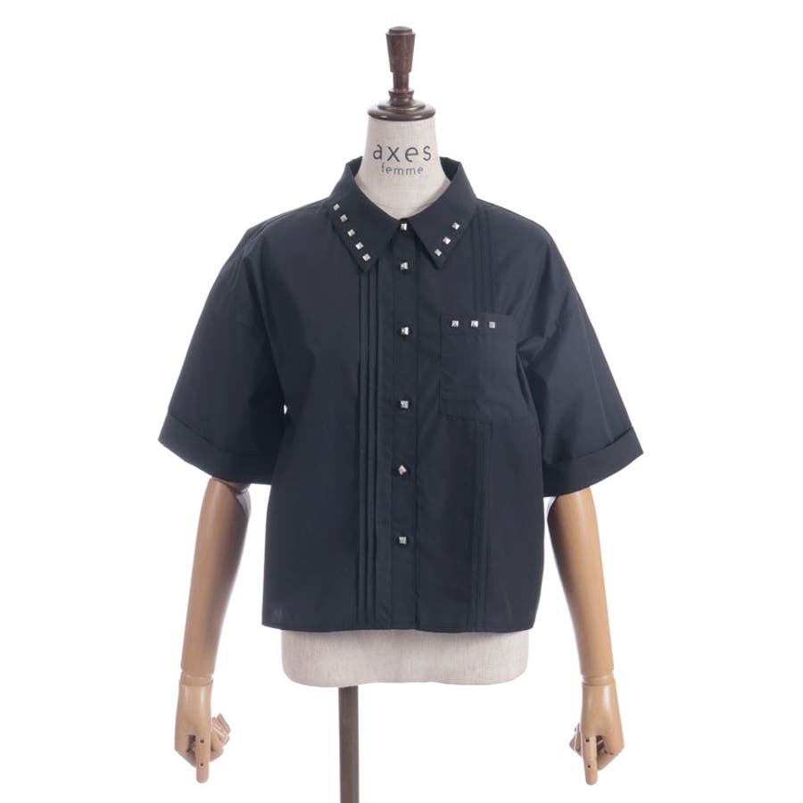 モードな印象をプラスするスタッズ付きシャツブラウス。