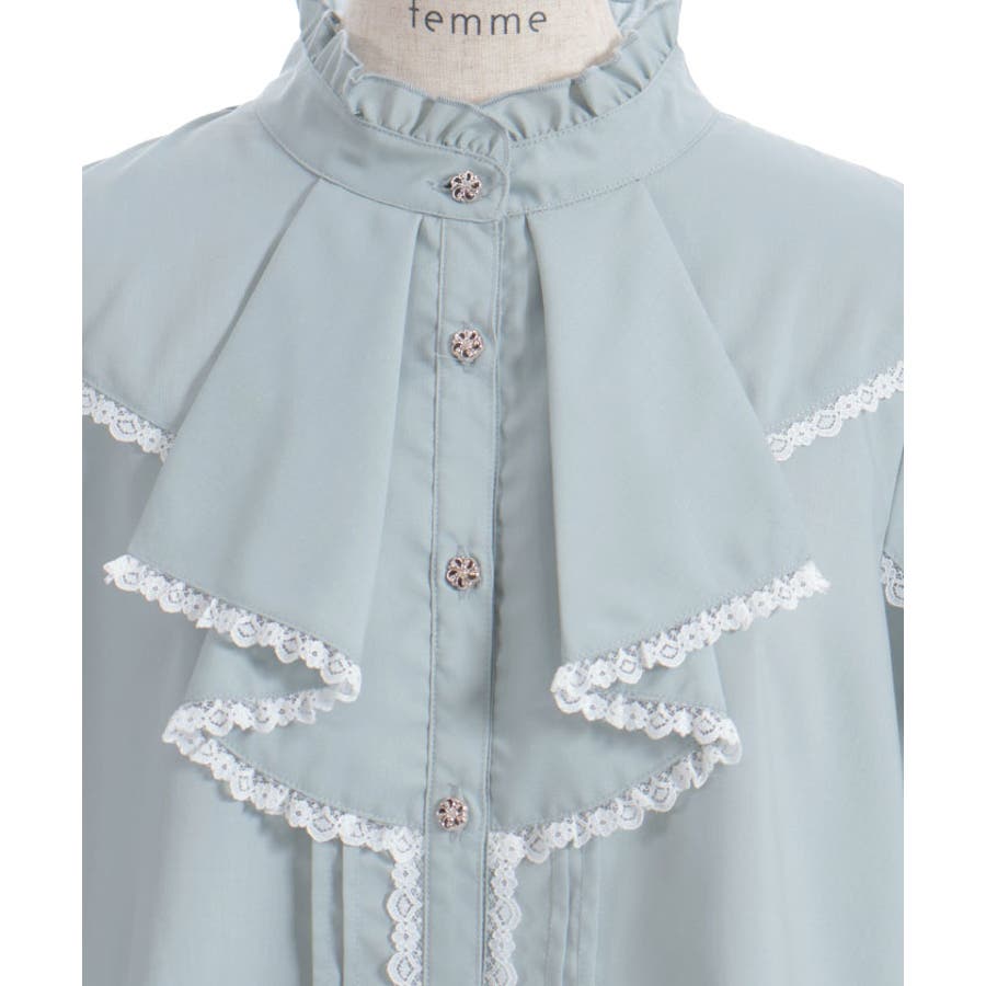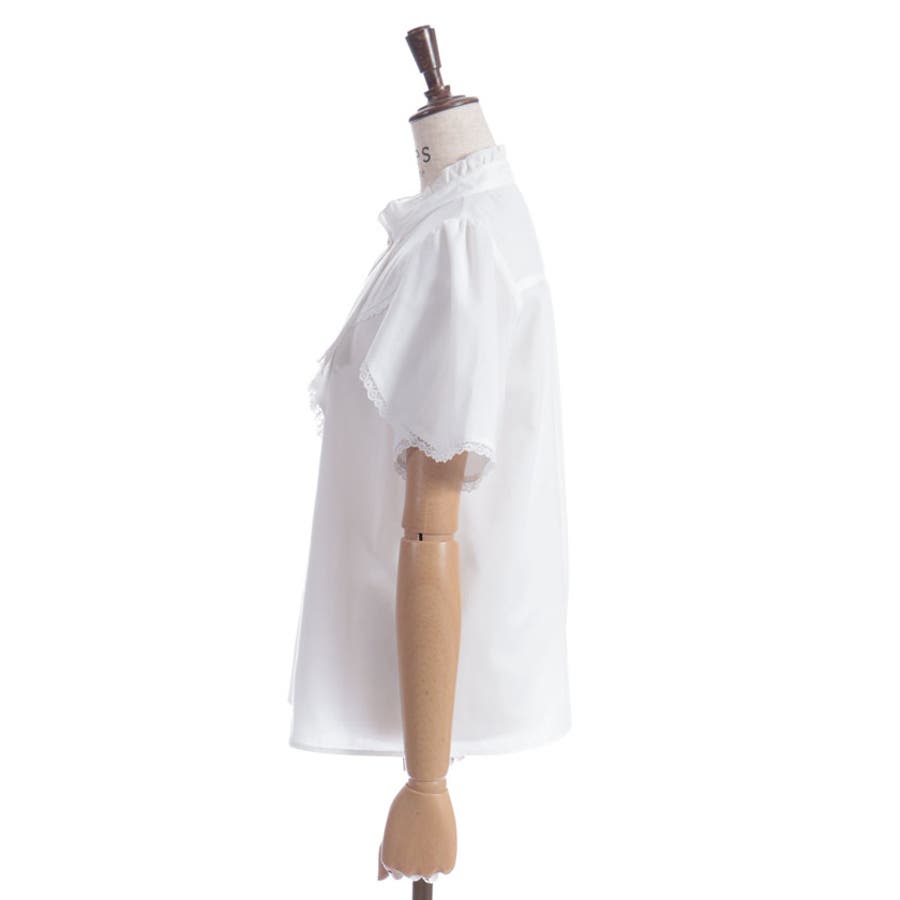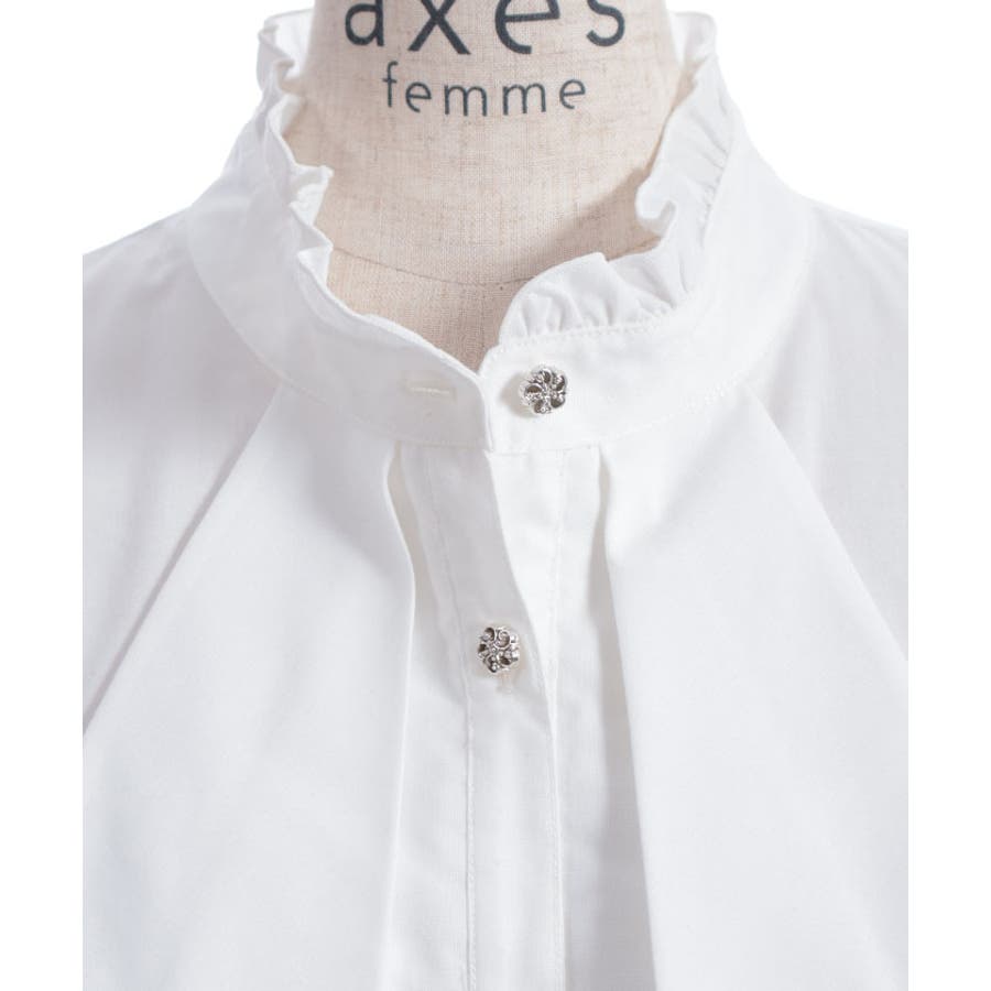 フロントのラッフルフリルがクラシカルでレディライクな印象を演出するブラウス。綿混素材で肌触りも良く、デイリーに取り入れやすいのが魅力。