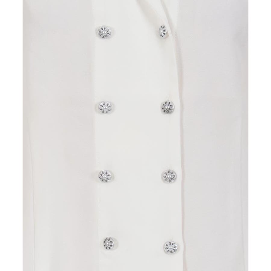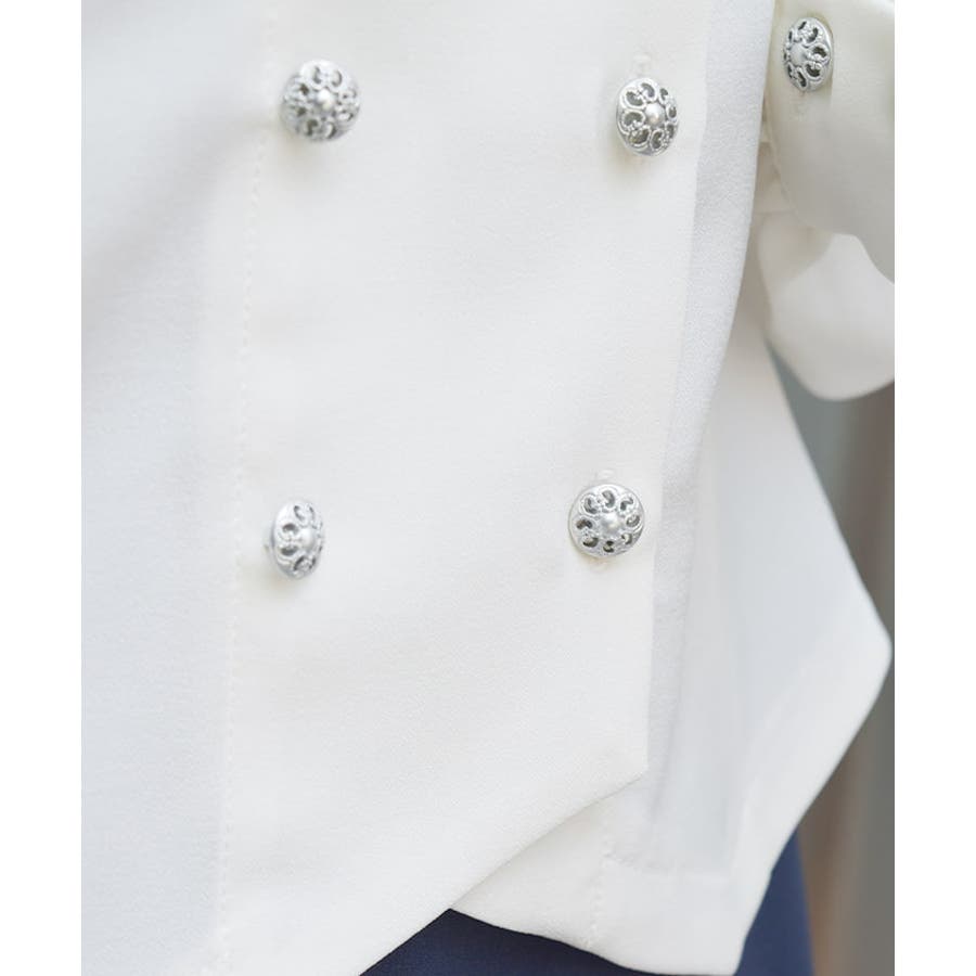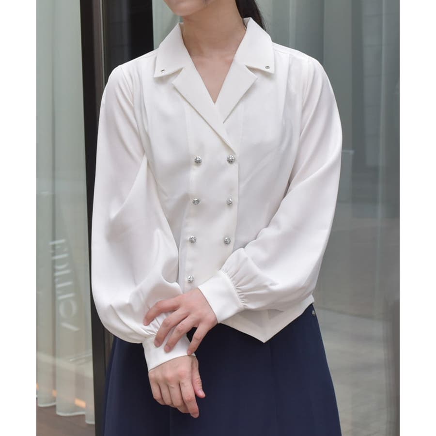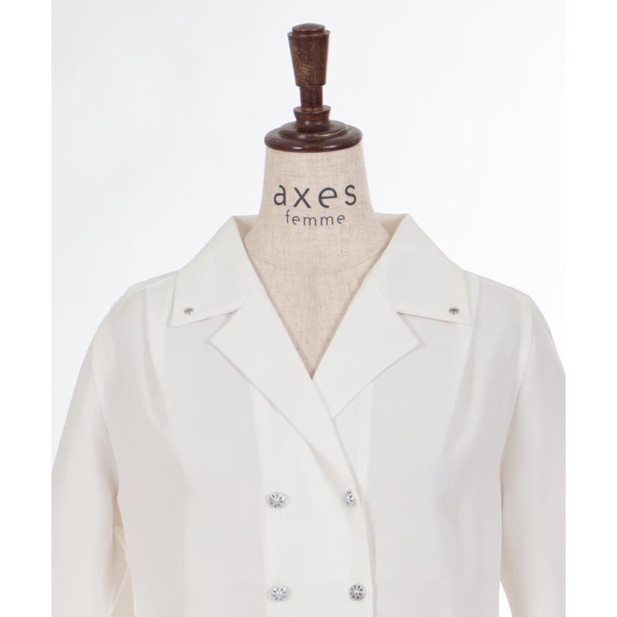 広めの開襟はデコルテラインをきれいにみせ顔回りを明るい印象に。ダブルボタンでクラシカルなディティールをプラスしました。