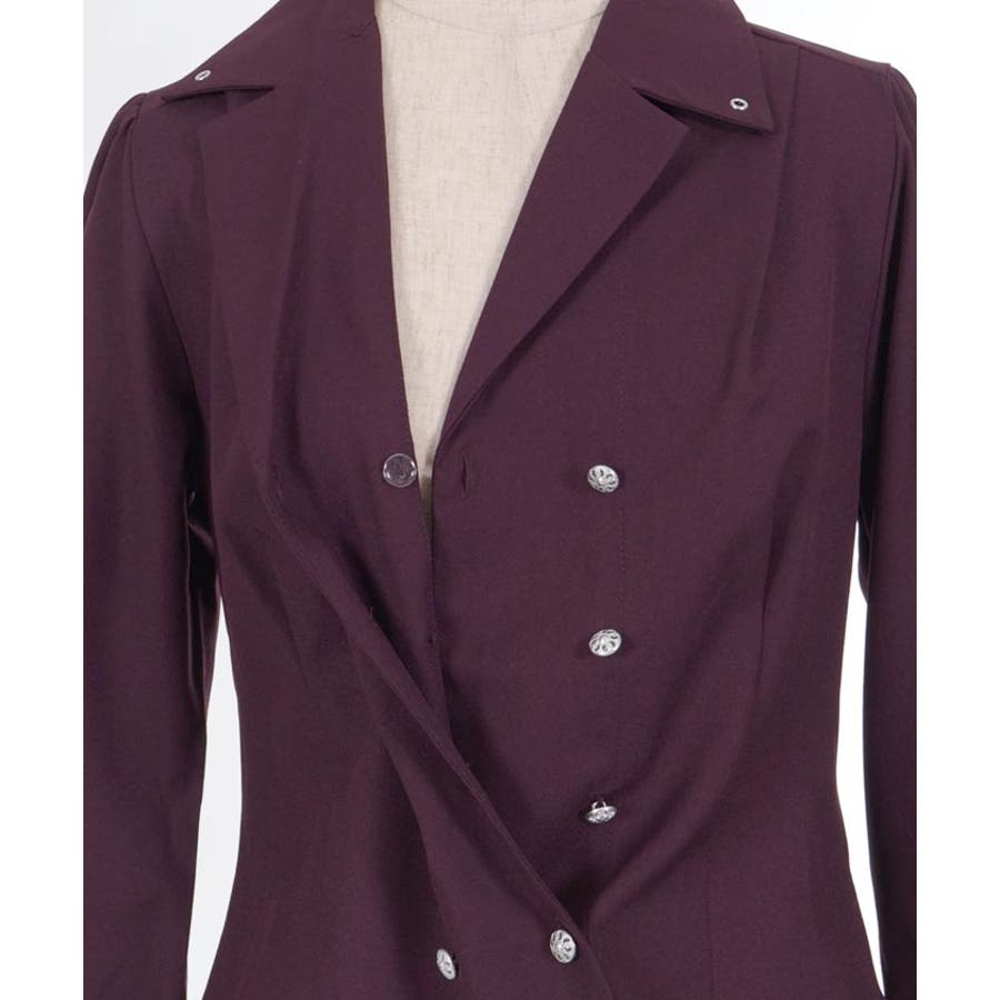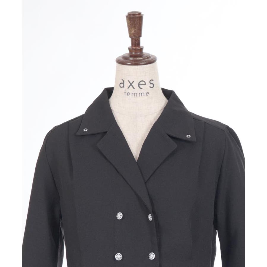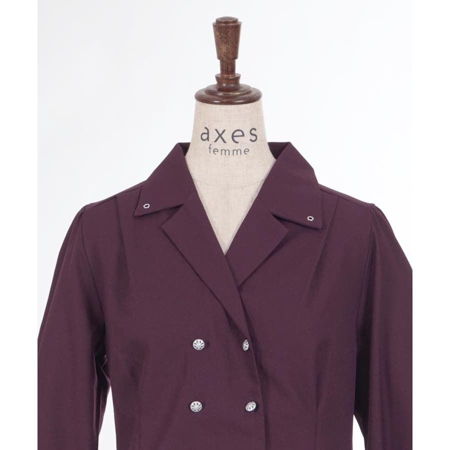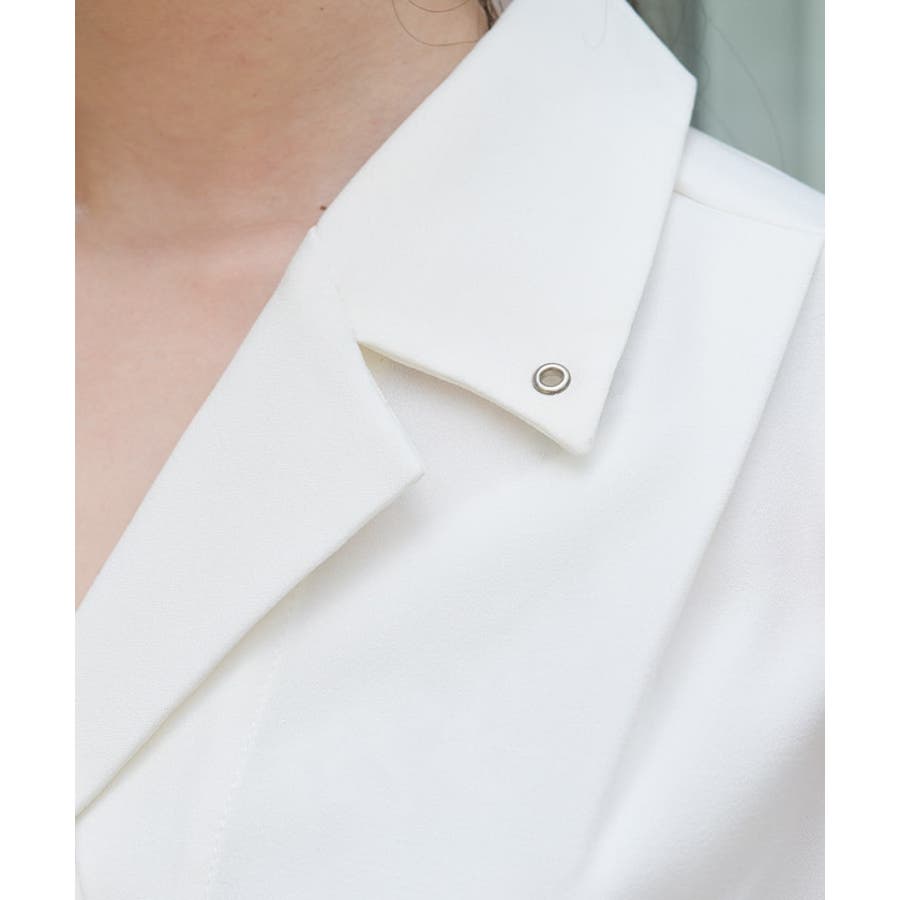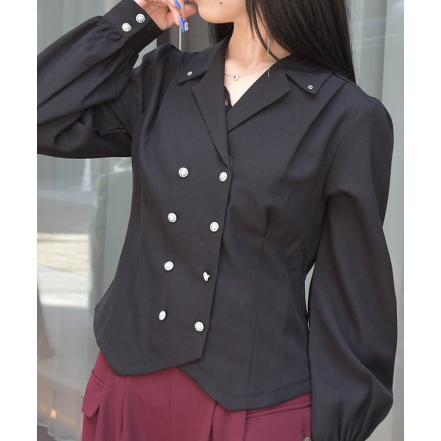 広めの開襟はデコルテラインをきれいにみせ顔回りを明るい印象に。ダブルボタンでクラシカルなディティールをプラスしました。