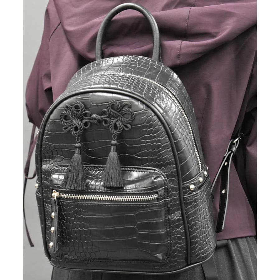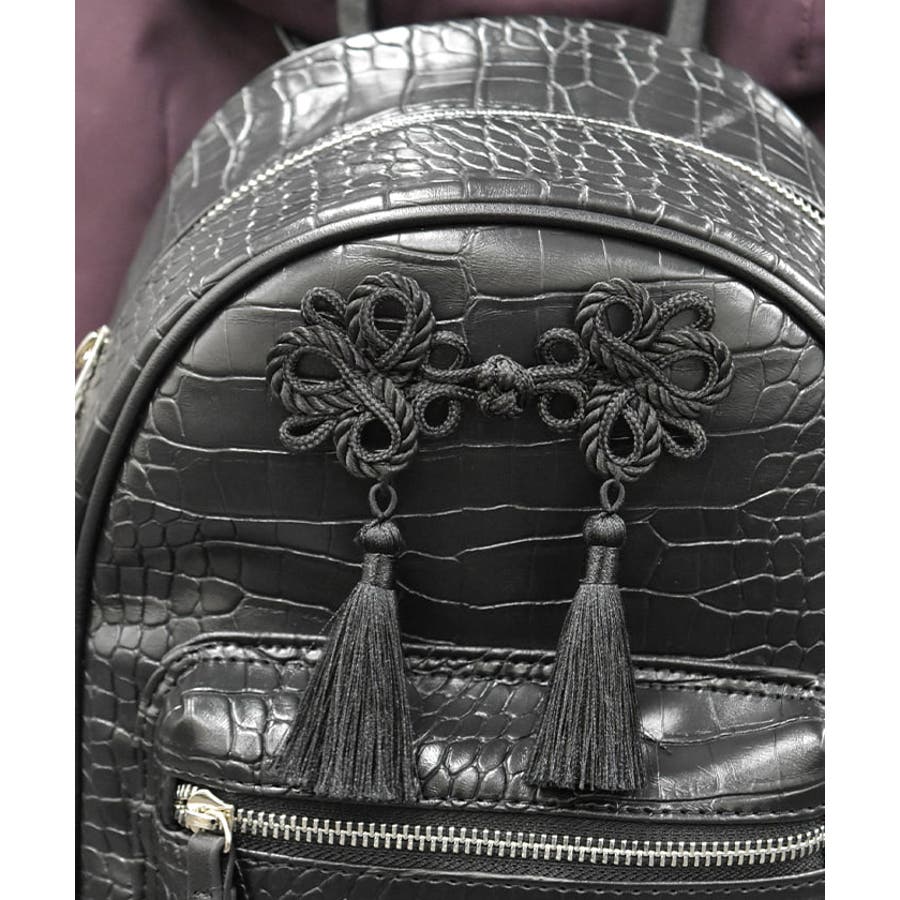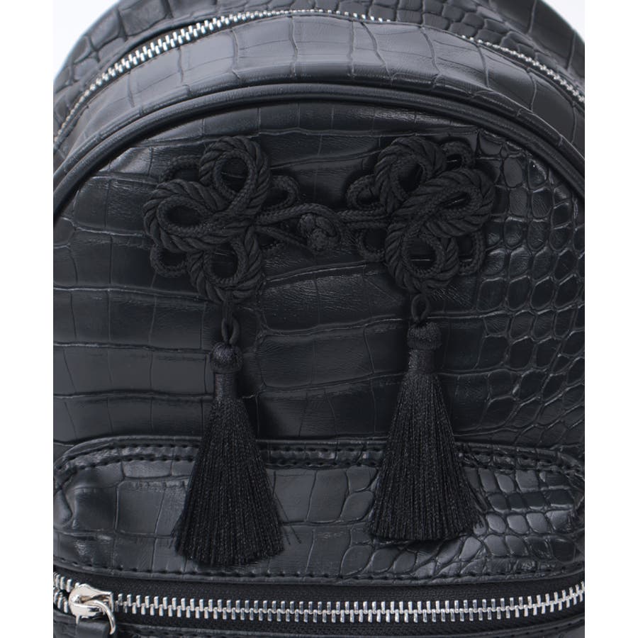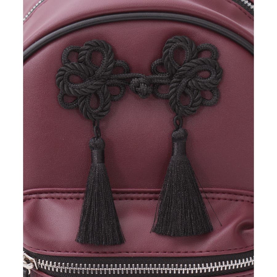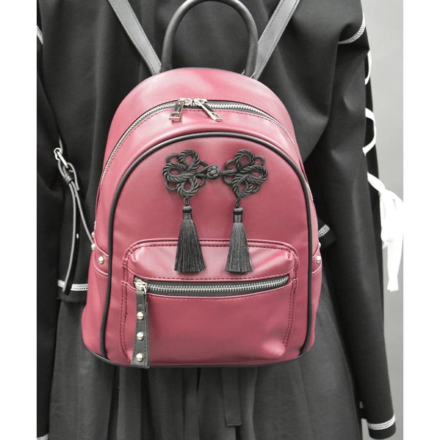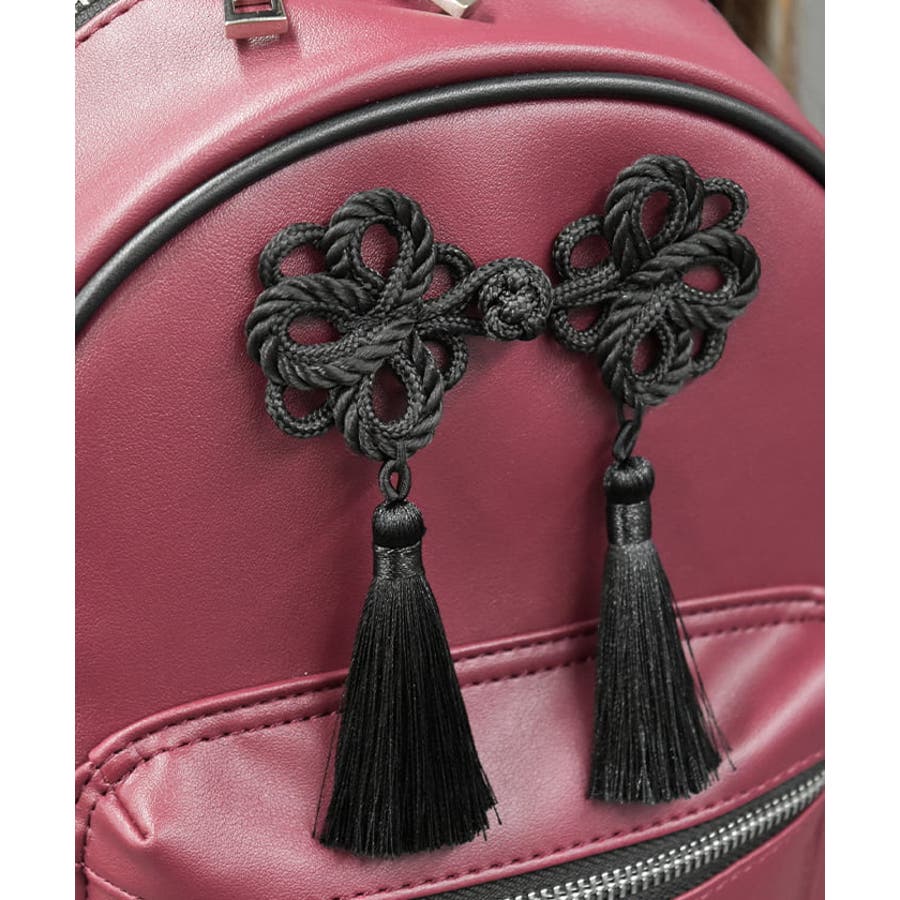 マチがたっぷりあり、容量も大き目のミニリュックです。黒はクロコダイルの型押し合皮で、ワインは無地の合皮です。チャイナ釦にあしらったタッセルが揺れて可愛いデザインです。