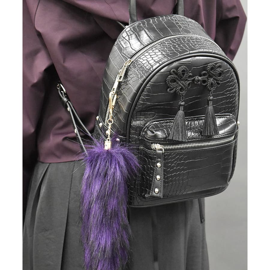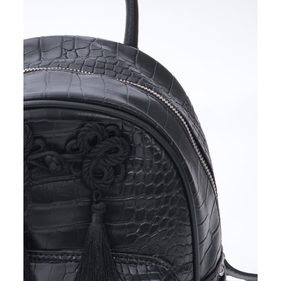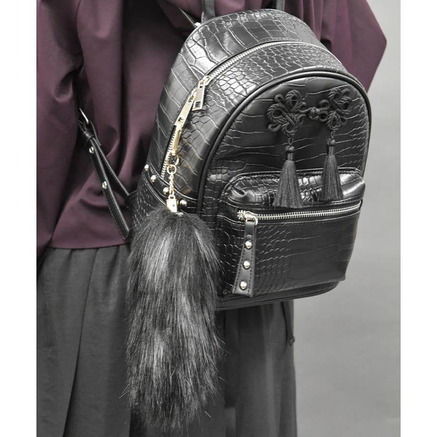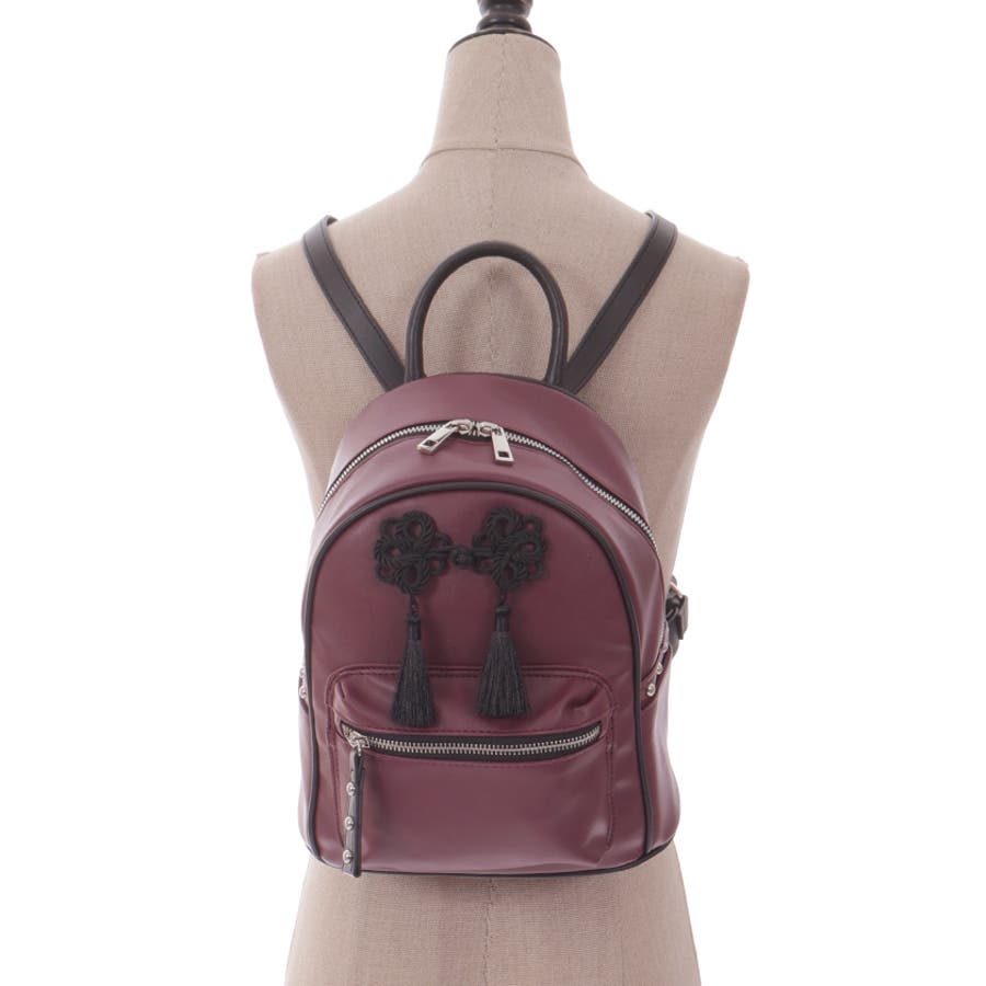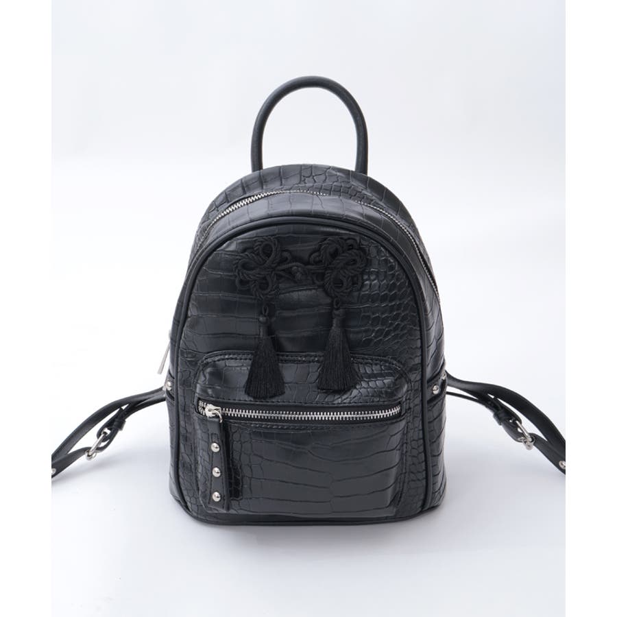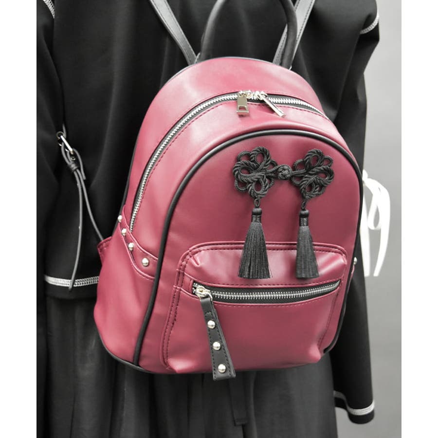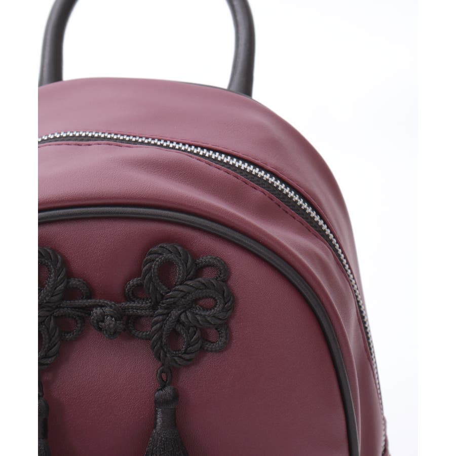 マチがたっぷりあり、容量も大き目のミニリュックです。黒はクロコダイルの型押し合皮で、ワインは無地の合皮です。チャイナ釦にあしらったタッセルが揺れて可愛いデザインです。