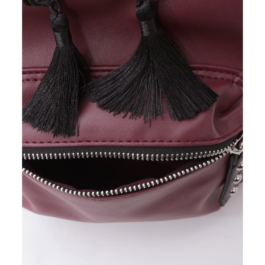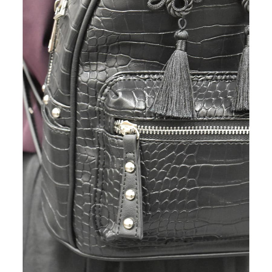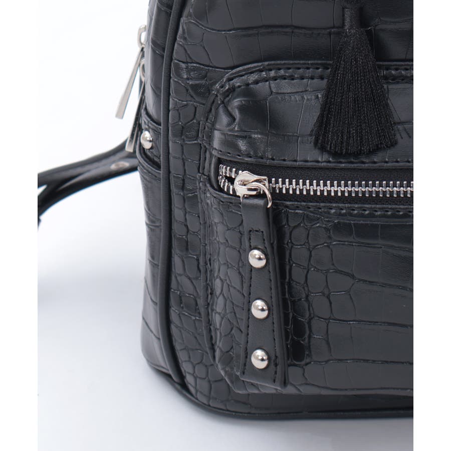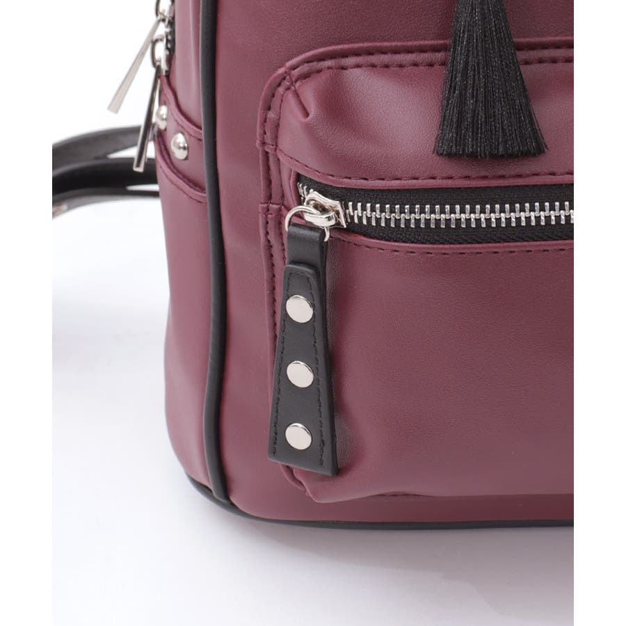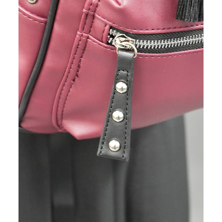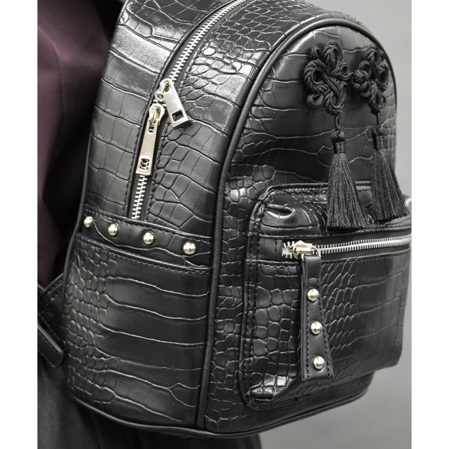 マチがたっぷりあり、容量も大き目のミニリュックです。黒はクロコダイルの型押し合皮で、ワインは無地の合皮です。チャイナ釦にあしらったタッセルが揺れて可愛いデザインです。