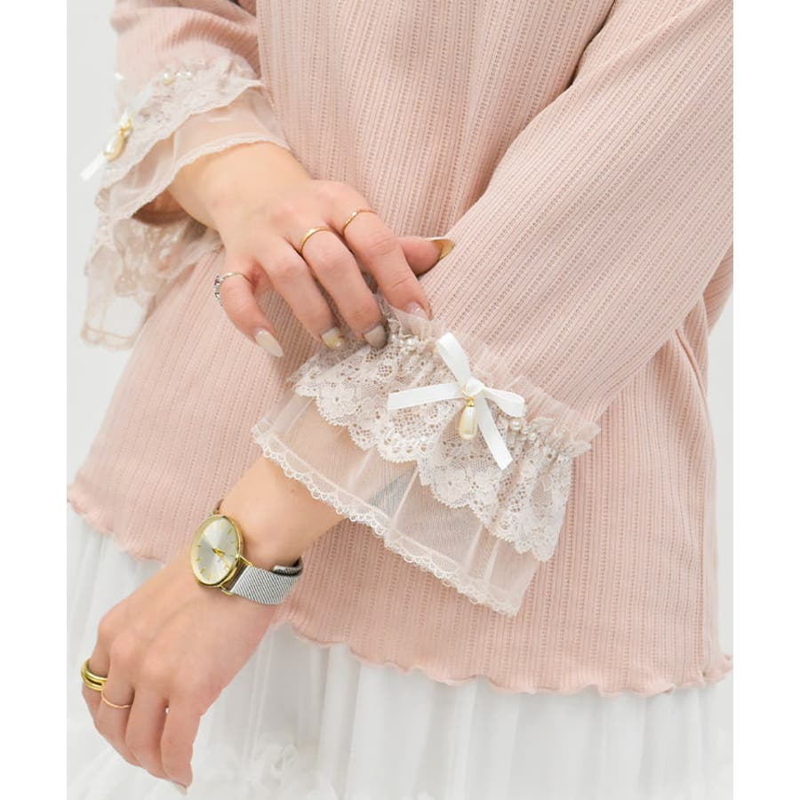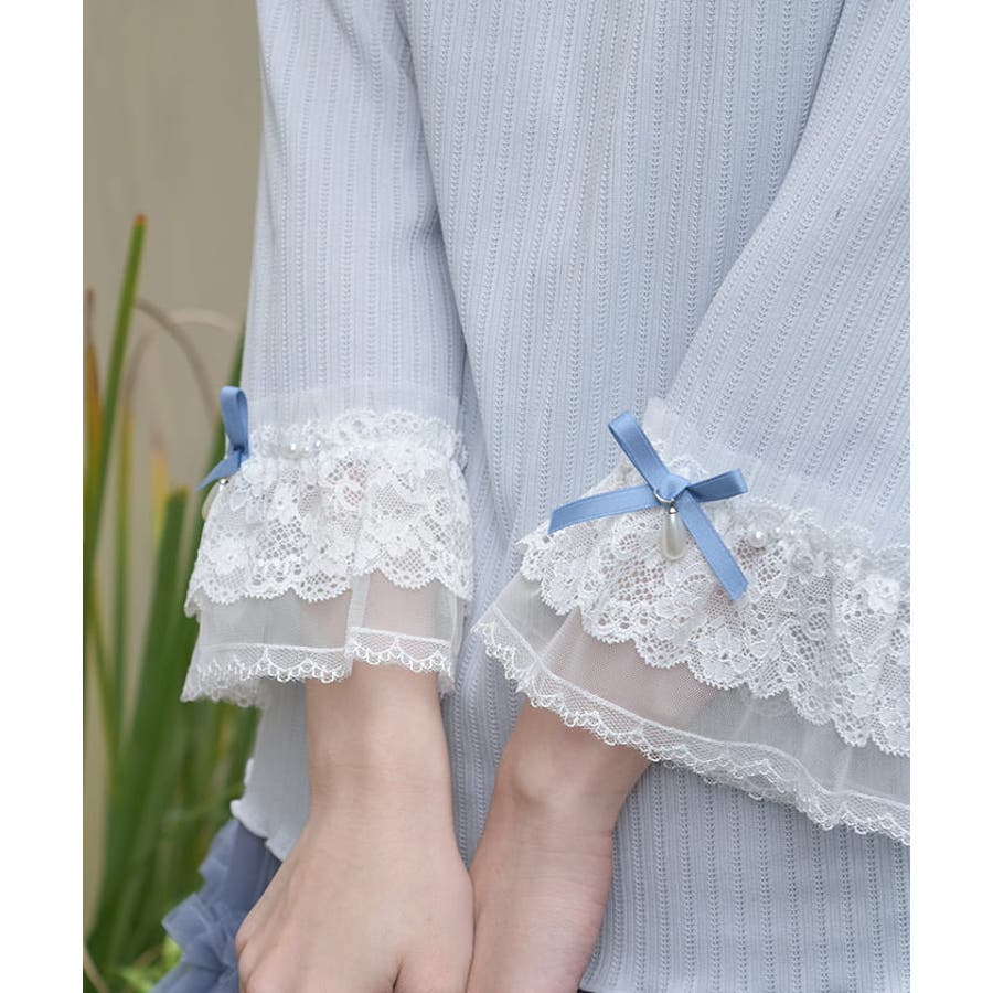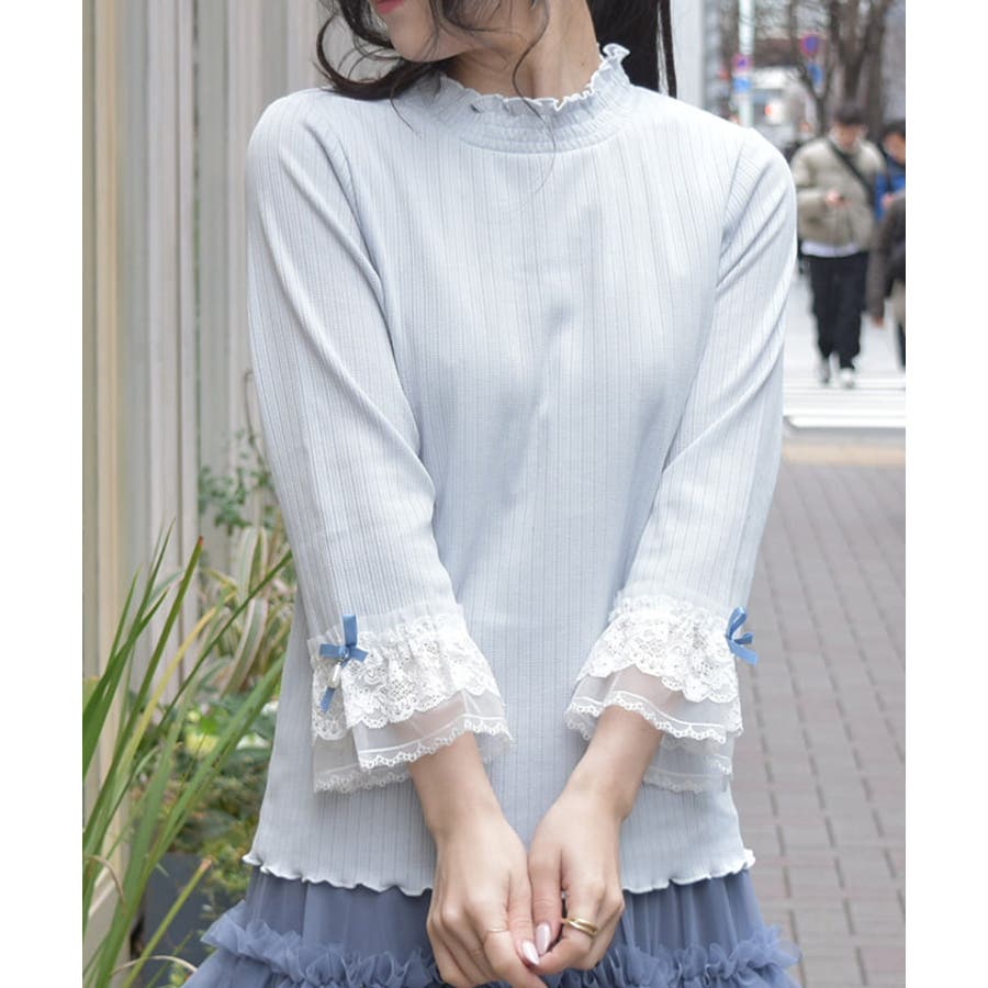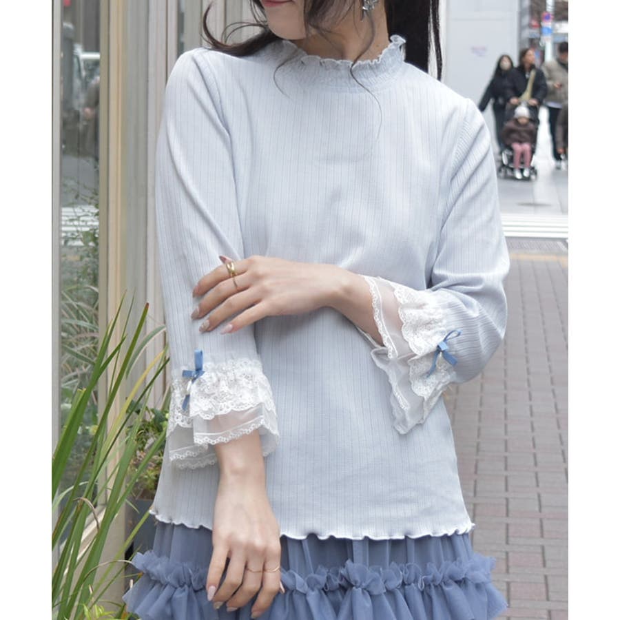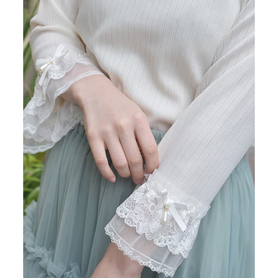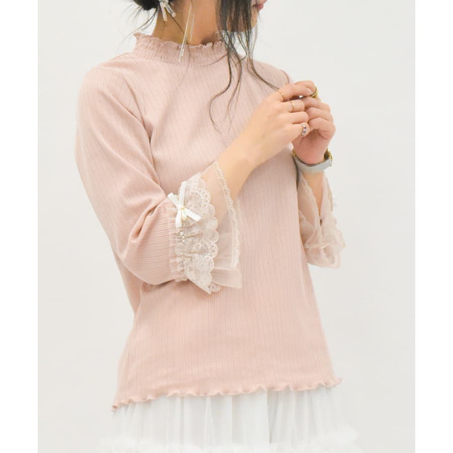 レース×チュール×リボンの華やかな袖デザインがポイントの七分袖トップスです。