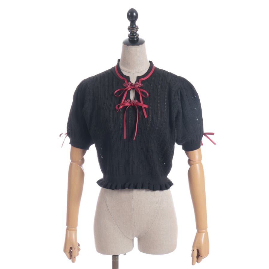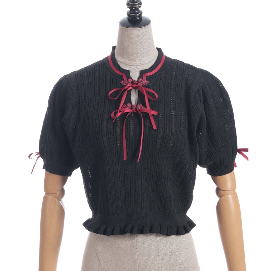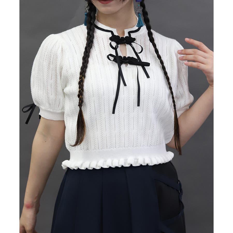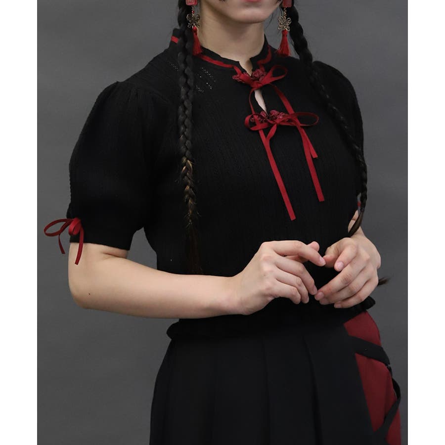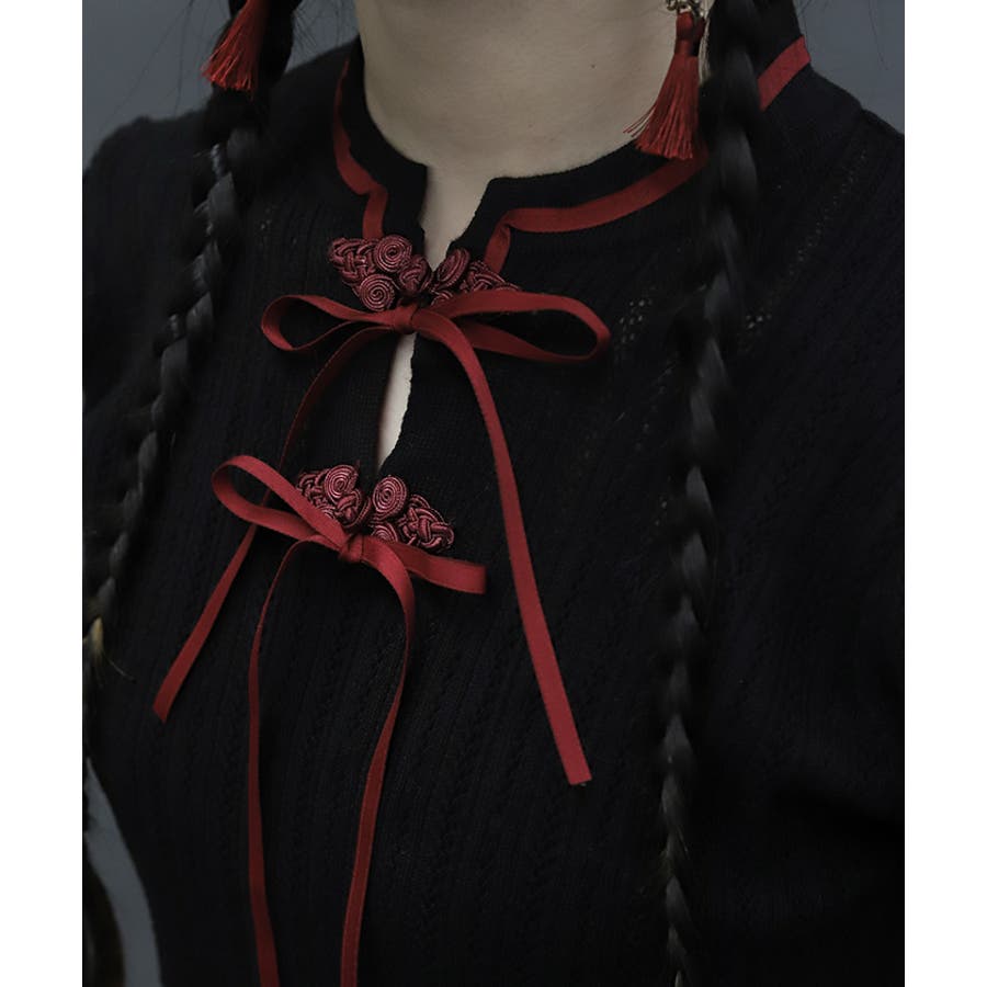 配色のチャイナボタンとリボンが映えるのでコーデのワンポイントにピッタリなトップスです。