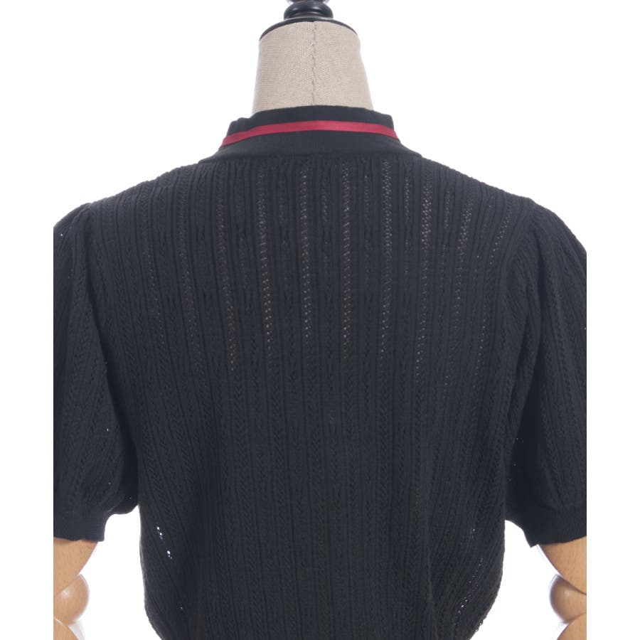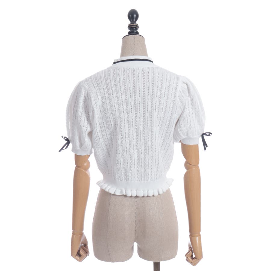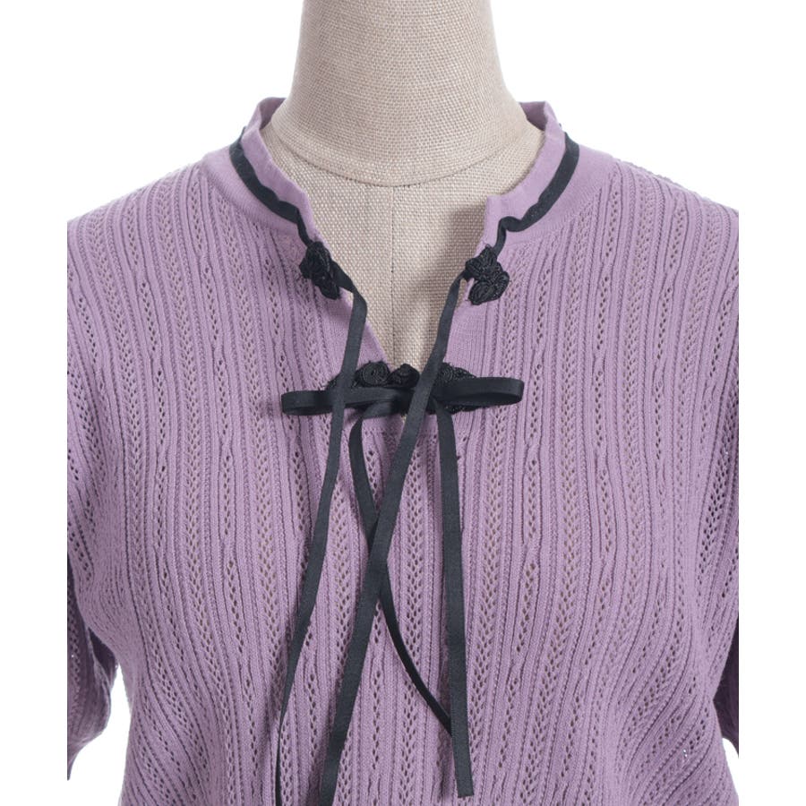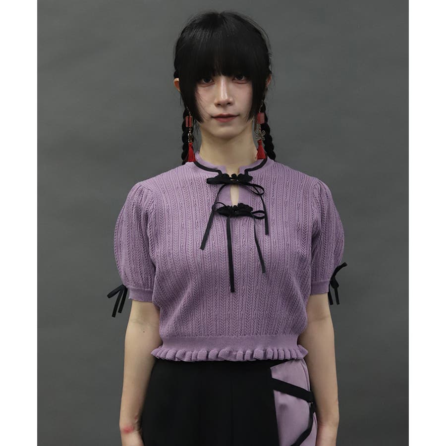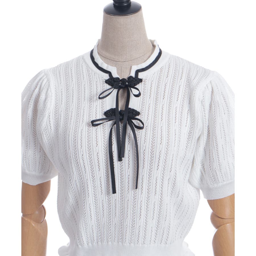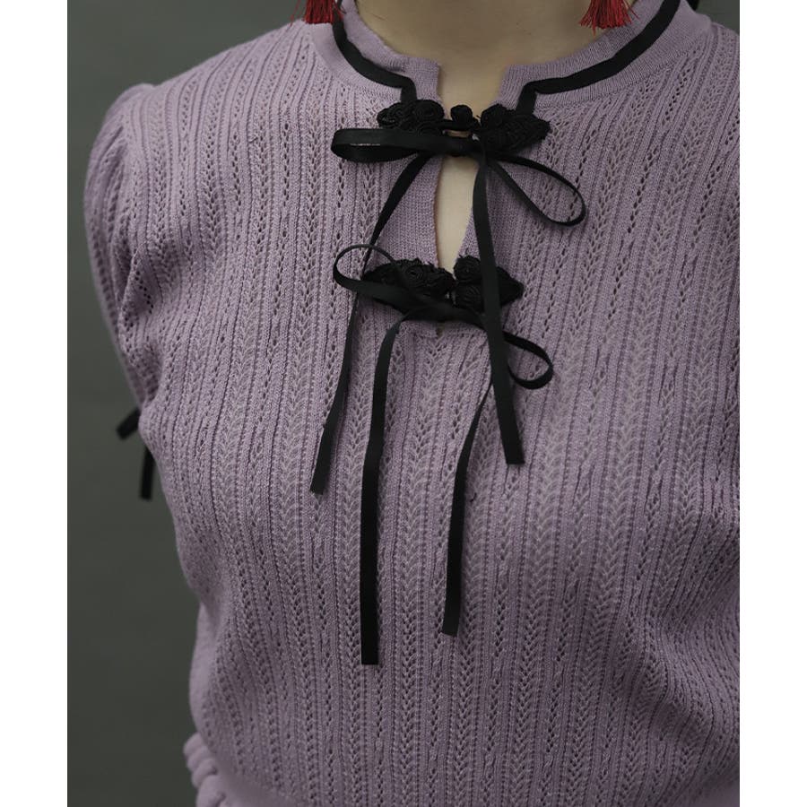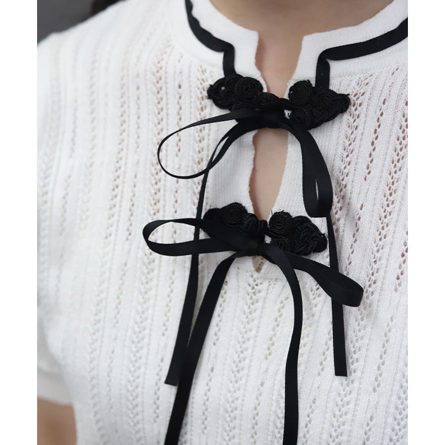 襟元にチャイナボタンとリボンを一緒にあしらったサマーニットポロです。