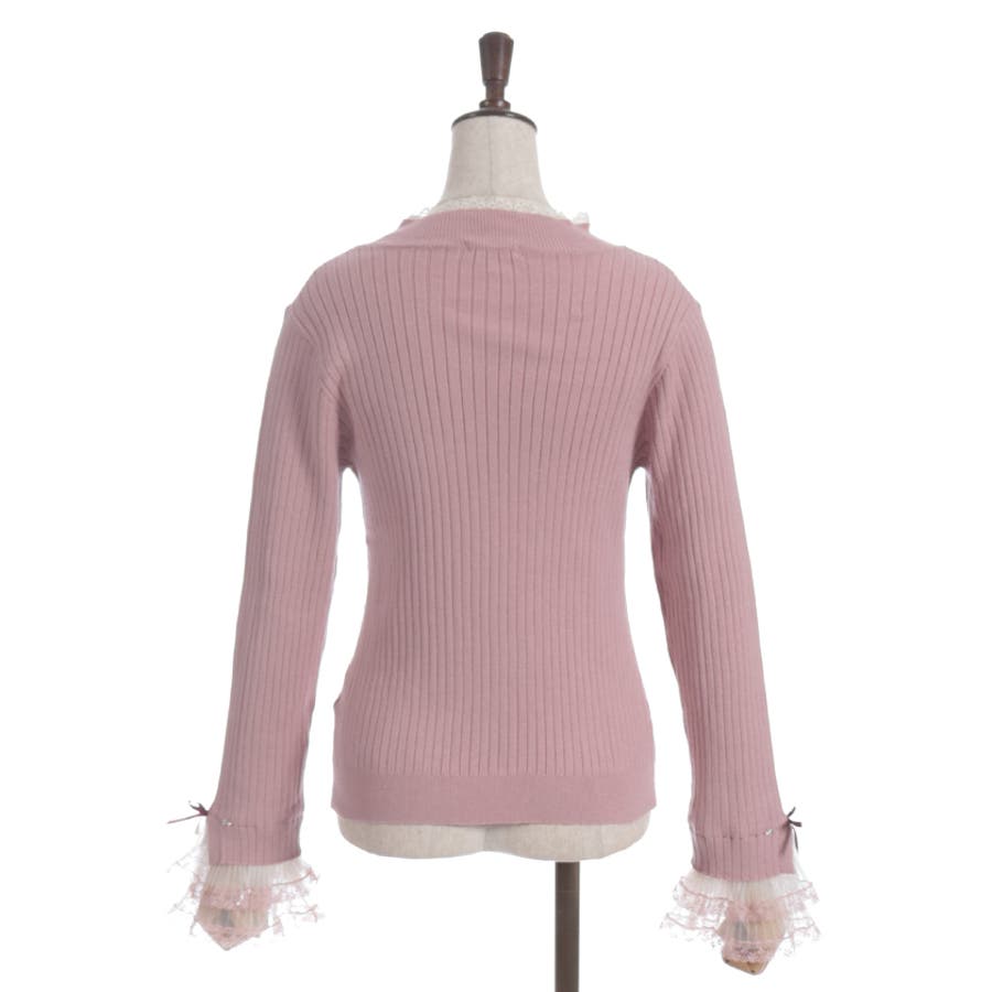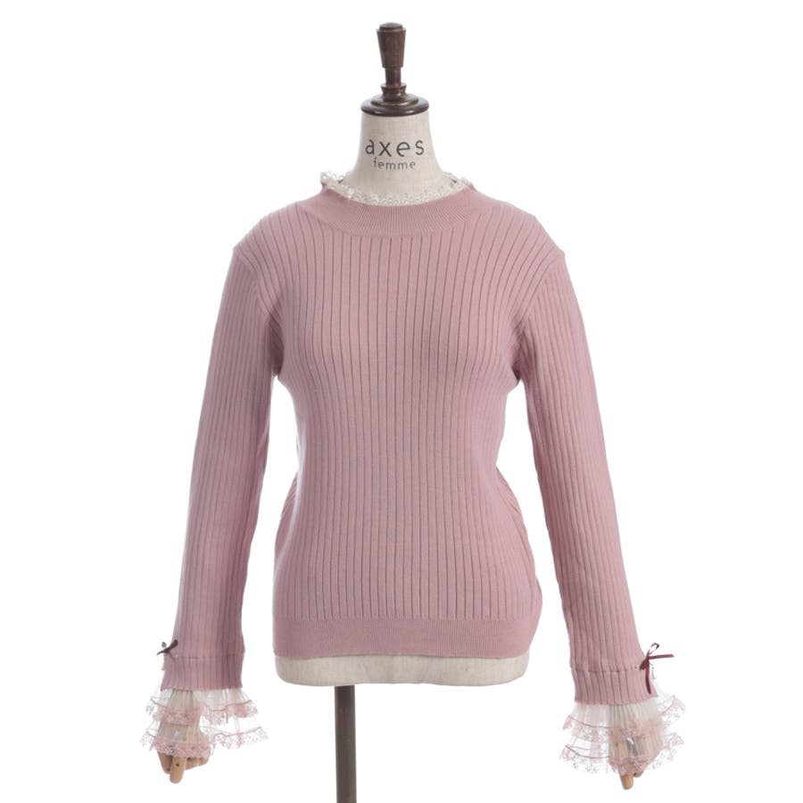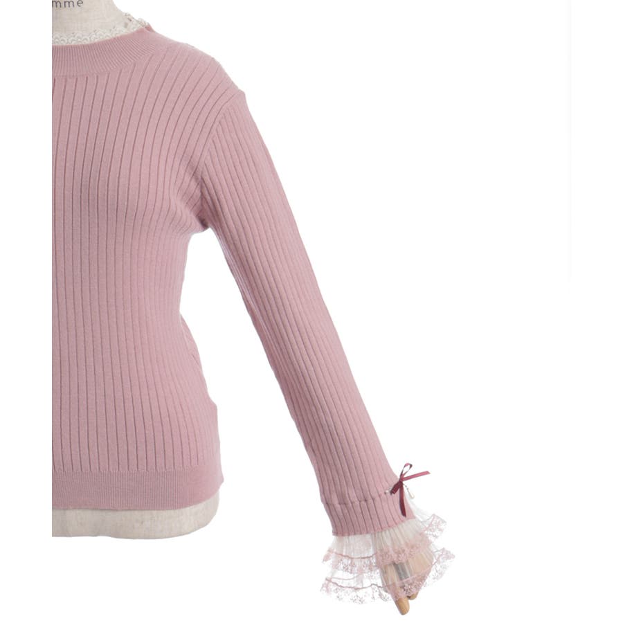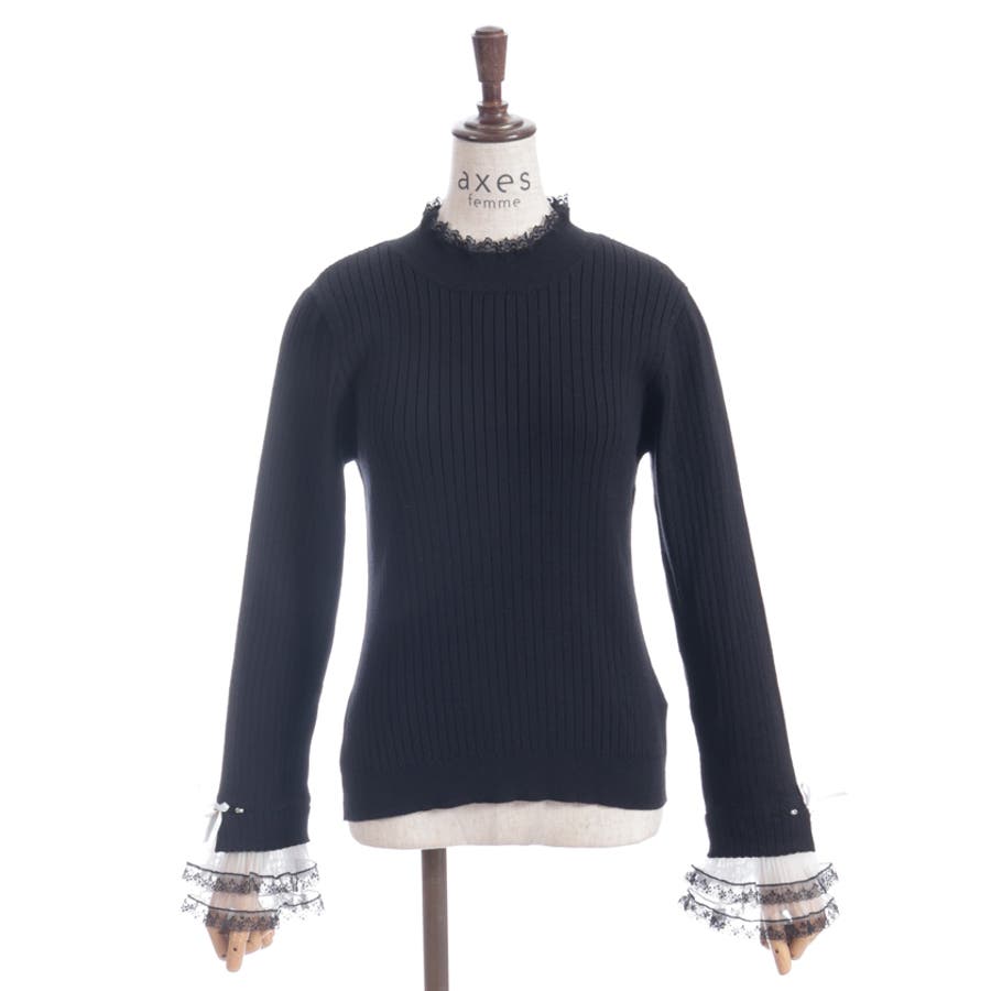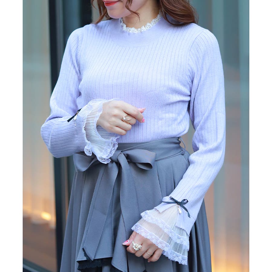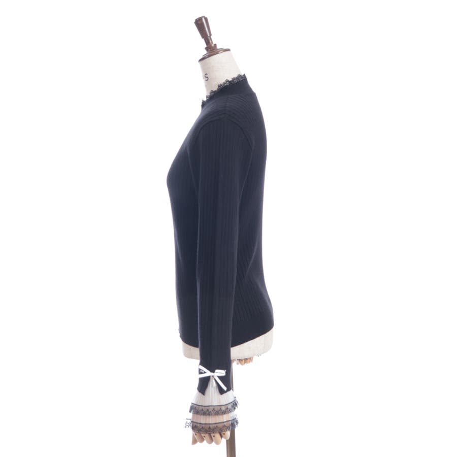 袖口のプリーツチュール×レース×リボンの装飾が華やかなデザインのニットです。