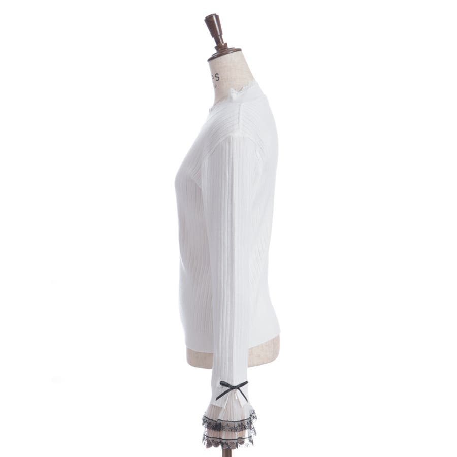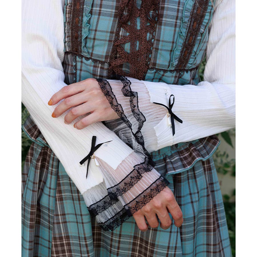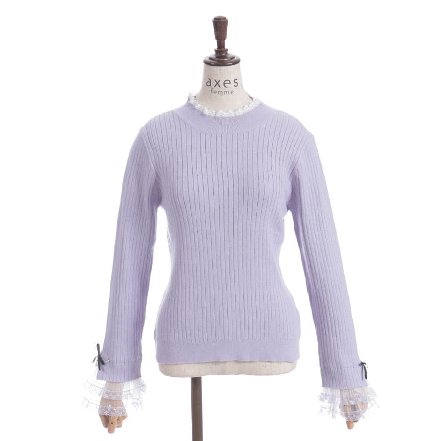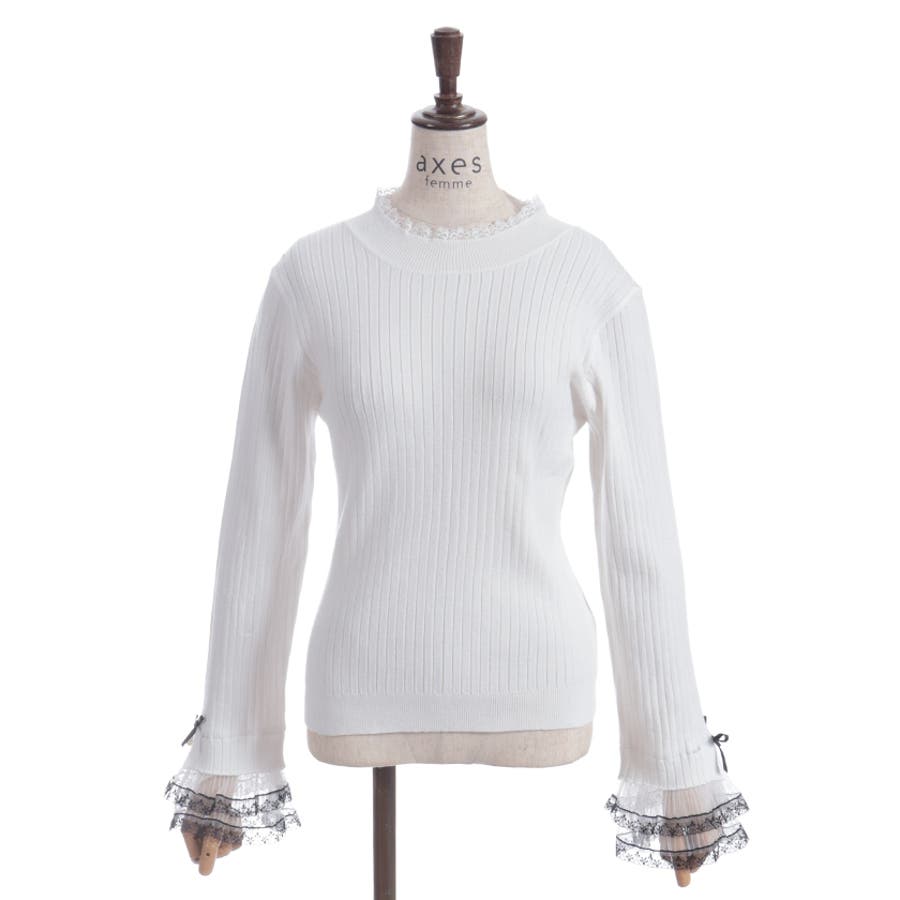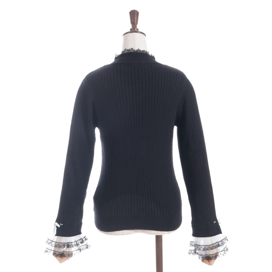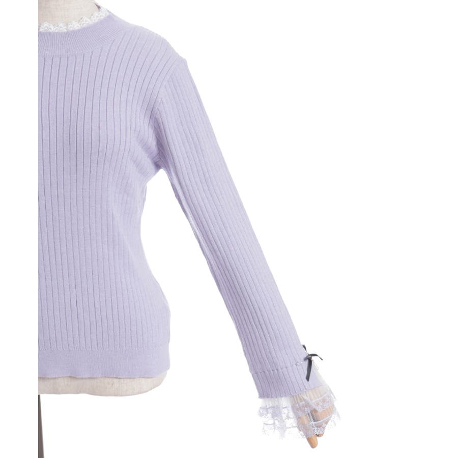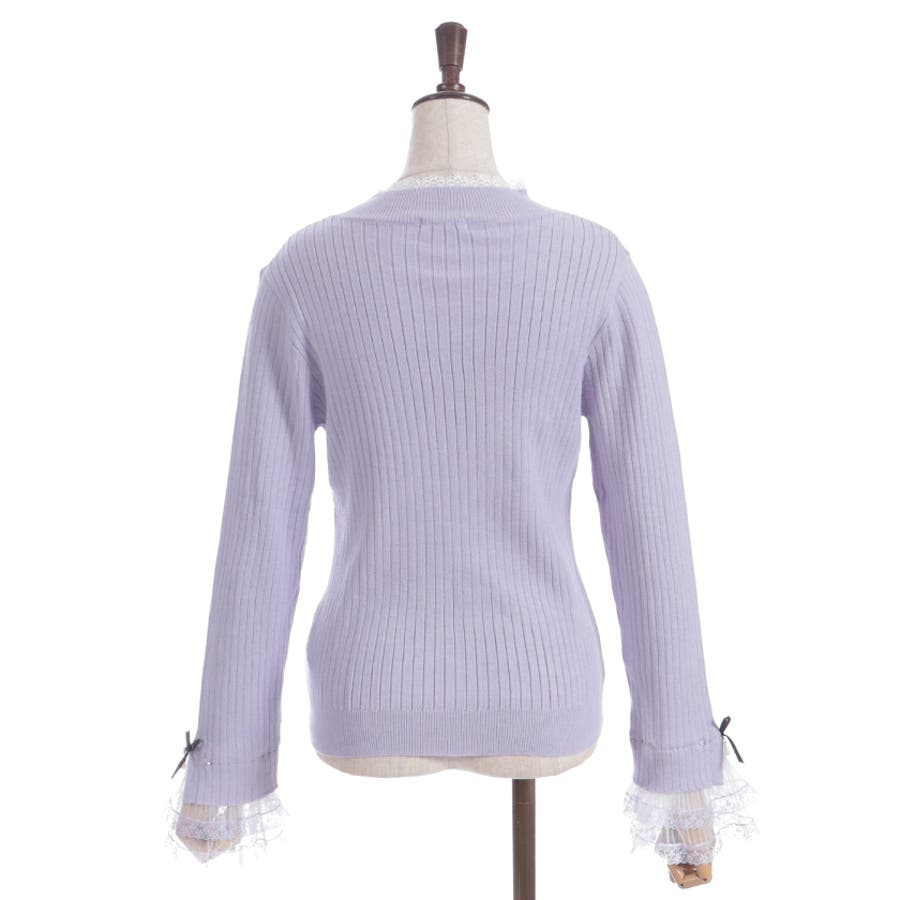 袖口のプリーツチュール×レース×リボンの装飾が華やかなデザインのニットです。