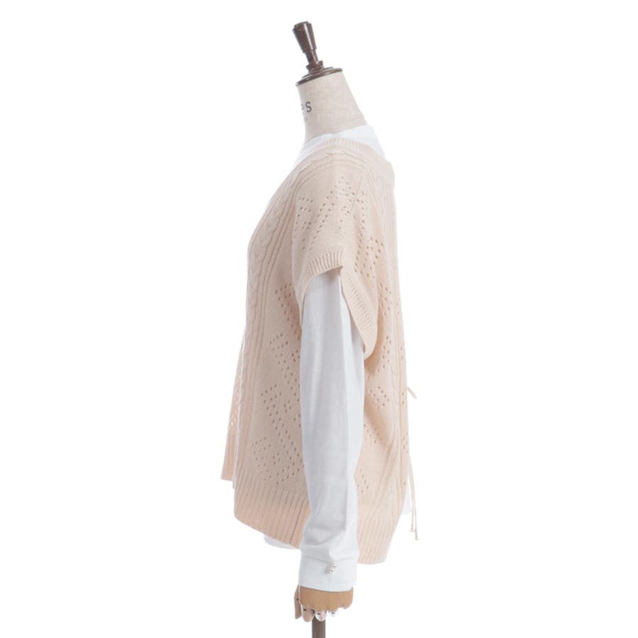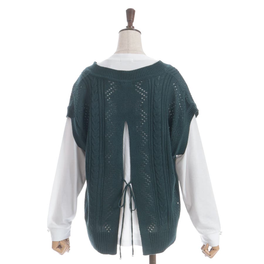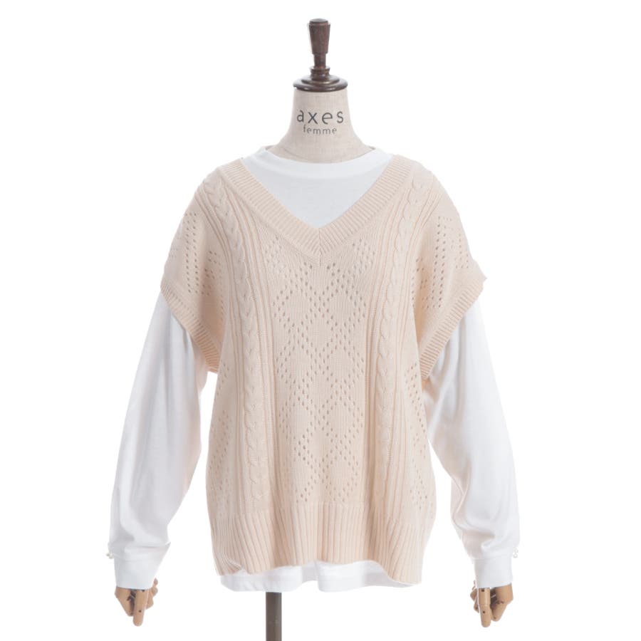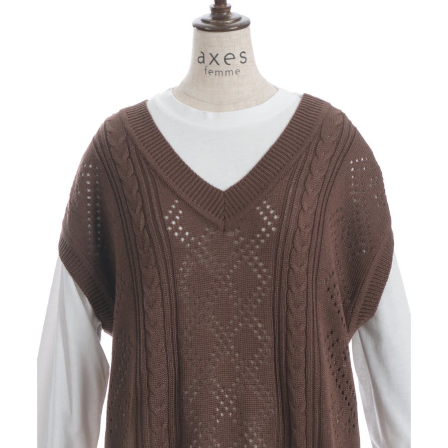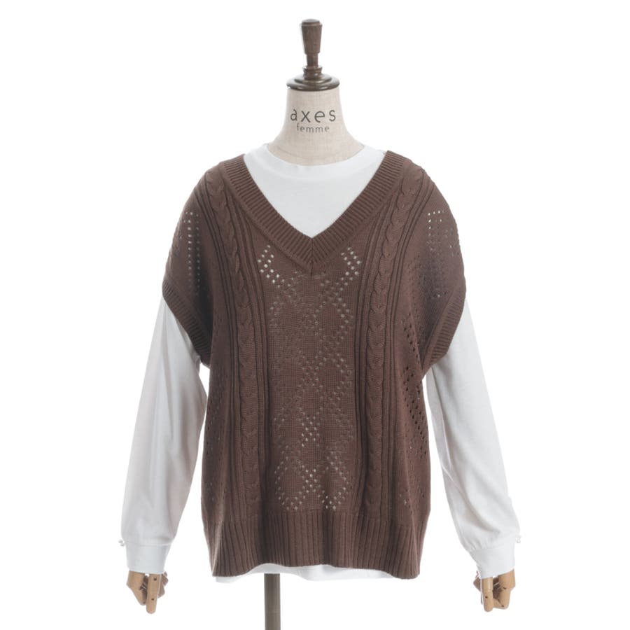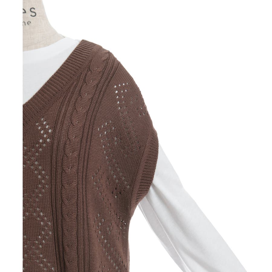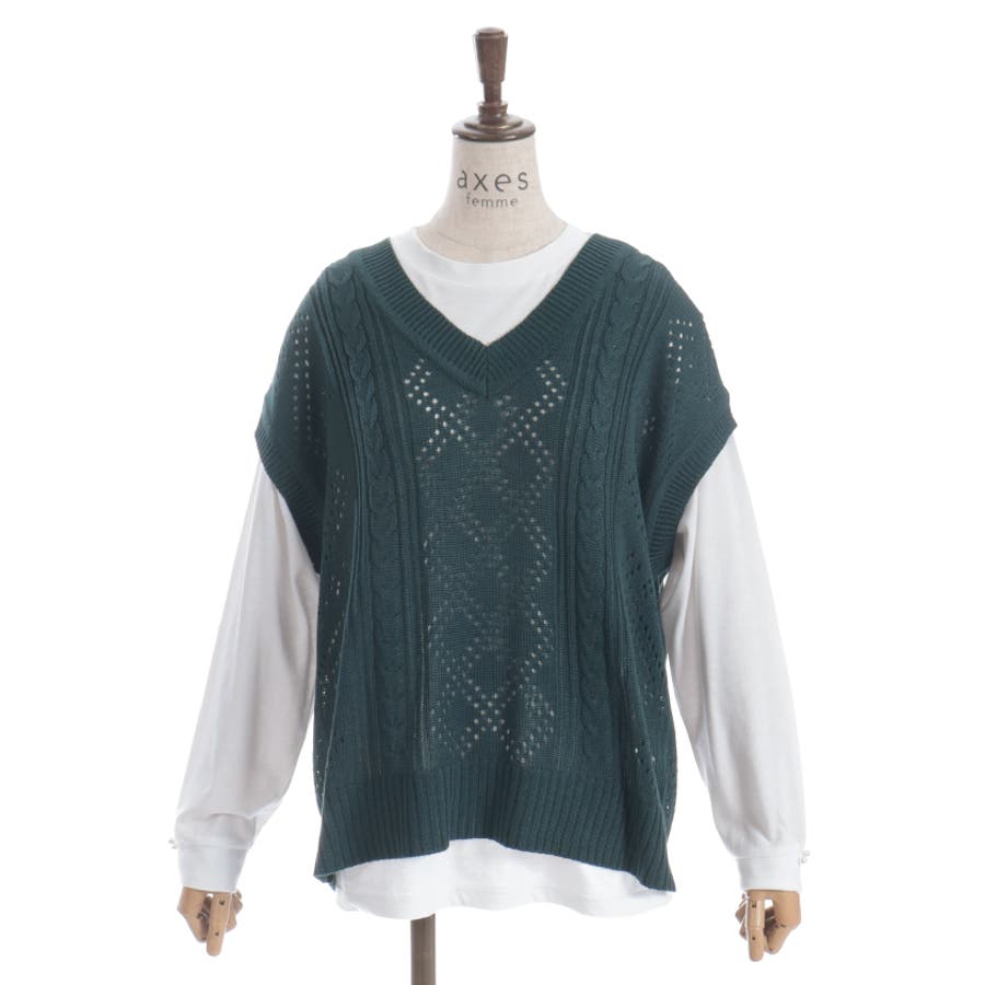 透かし編みのニットベストと長袖Tシャツのアンサンブルです。