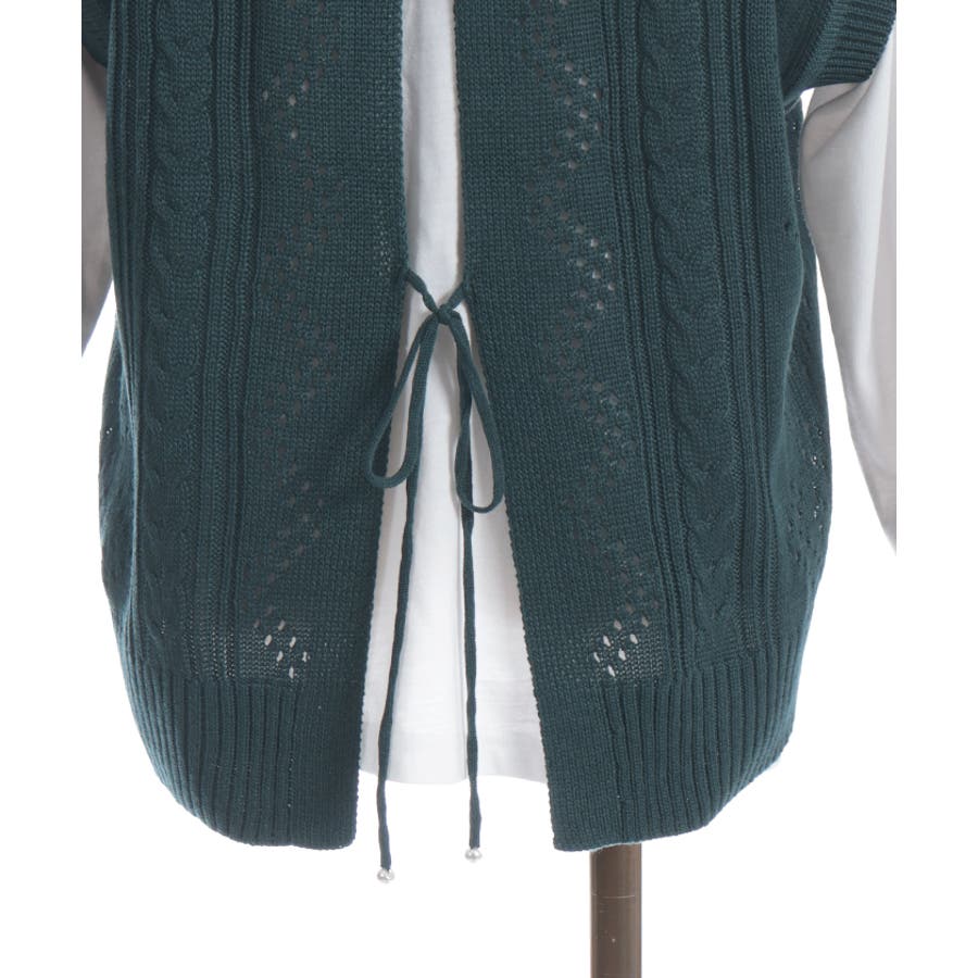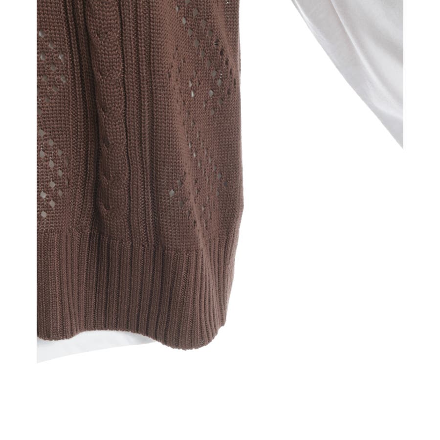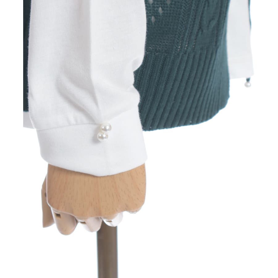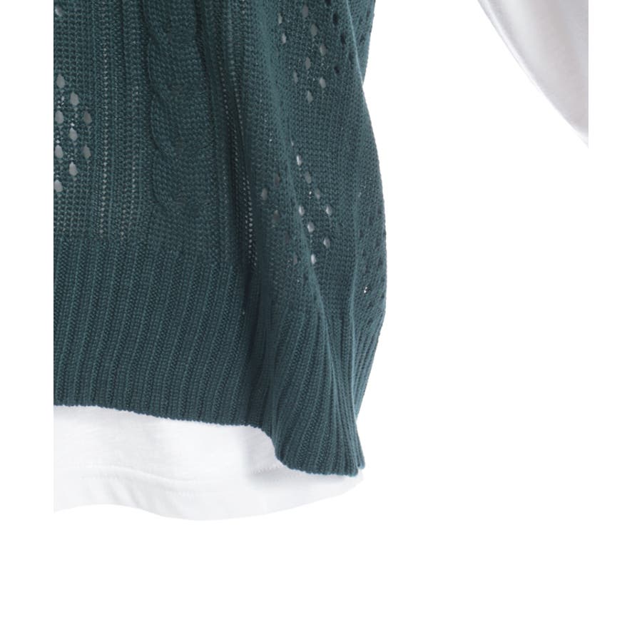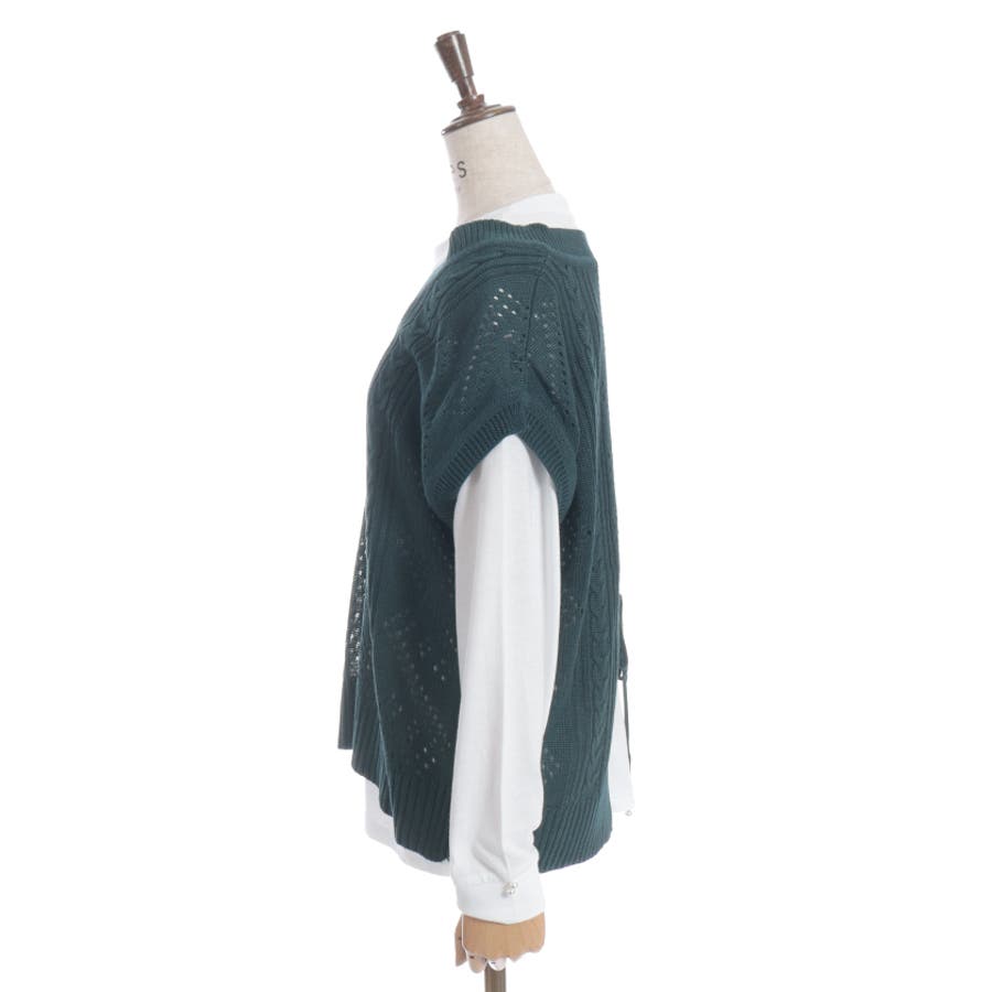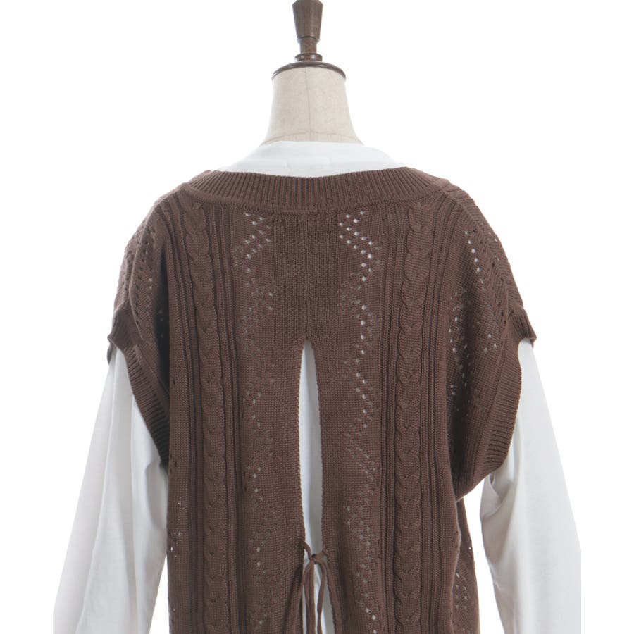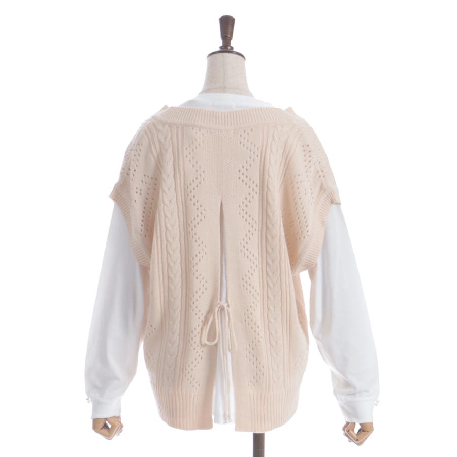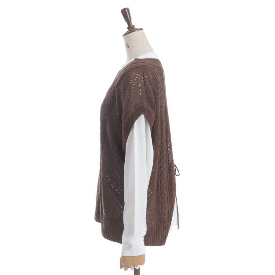 透かし編みのニットベストと長袖Tシャツのアンサンブルです。