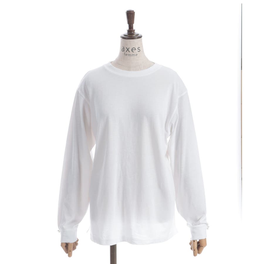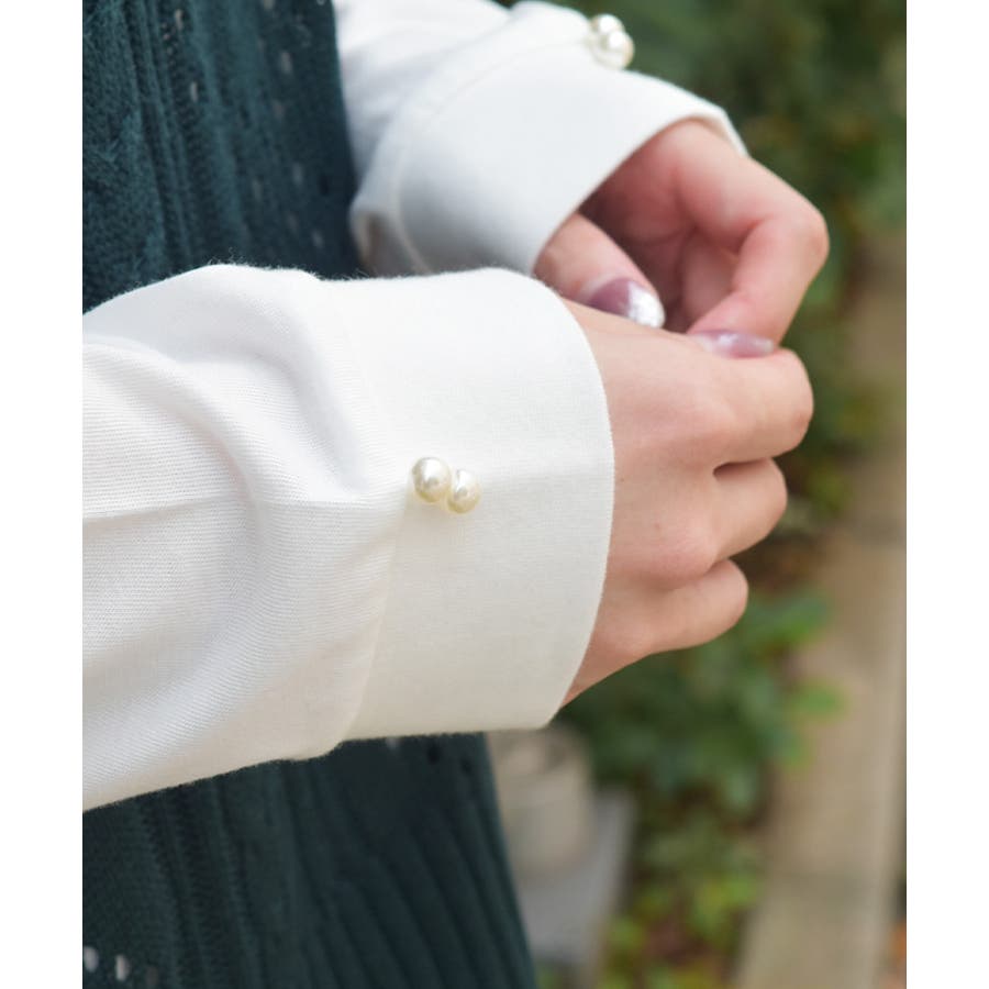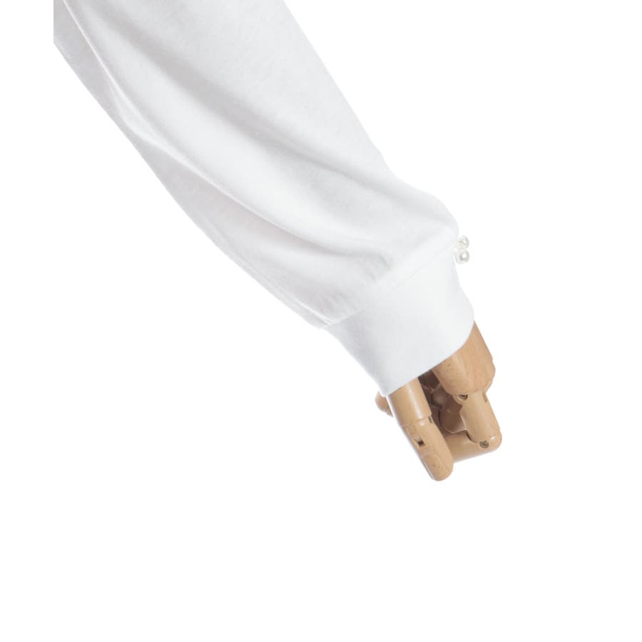 Tシャツの袖口にもパールを2粒ずつあしらい、フェミニンさをちょっぴりプラス。