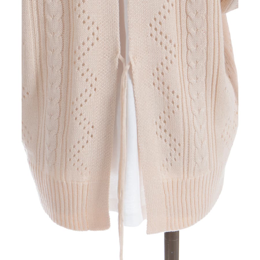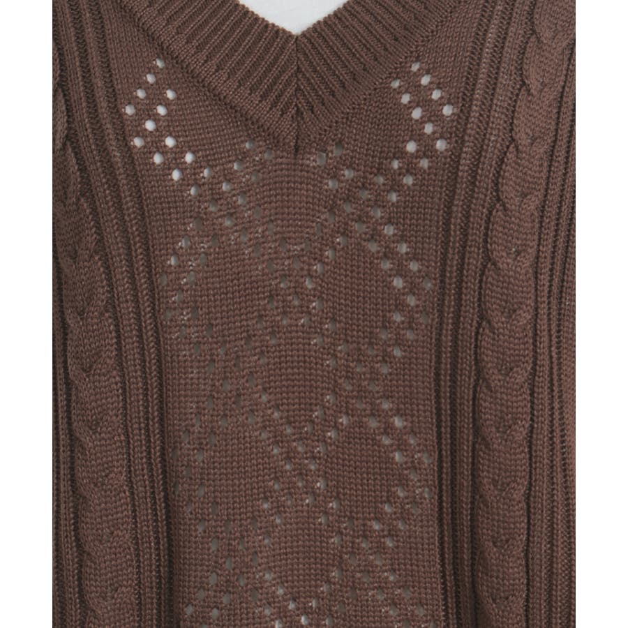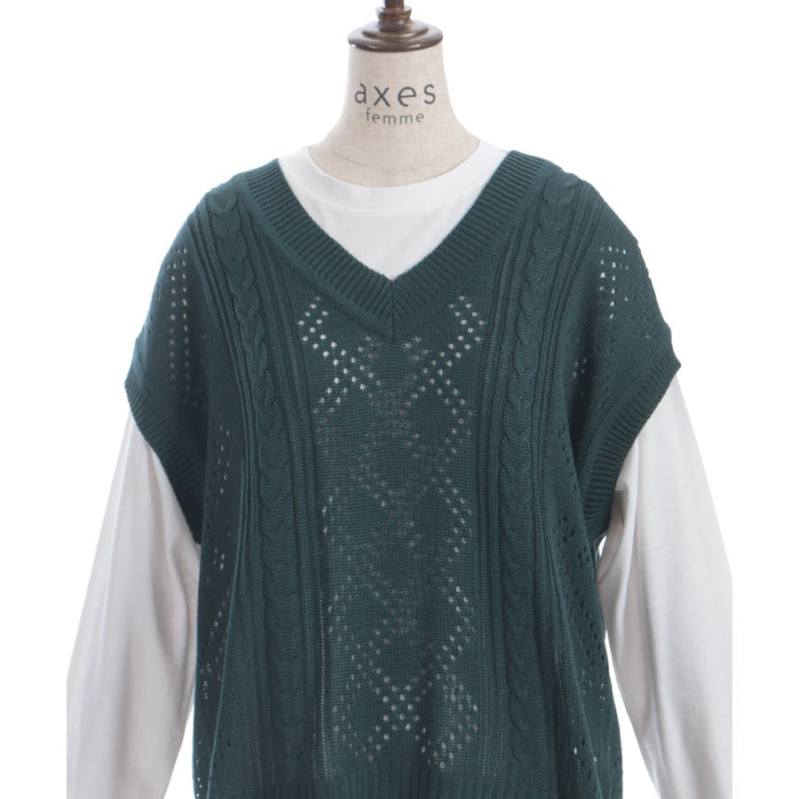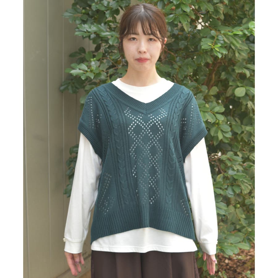 ニットベストはケーブル×ダイヤチェック風の透かし編みなので、今の時期からも着やすいのがポイント。