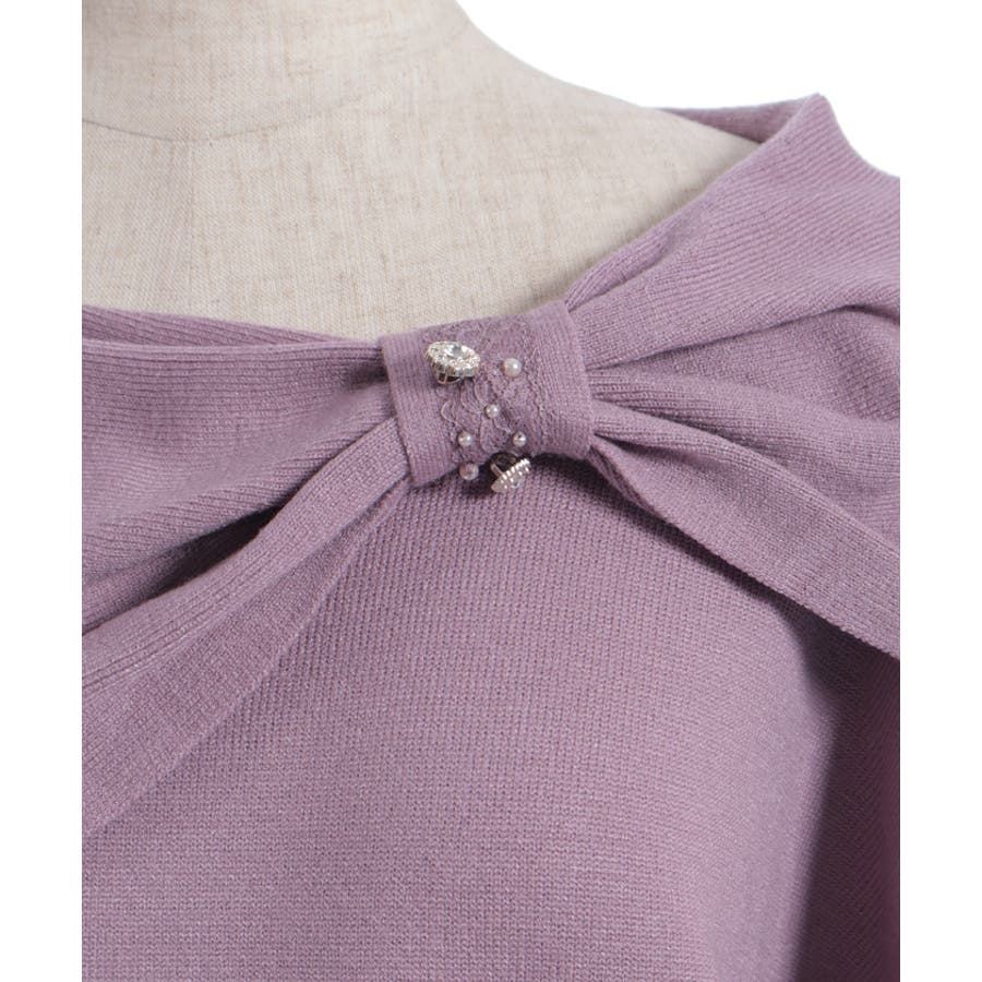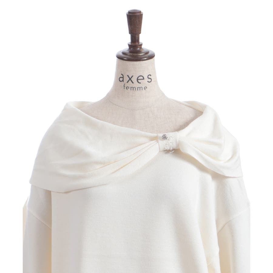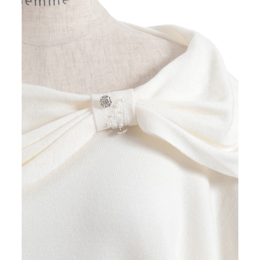 ドレープの効いたリボンをデコルテラインにあしらった、オフタートルのニット