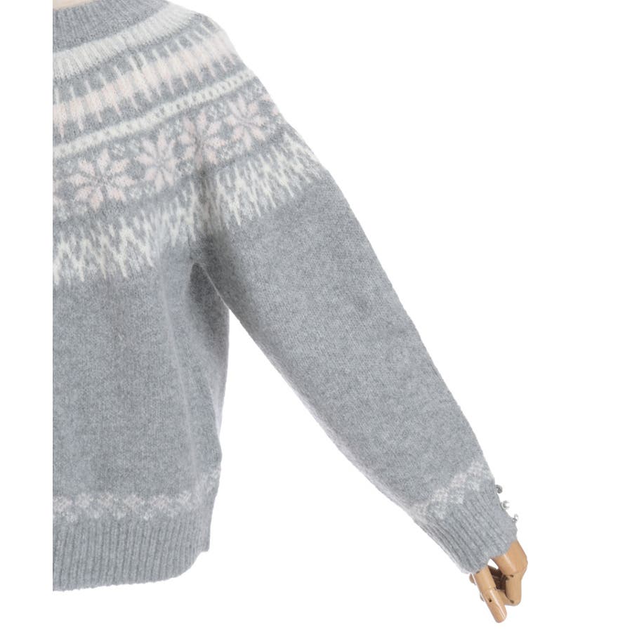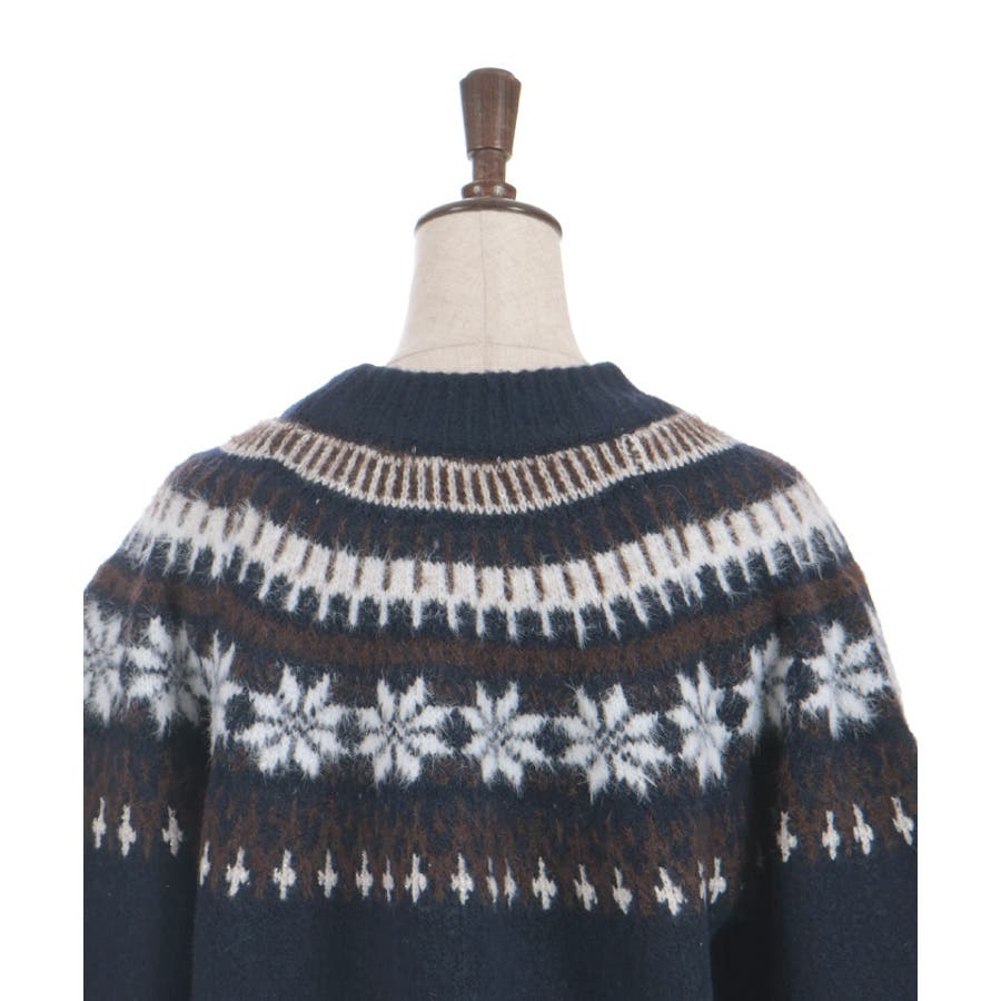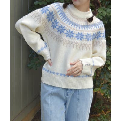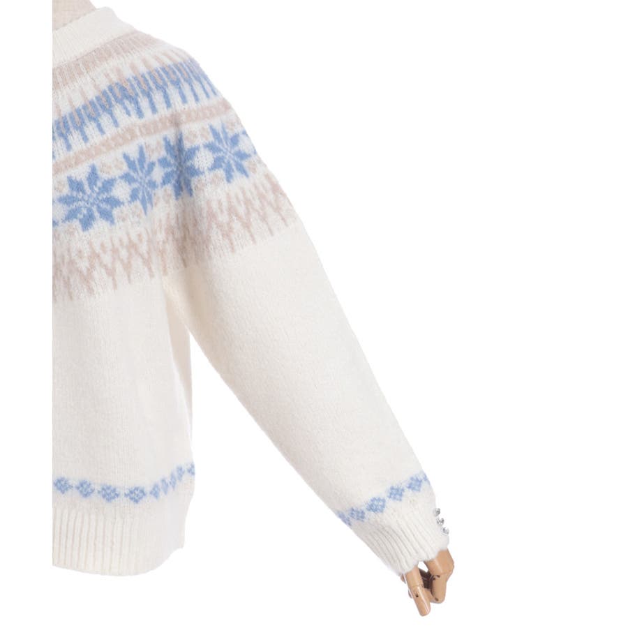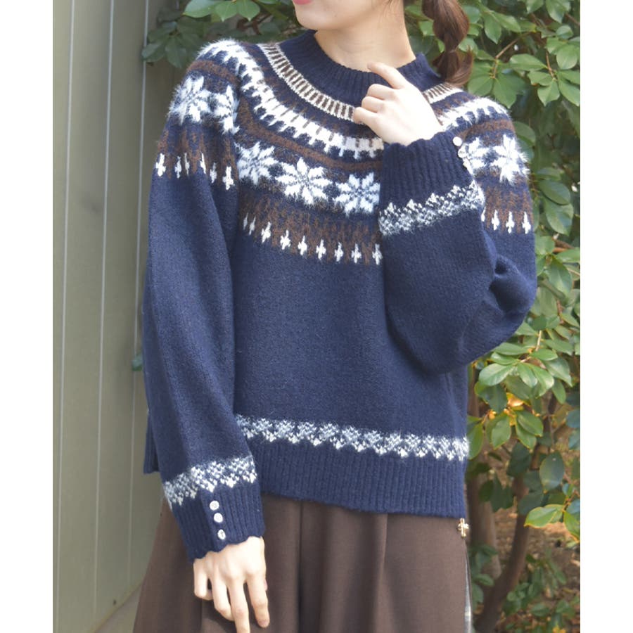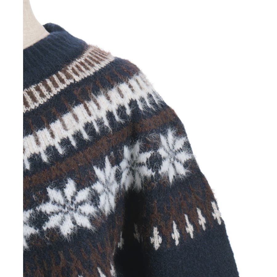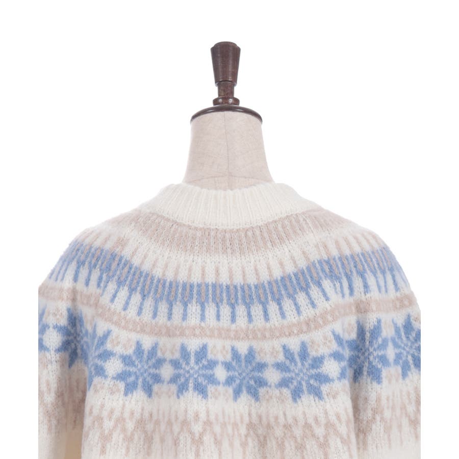 雪モチーフをあしらったフェアアイル柄が目を引き、冬らしい可愛さを楽しめるニット。