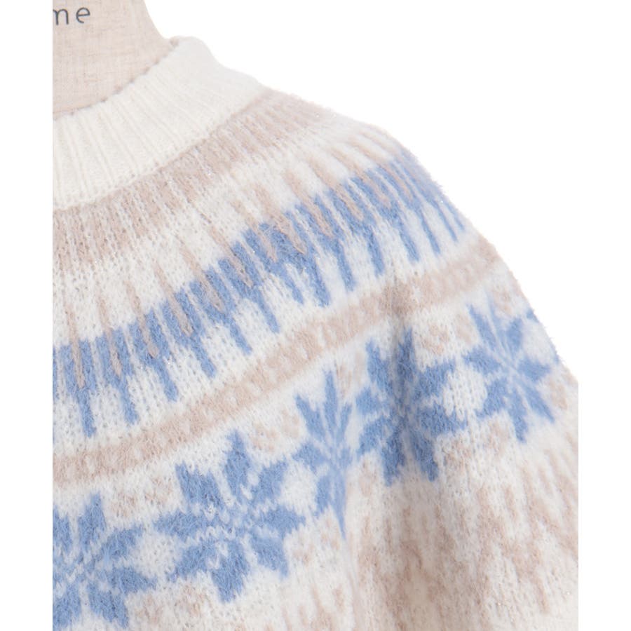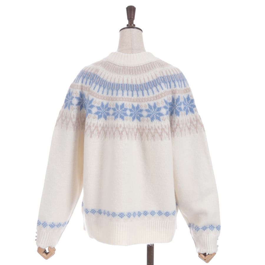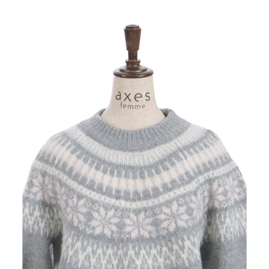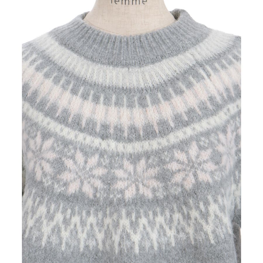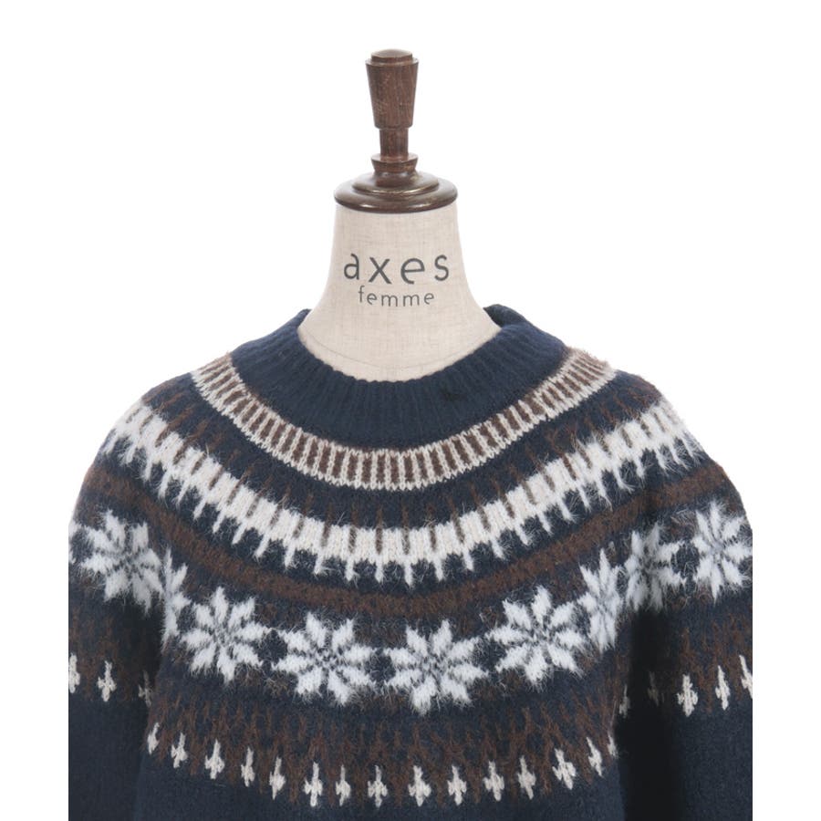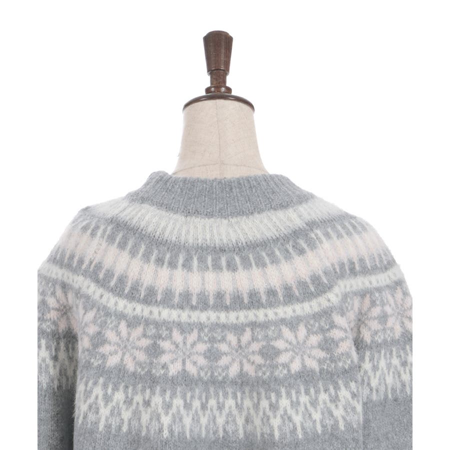 雪モチーフをあしらったフェアアイル柄が目を引き、冬らしい可愛さを楽しめるニット。