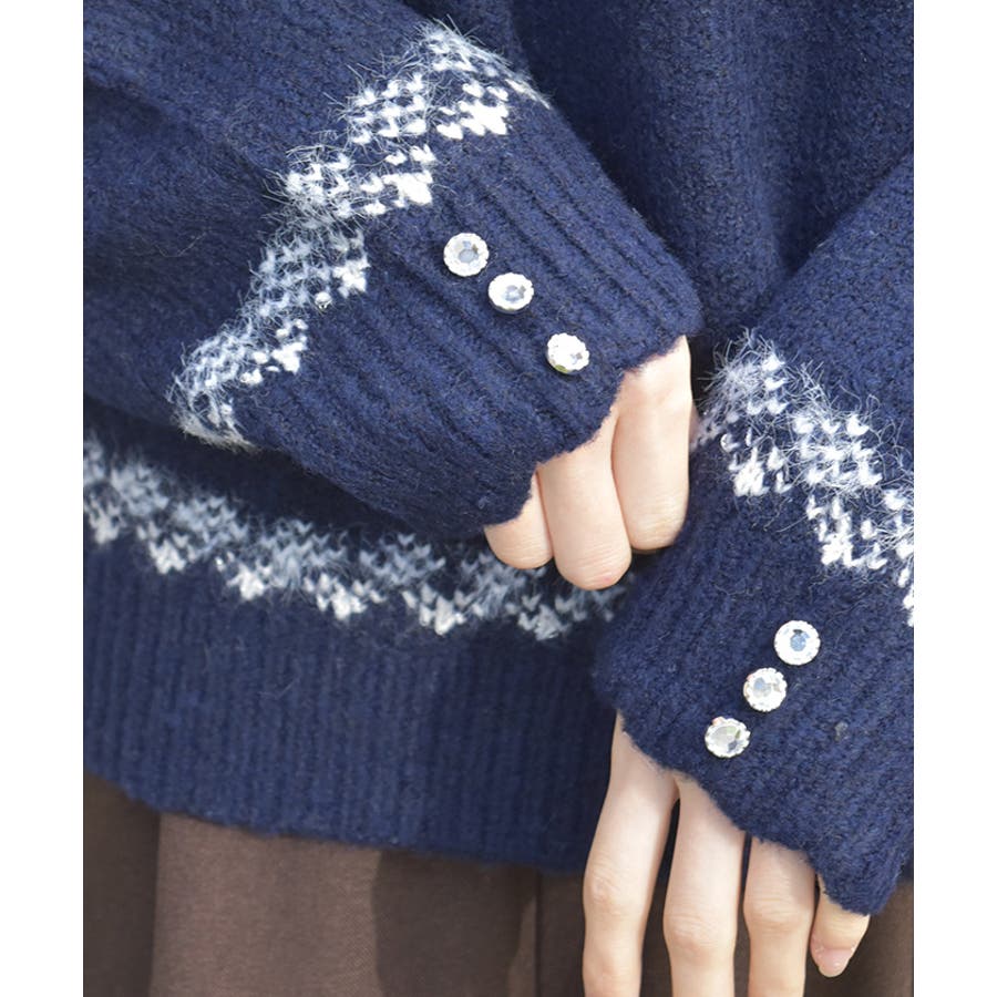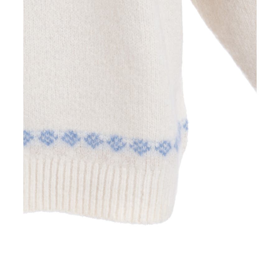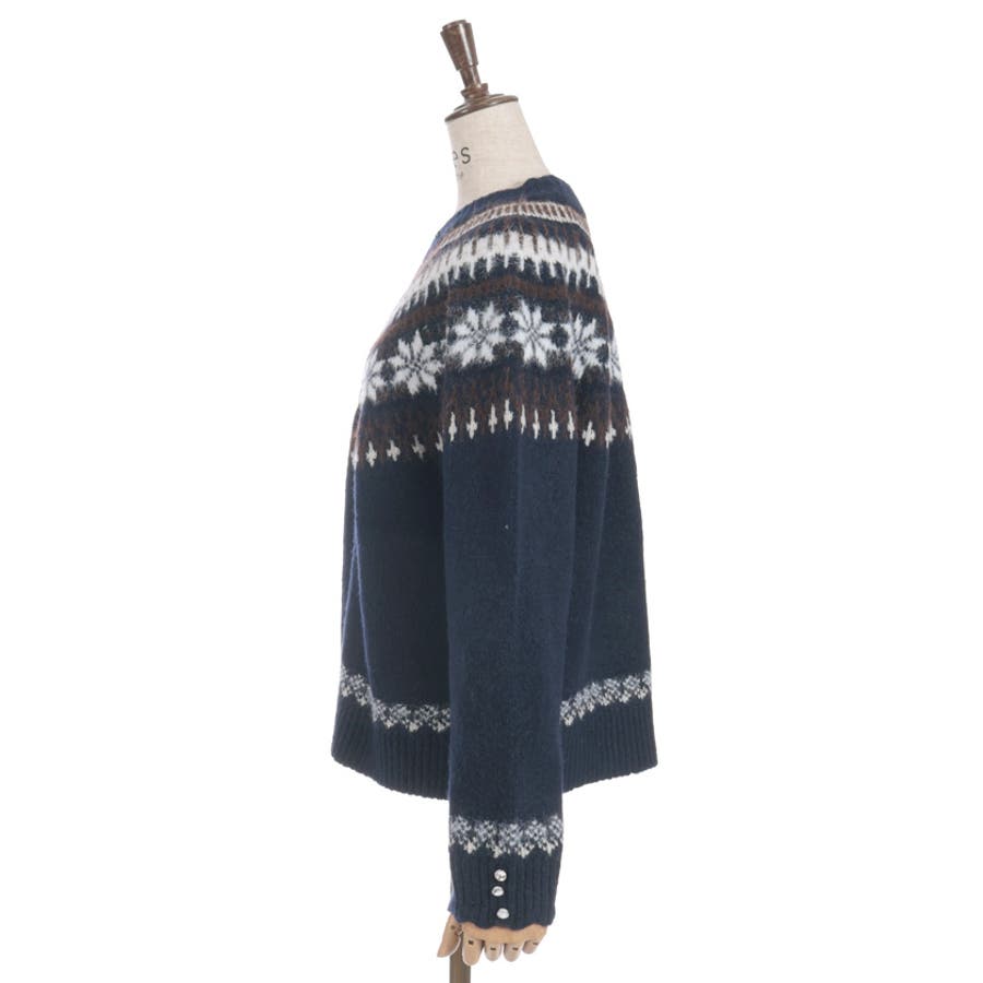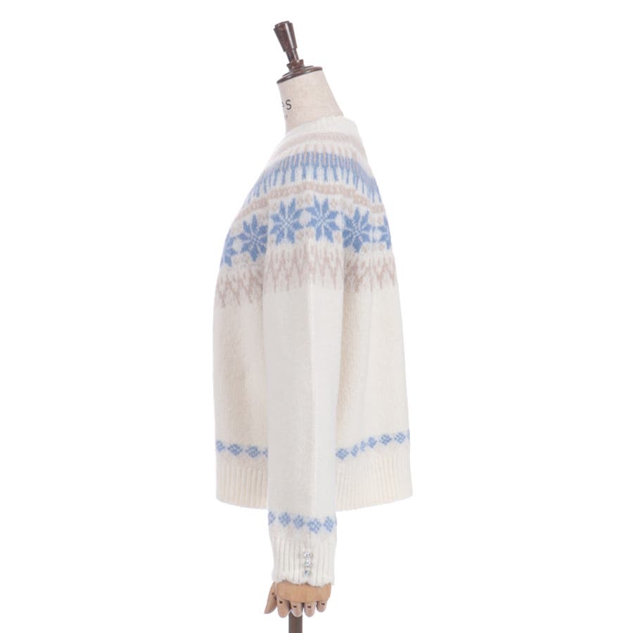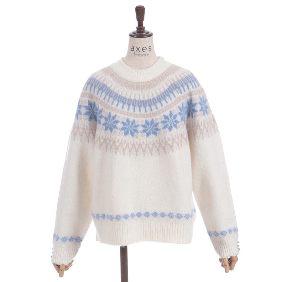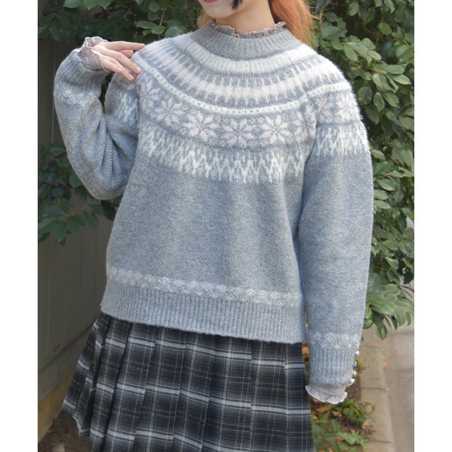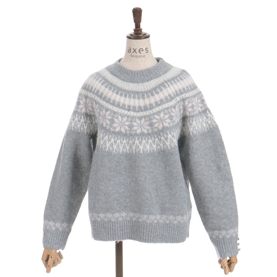 雪モチーフをあしらったフェアアイル柄が目を引き、冬らしい可愛さを楽しめるニット。
