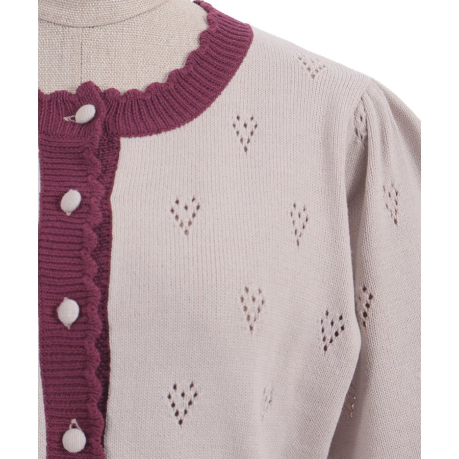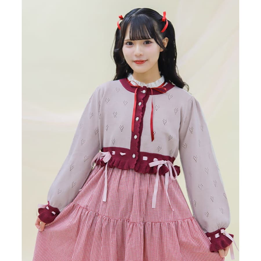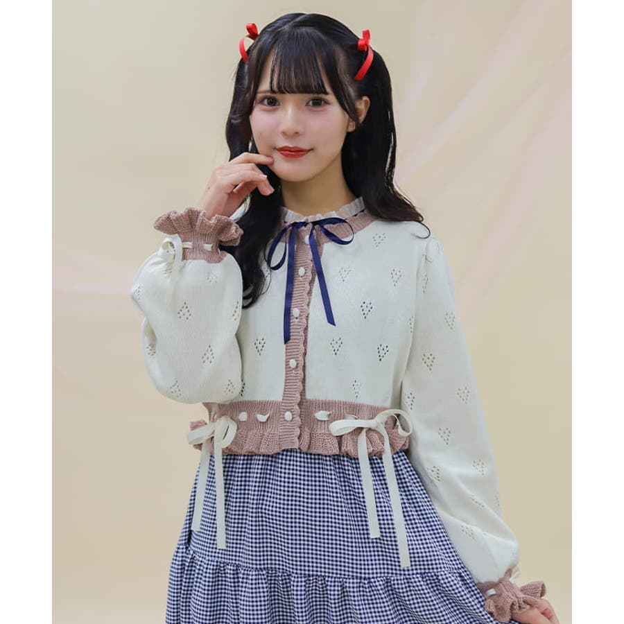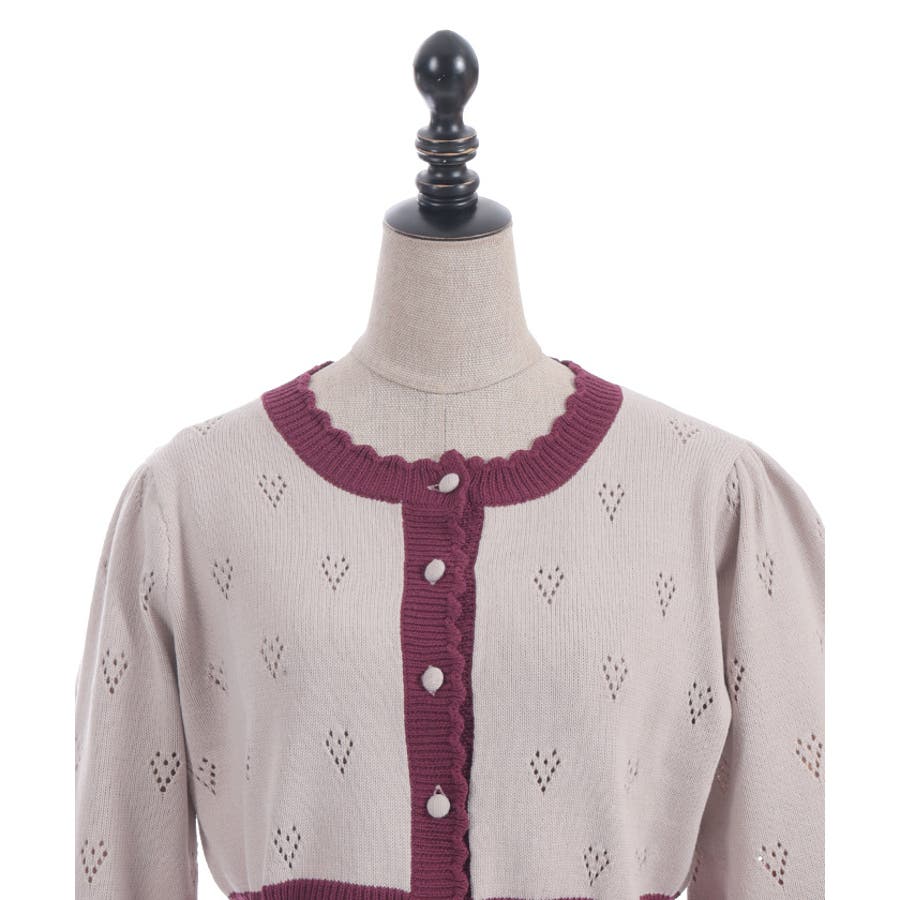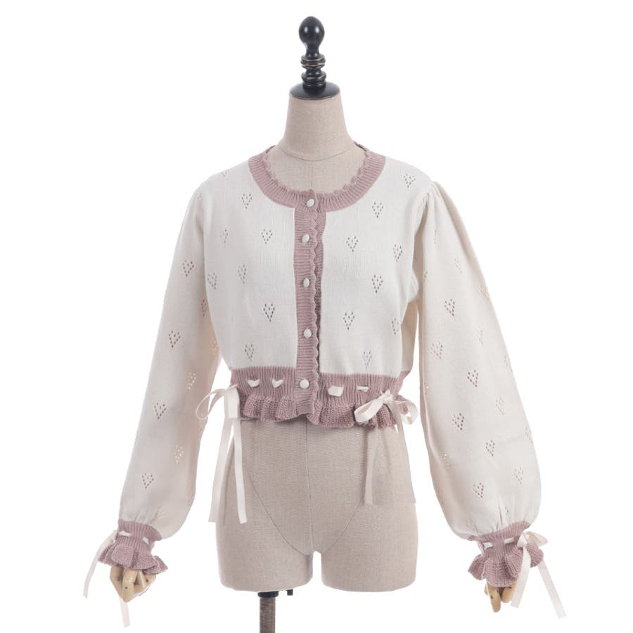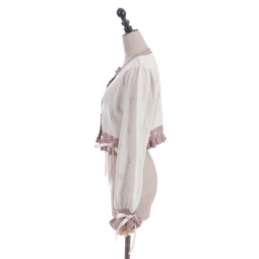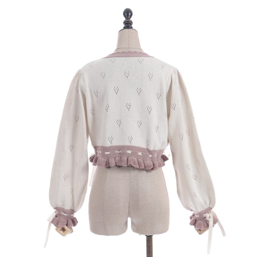 苺の種の様なハートの透かし模様を入れたニットカーディガンです。