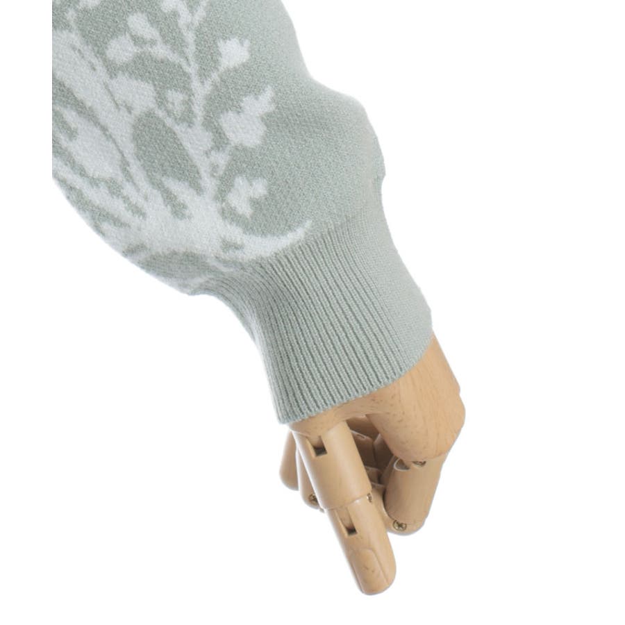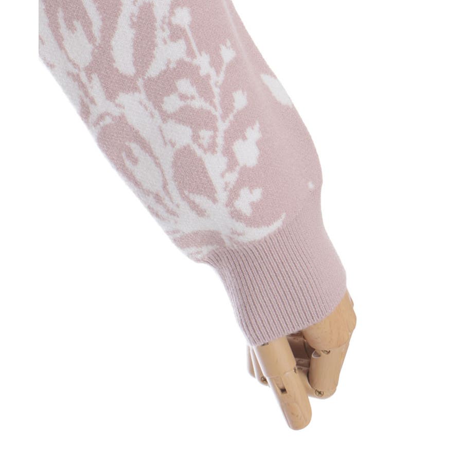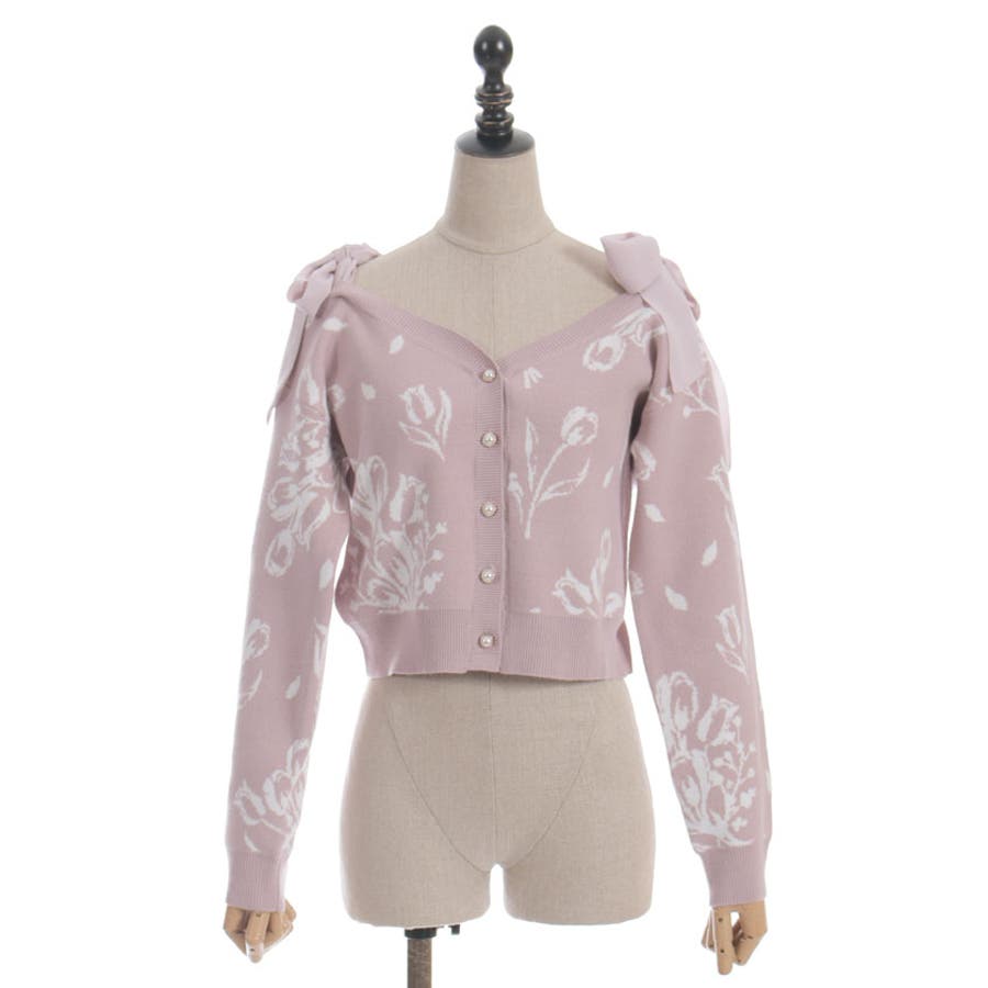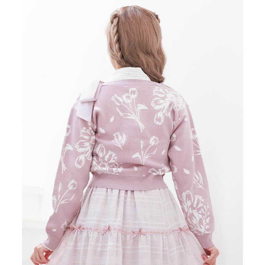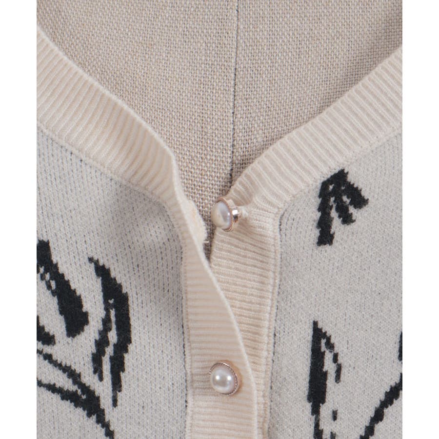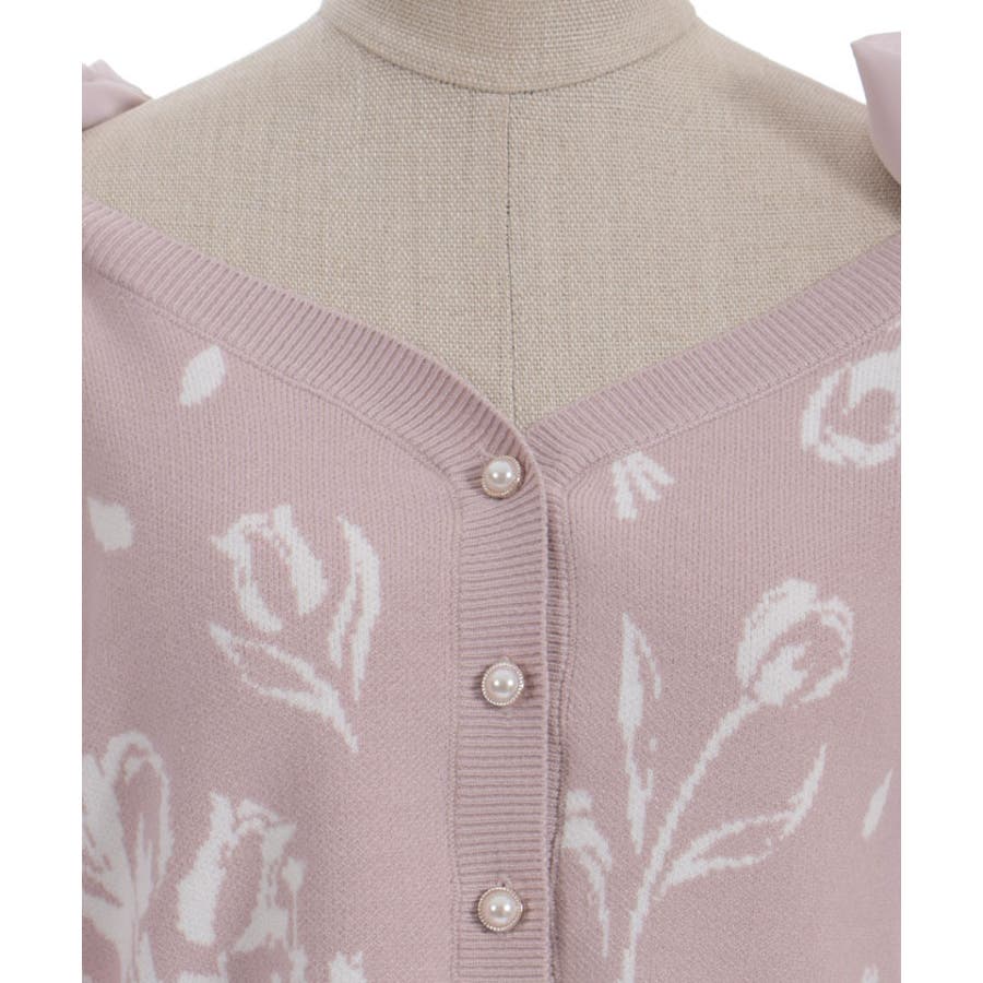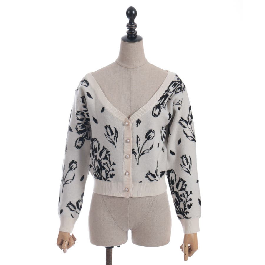 春らしいブーケ柄のジャカード織りが目を惹くニットカーディガンです。