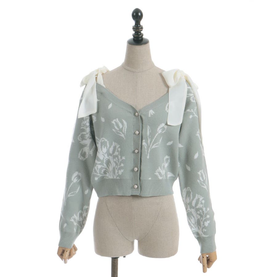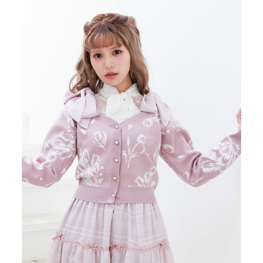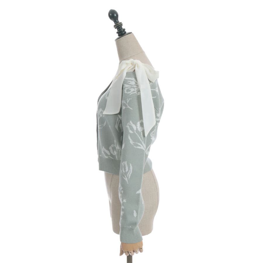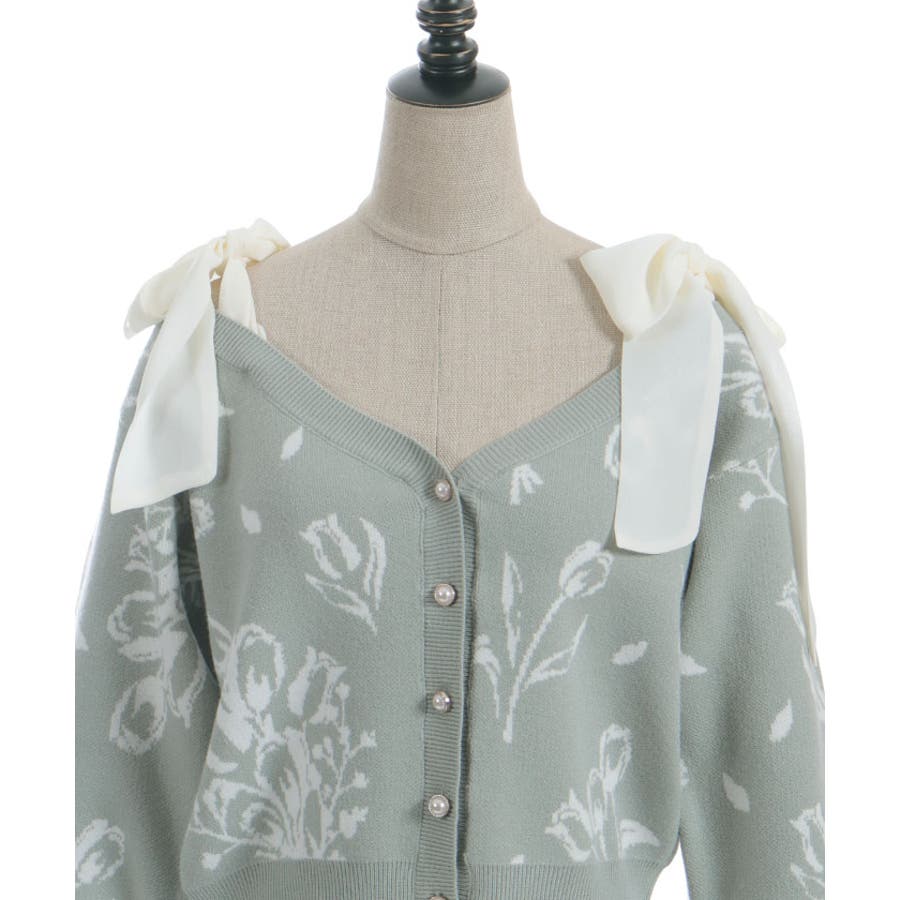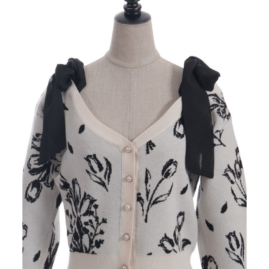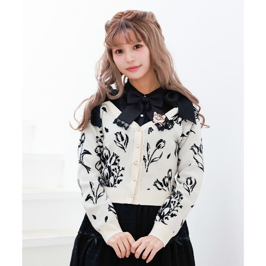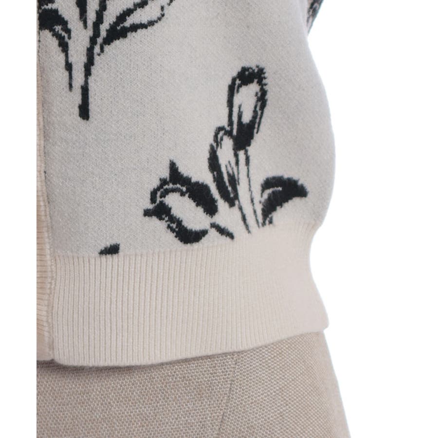 春らしいブーケ柄のジャカード織りが目を惹くニットカーディガンです。