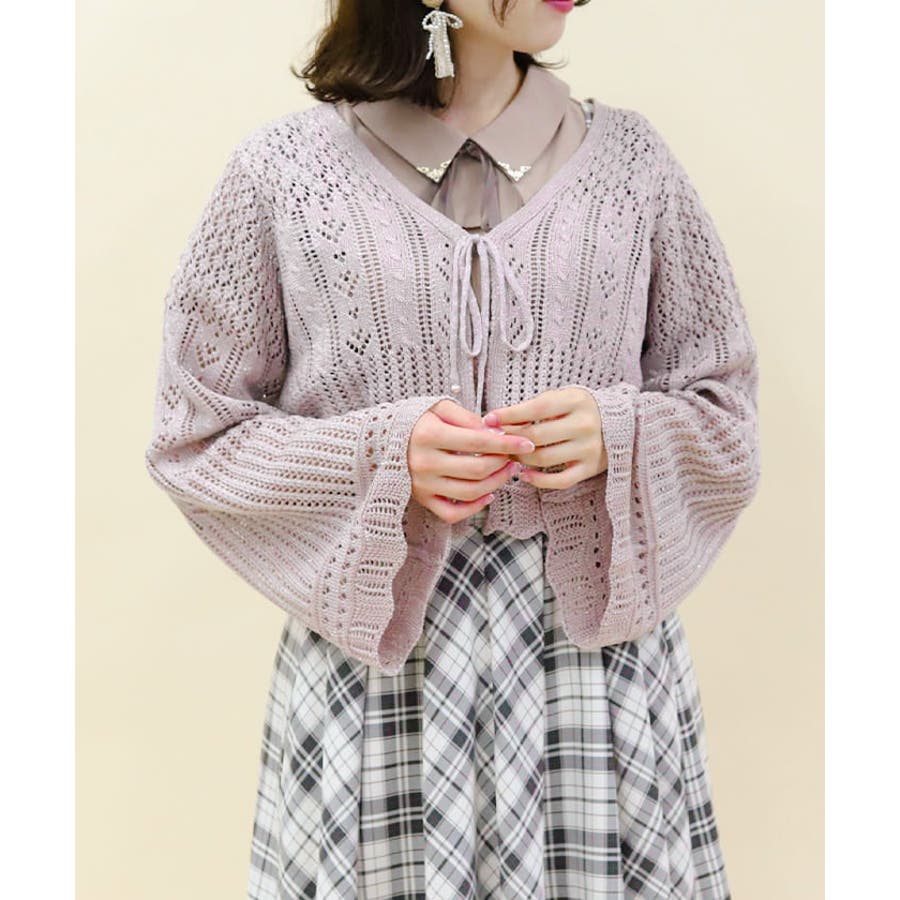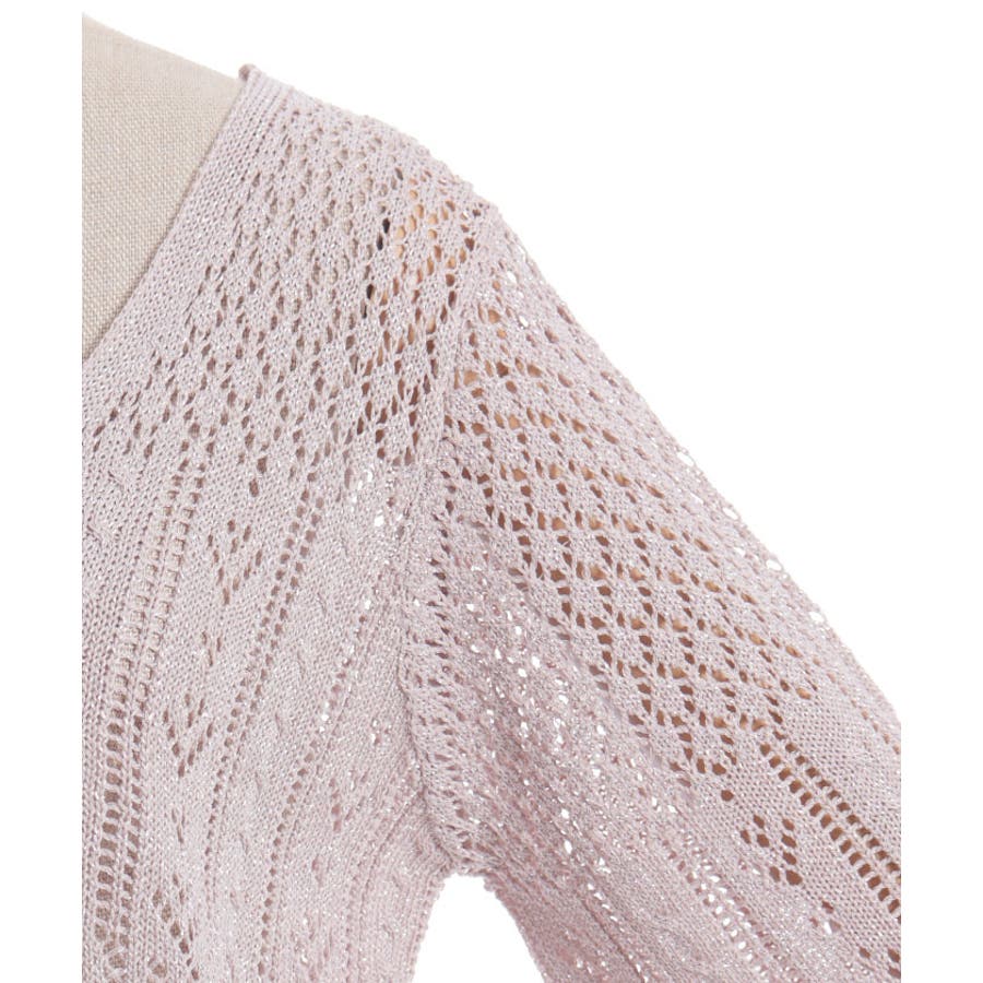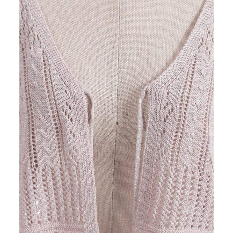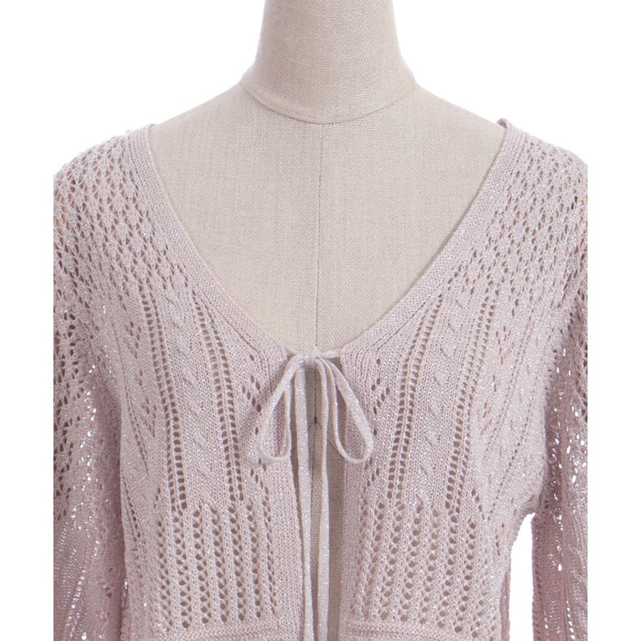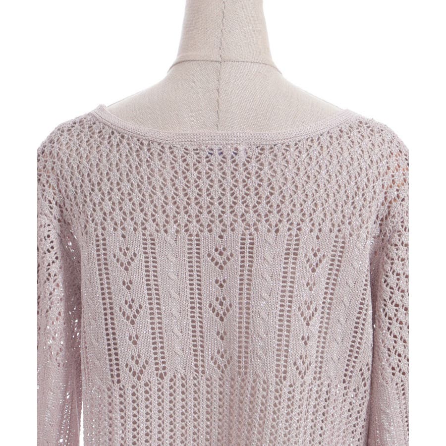 キラキララメがガーリーな透かし編みのカーデです。